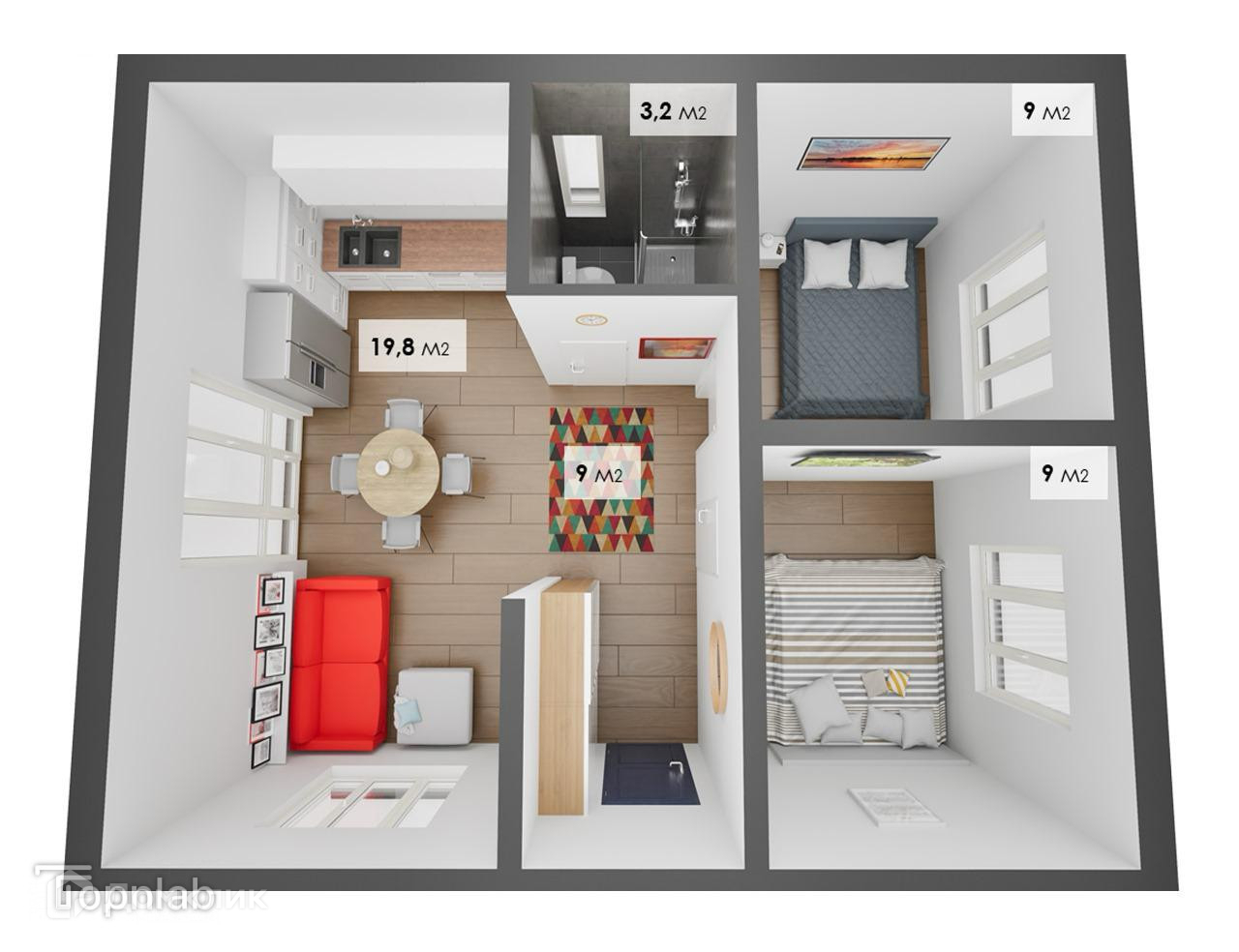 Кухня-гостинная + 2 спальни.