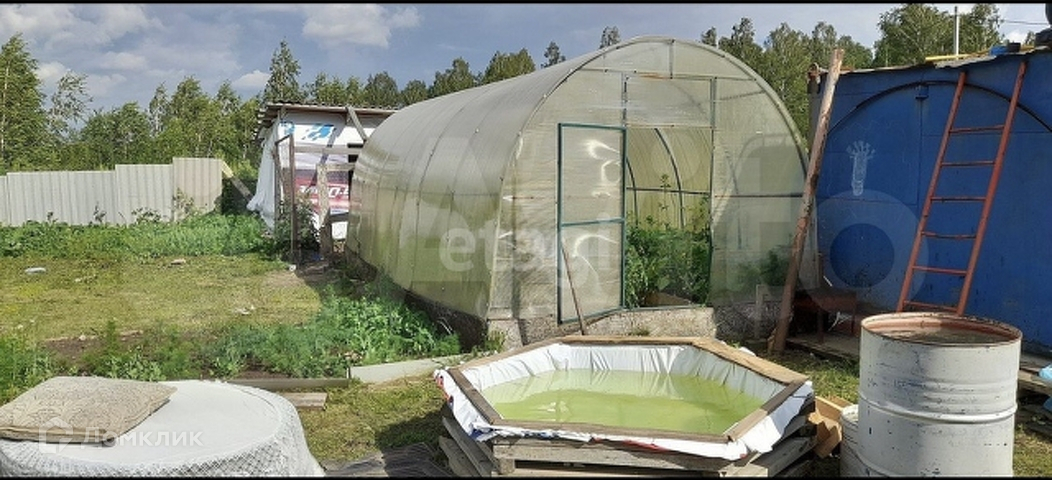 На участке расположены: большая теплица из поликарбоната, курятник, металлическая будка (вагончик).