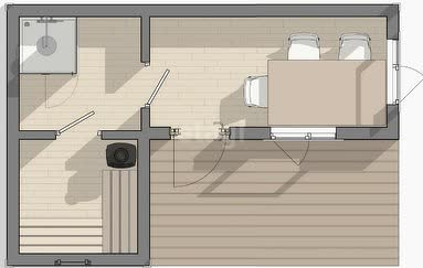 Она включает в себя парную и комнату отдыха. Вход через террасу. Можно использовать как гостевой дом. Отапливать баню можно самой парной или подвесными конвектором, которые включаются в розетку.