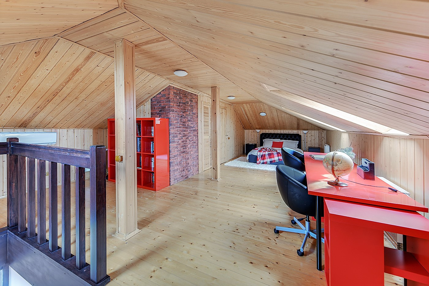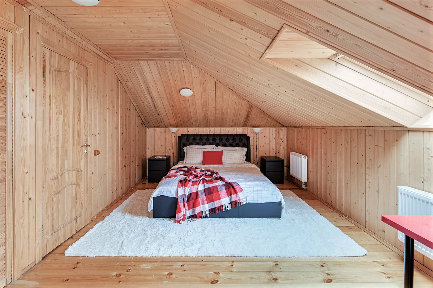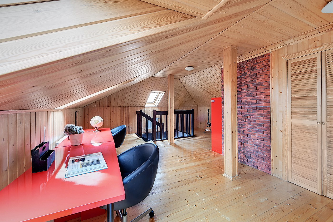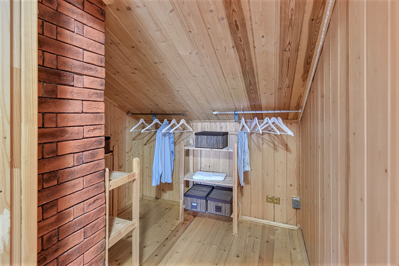 Мансарда единым пространством с гардеробной и санузлом, а также есть пространство под скосами