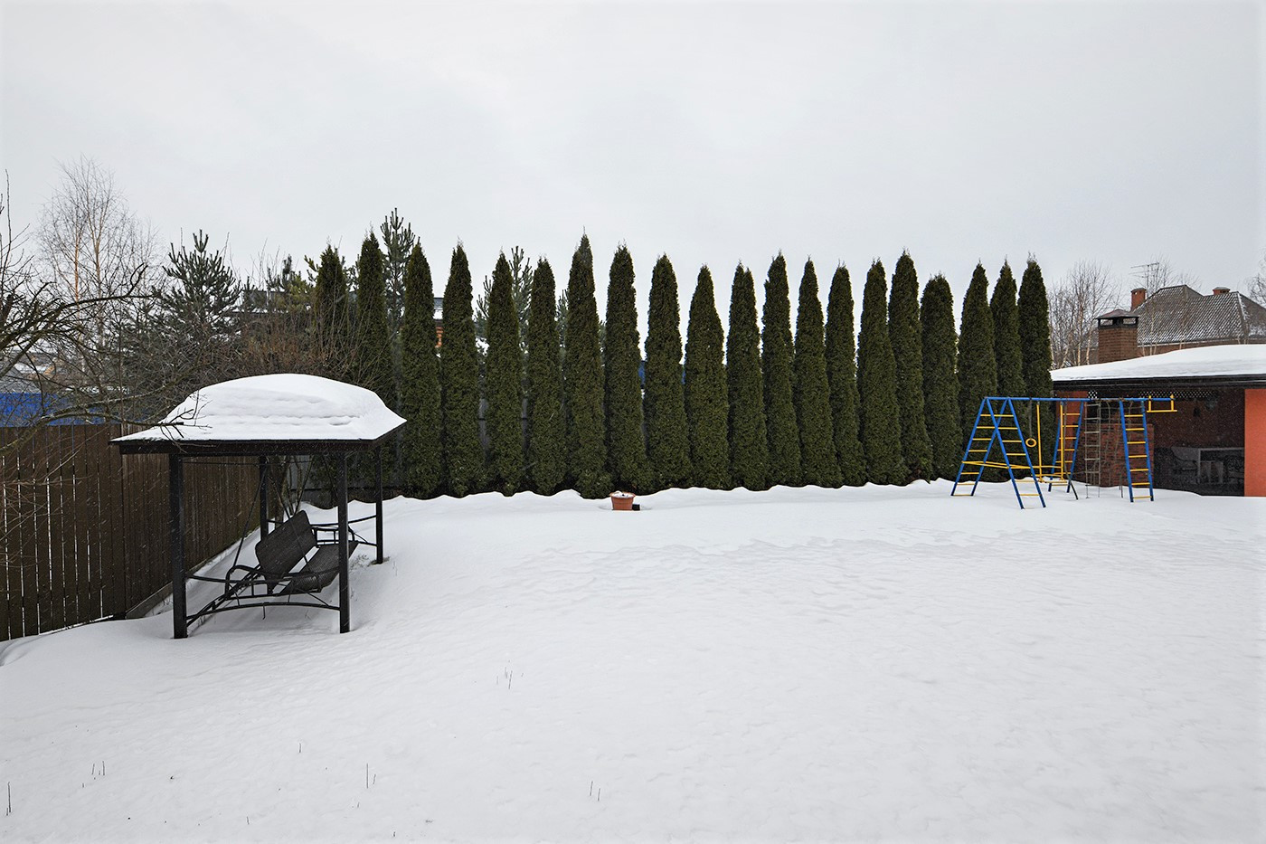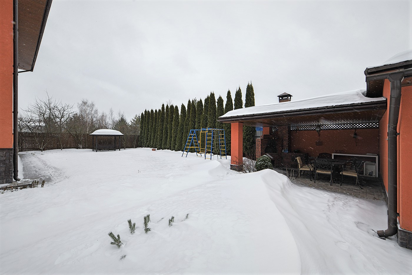 Имеет мангальную зону с садовой мебелью, печью для копчения, местами хранения угля, шампуров, решеток для гриля и прочих принадлежностей для отдыха