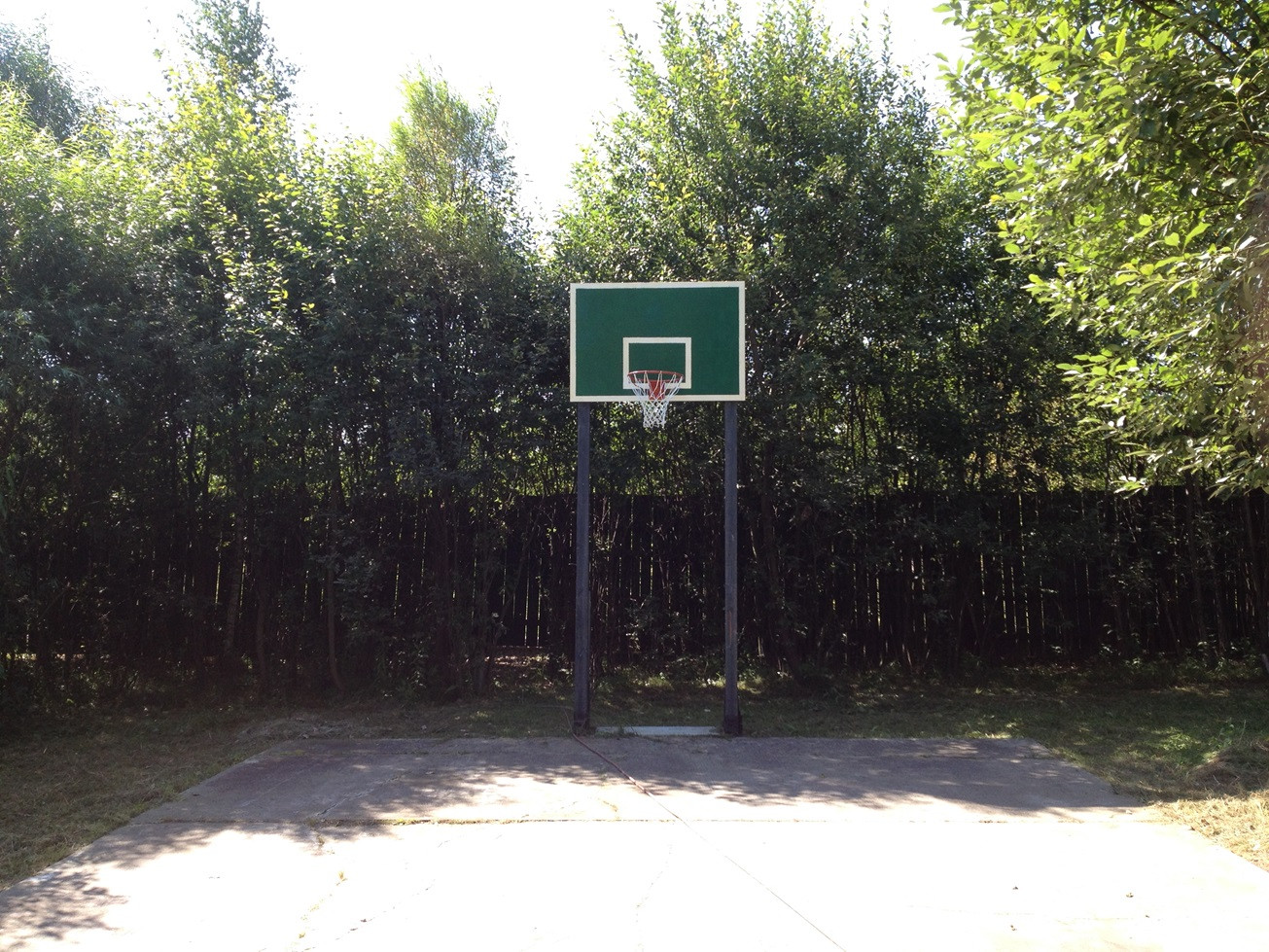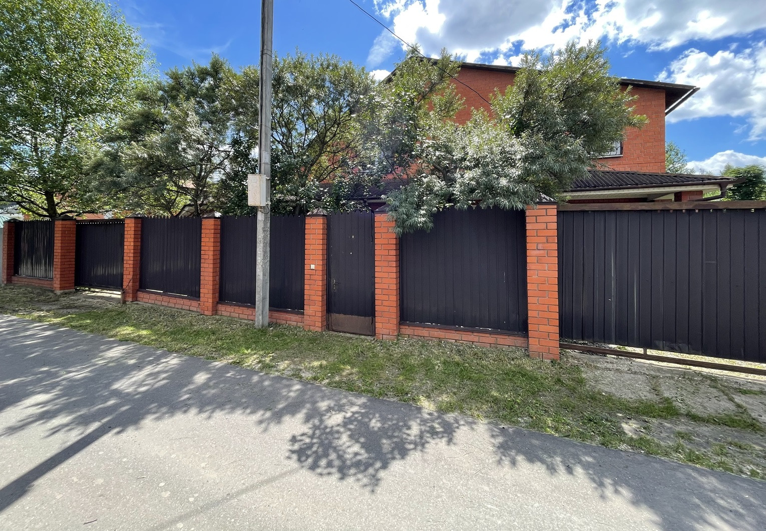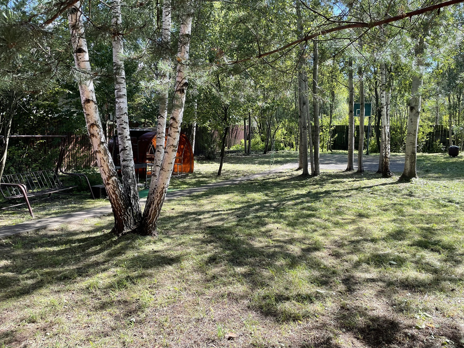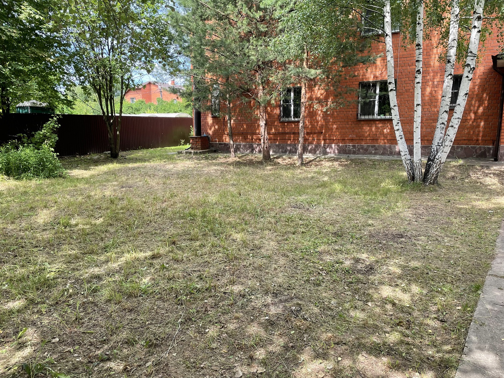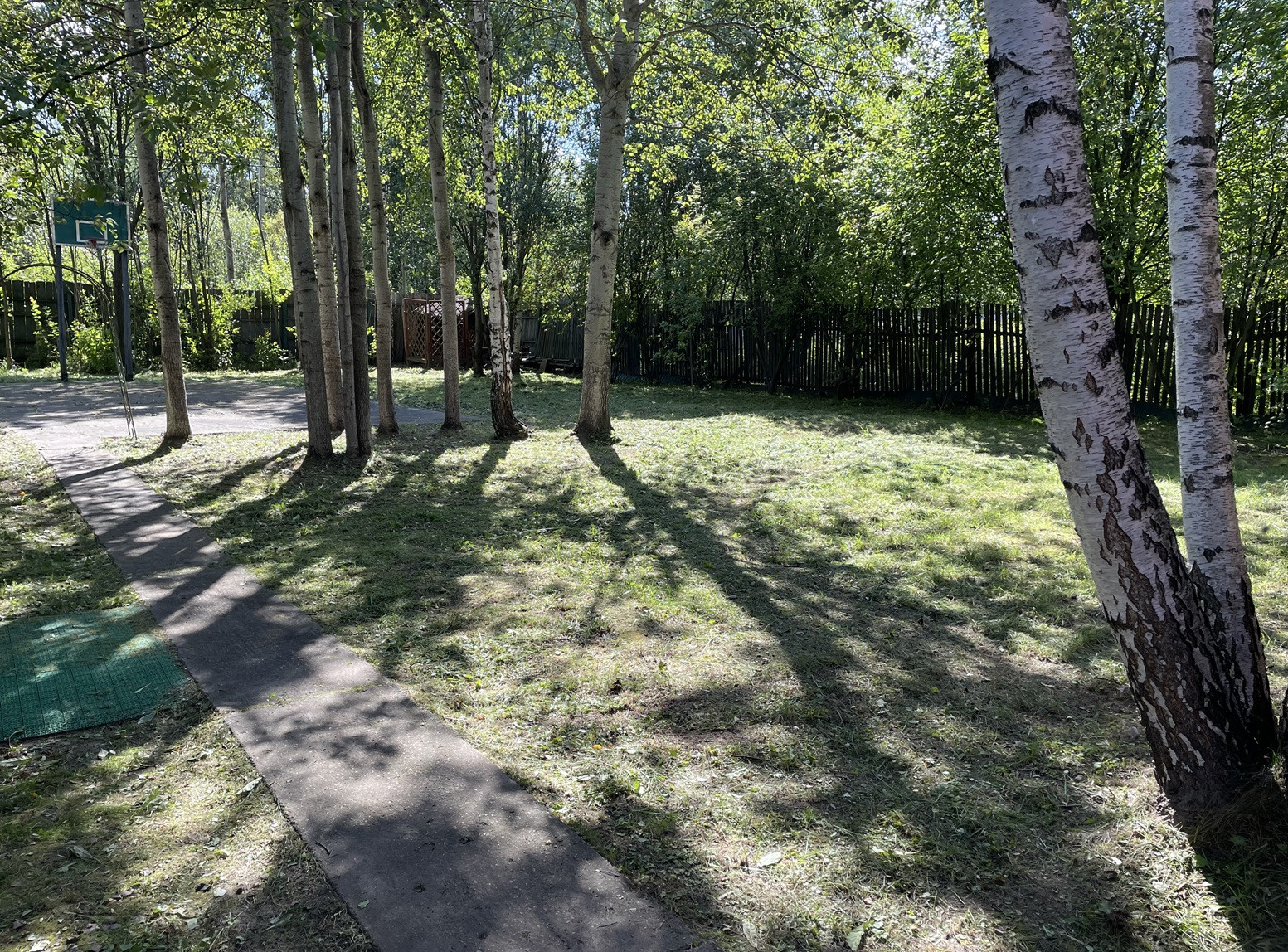 На участке: двое откатных ворот, баскетбольная площадка, беседка, качели, мангал.