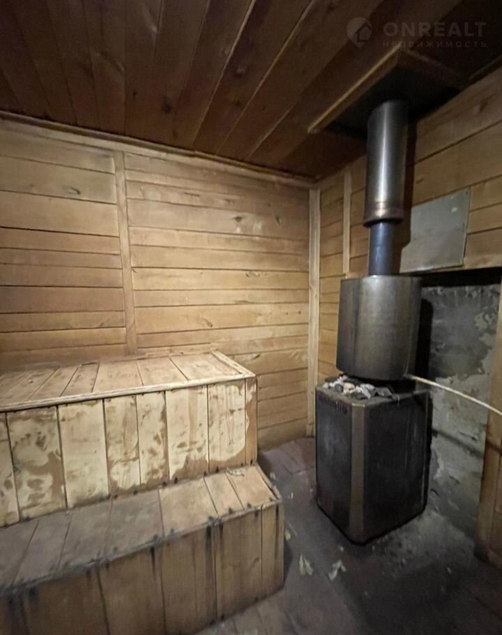 перекрыта металлом. На первом этаже раздевалка, помывочная комната, парилка на дровах. На втором этаже просторная комната отдыха с балконом.