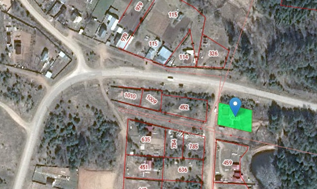 Участок находится рядом с въездом в деревню и отделяется от дороги сосновой лесополосой. На задней части участка протекает речка, а за ней находится сосновый бор.