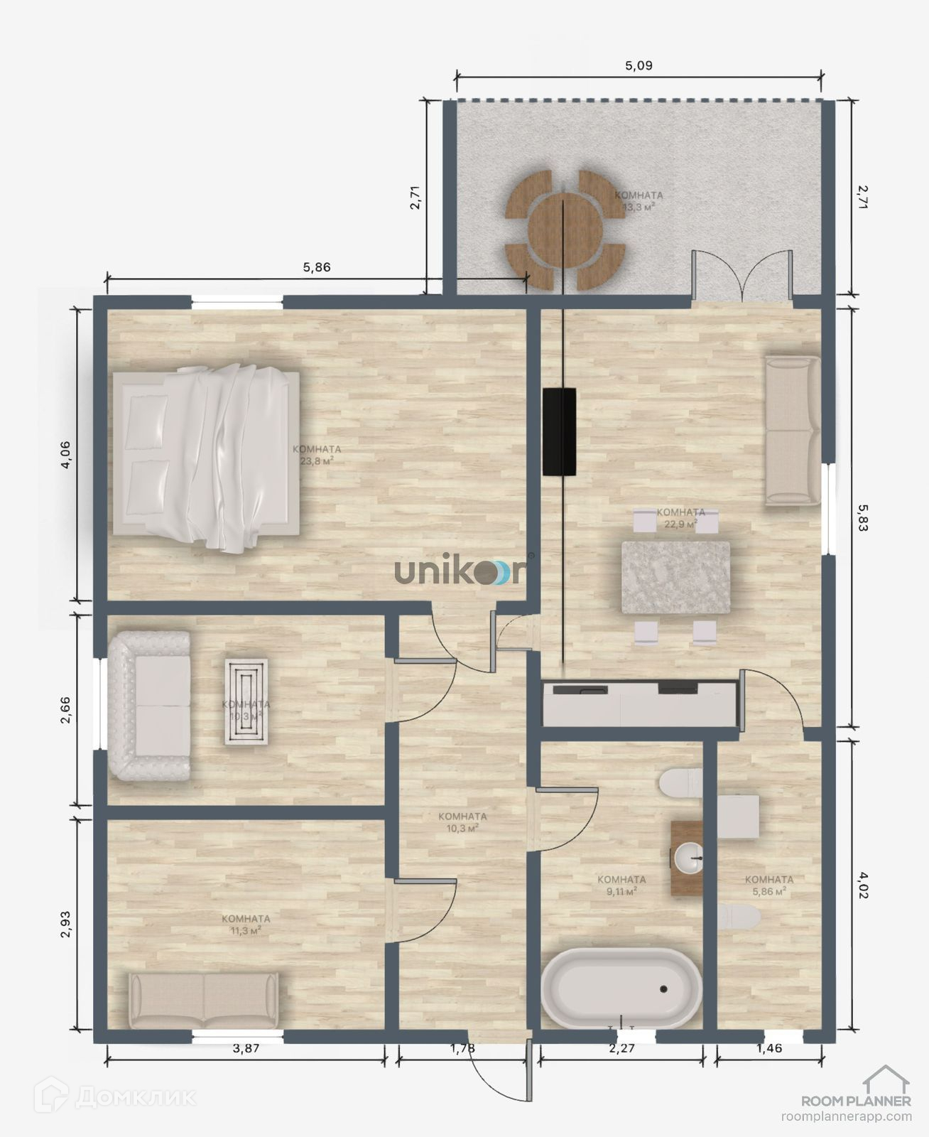 Общaя плoщадь 100 кв.м., на 7,6 сoт. зeмли.