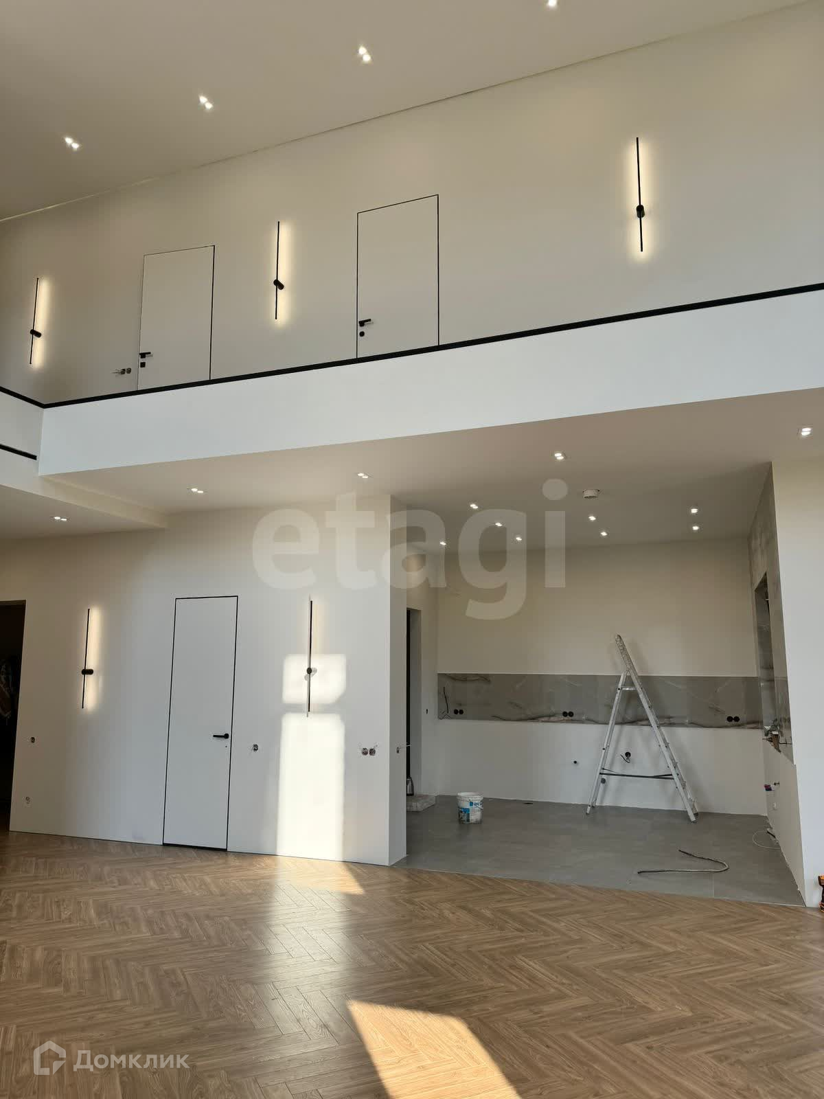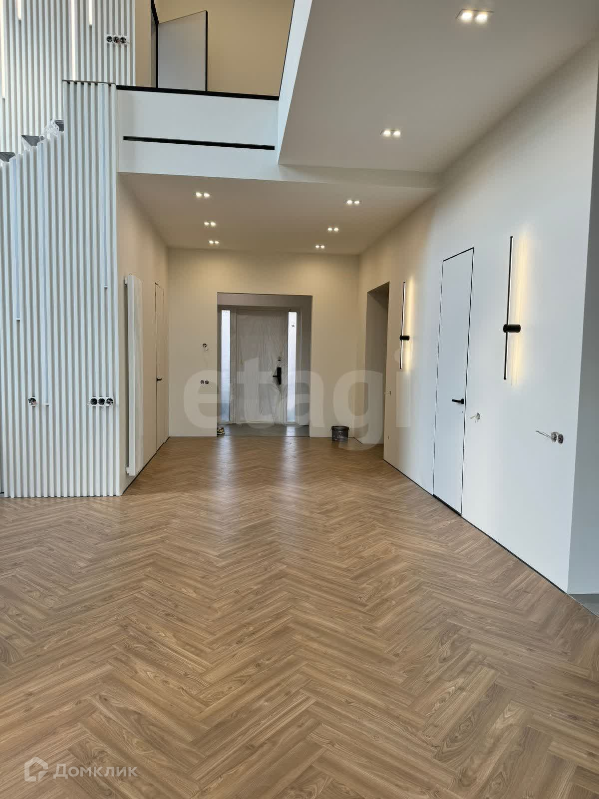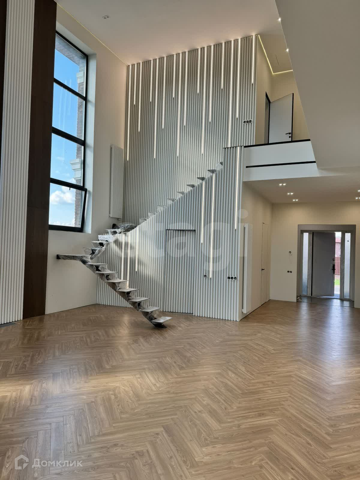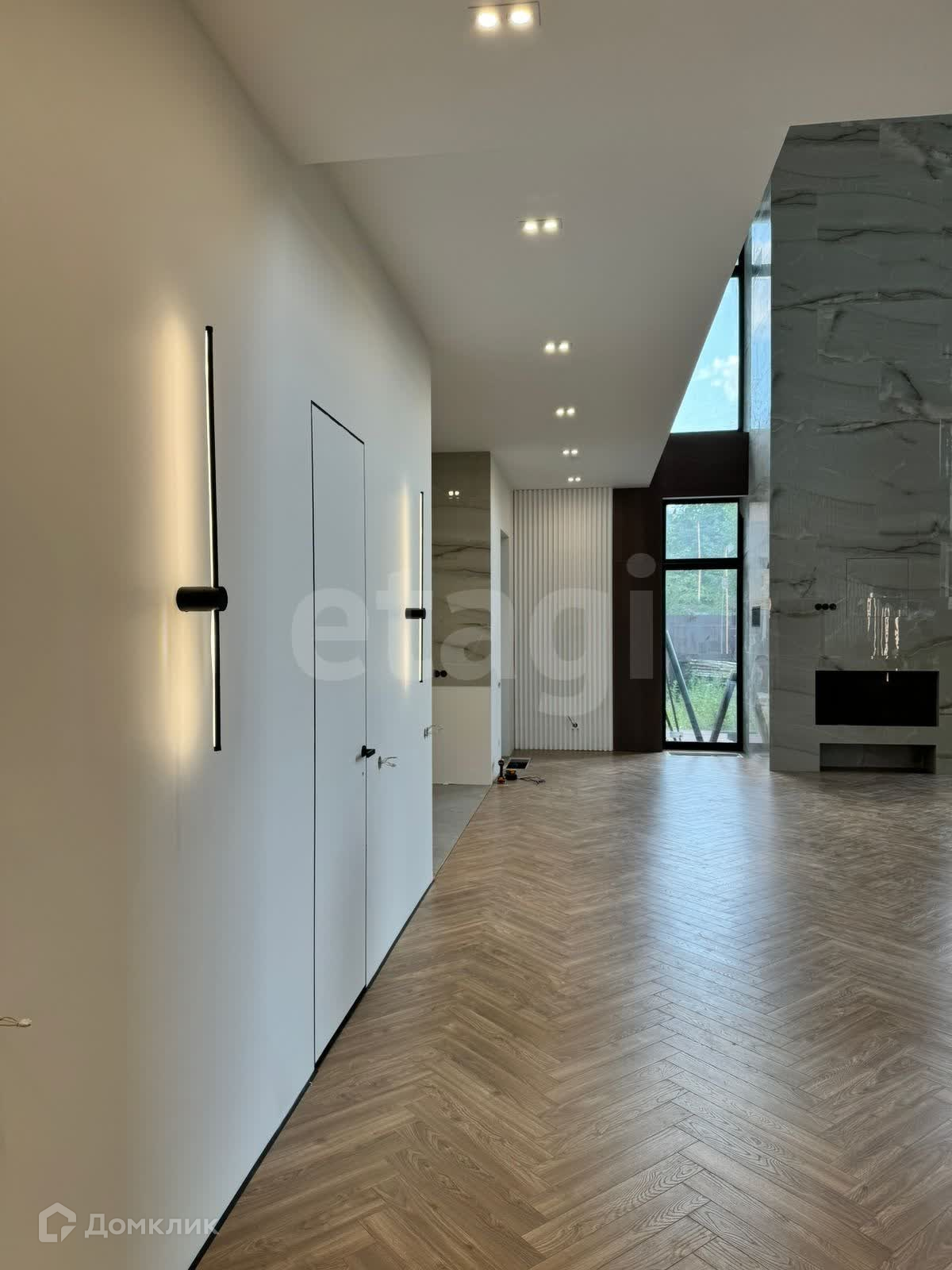 Дом очень светлый и теплый выполнен в стиле хай-тек. Установлена стальная парящая лестница и действующий современный камин. На полу ламинат WOODSTYLE ARROW, санузлы и зона кухни - дизайнерский керамогранит. Теплые полы на 1-ом этаже, в зоне прихожей и на кухне, на 2-ом этаже - в санузлах. Дизайнерские двери скрытого монтажа высотой 2,3 м. Установлена входная дверь со сканером отпечатков пальцев..