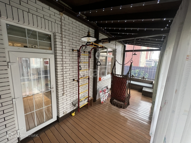 Терраса закрыта мягкими стеклами, есть мебель из ротанга+качели.