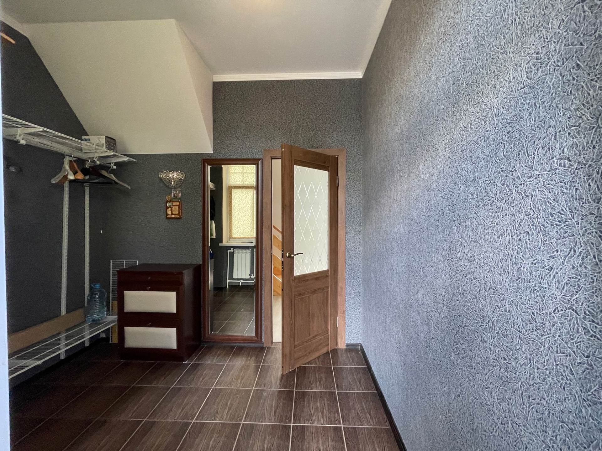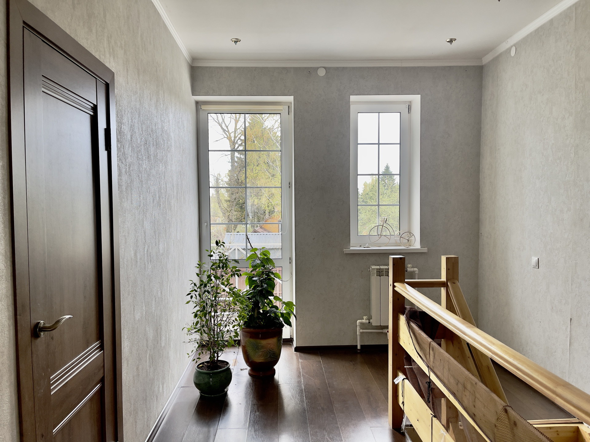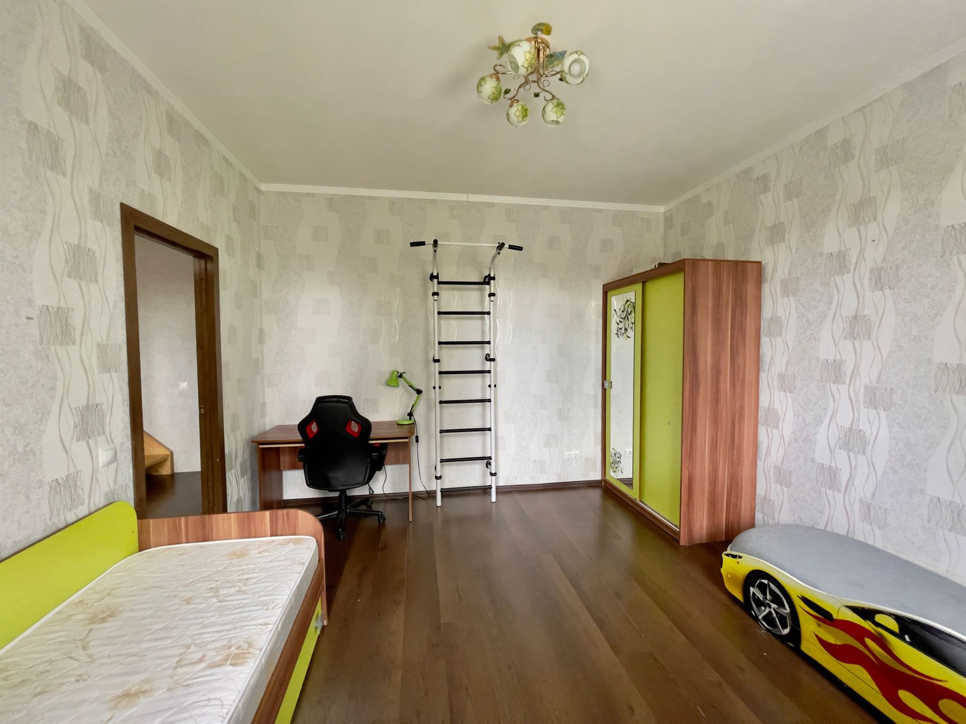 -планировка: на   первом этаже прихожая, кухня-гостиная с дровяным камином, санузел, на втором этаже две спальни и санузел с окном, на  мансардном этаже свободное пространство, использовалось для спорта и игр (шест, который виден на фото, можно убрать, он не подпирает потолок))