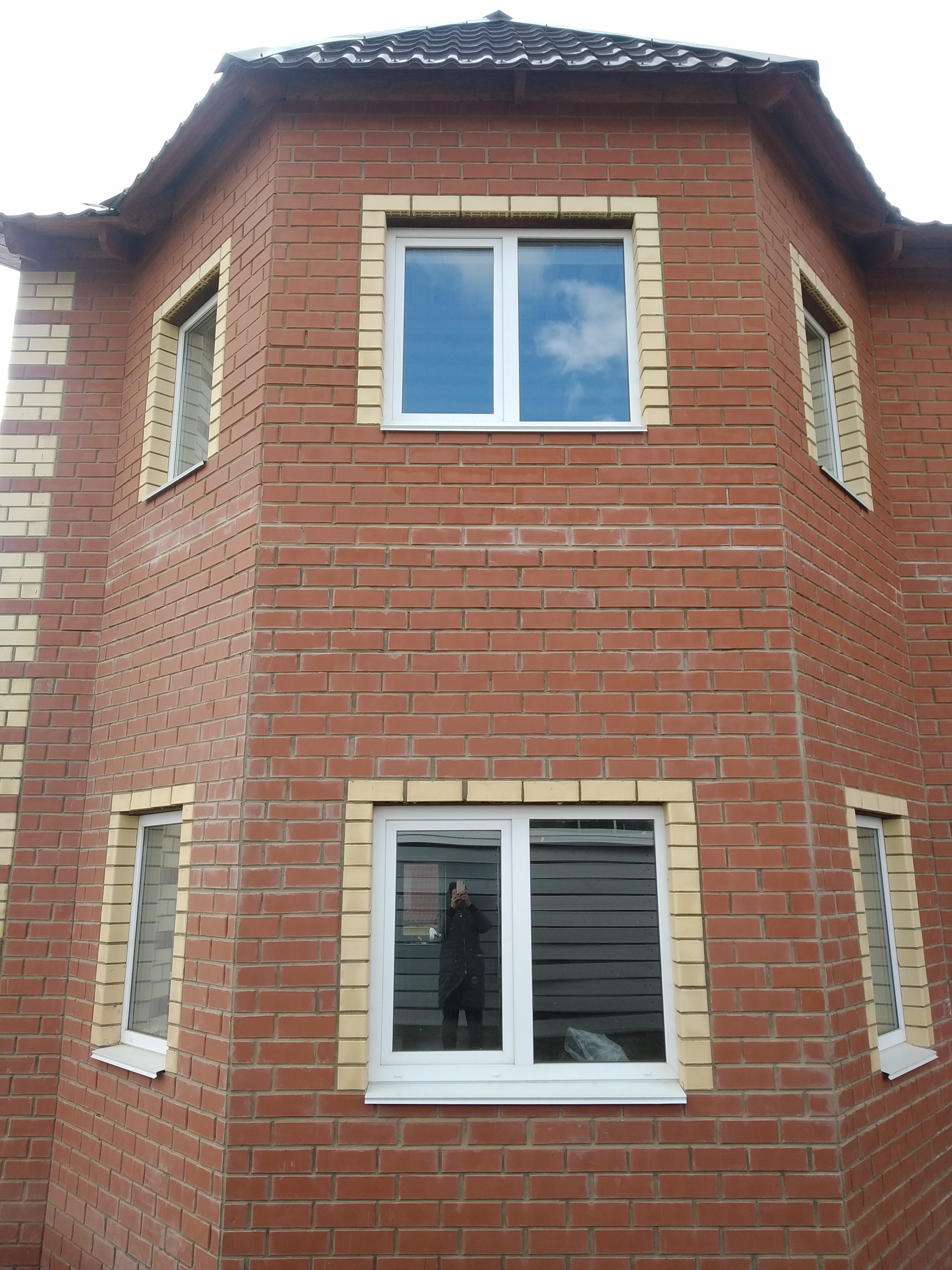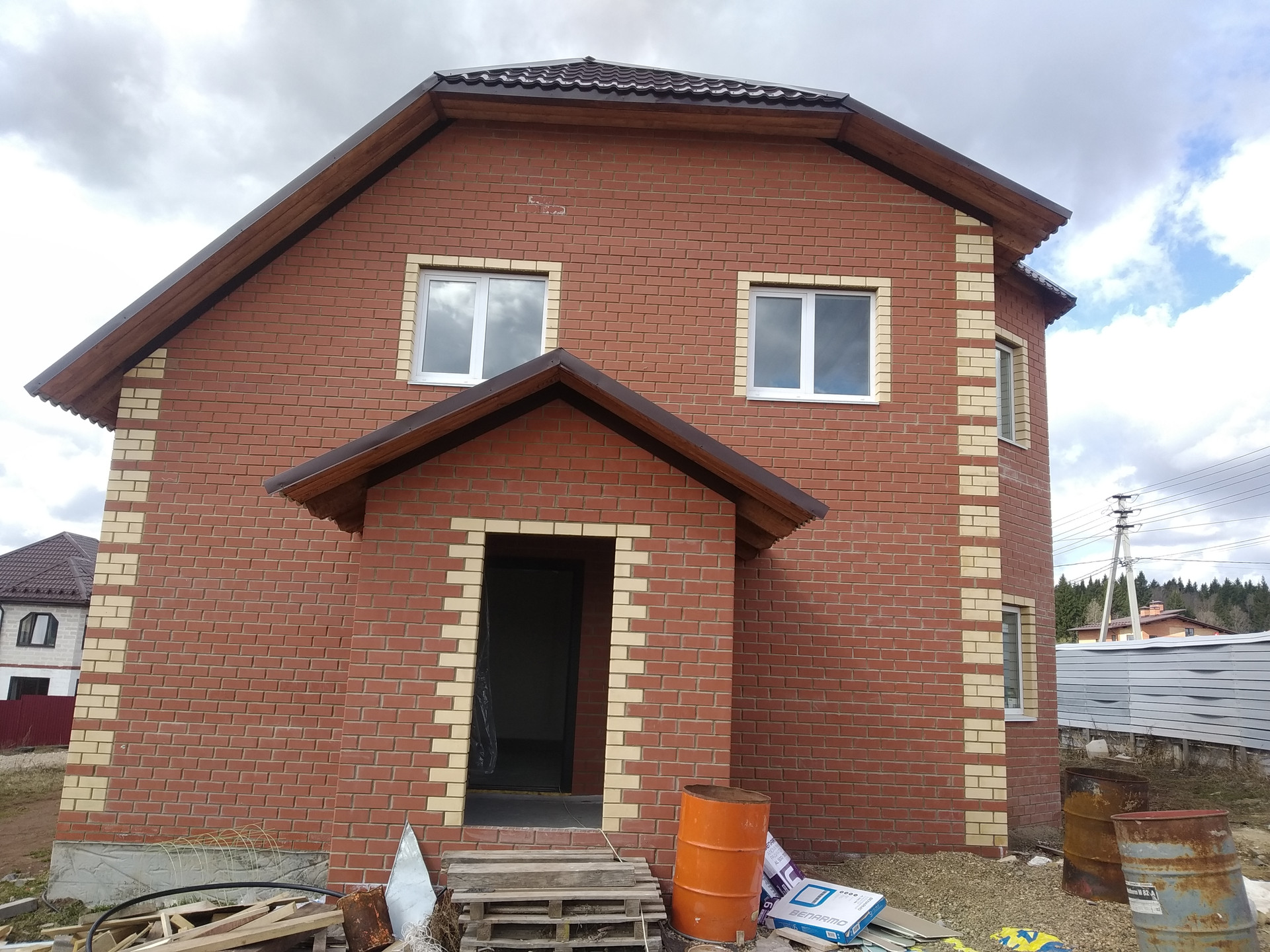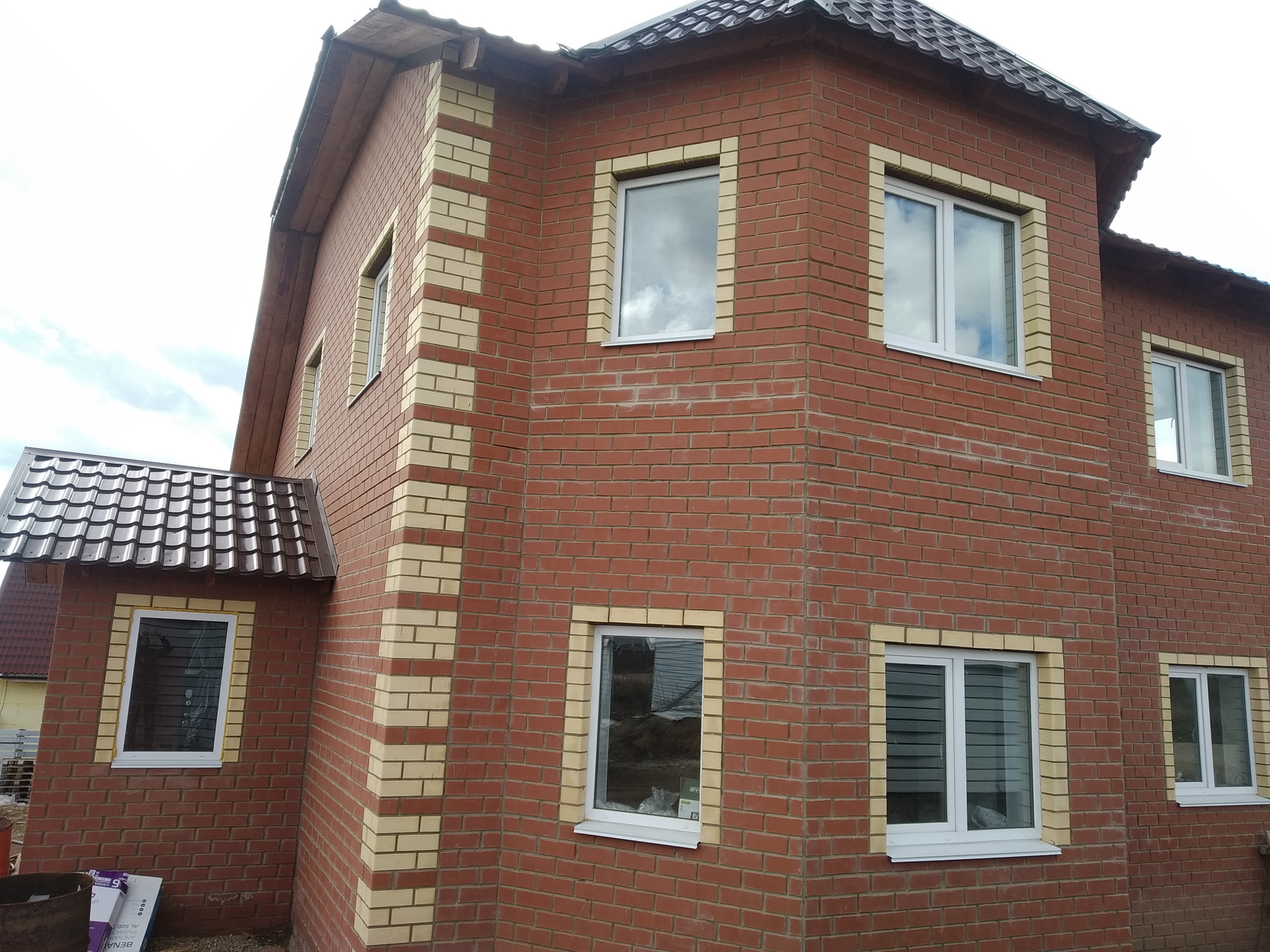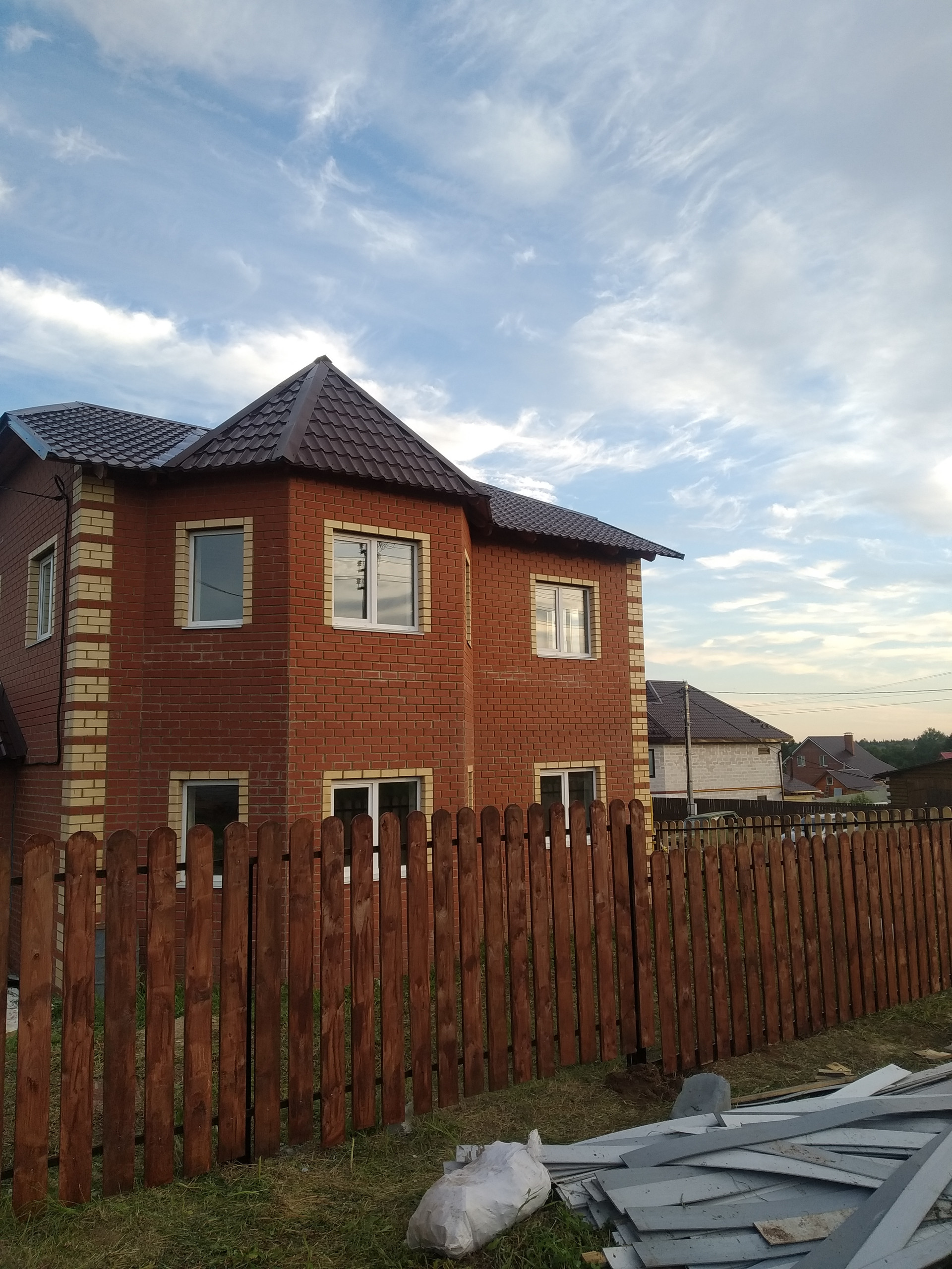Красивый большой дом на светлой просторной улице. Построен из газоблоков , облицован кирпичом. Участок хорошо проветривается и освещается солнцем. Место возвышенное, красивые виды. Дорога с 2х сторон. Можно организовать 2 въезда. Коммуникации все есть: электричество 380 W, скважина-35м ,  вода заведена в дом, автономная канализация( выведена в колодец). Газ заведен, установлен газовый котел, вмонтированы теплые полы на 1 этаже и установлены батареи, на 2 эт.- батареи. 1-й этаж : огромный зал с кухней столовой, комната, санузел ( унитаз установлен),  котельная , кабинет  . 2-й эт - 3 комнаты и санузел. Все перегородки установлены с применением шумоизоляционных материалов, дверей пока нет. Крыльцо оштукатурено.