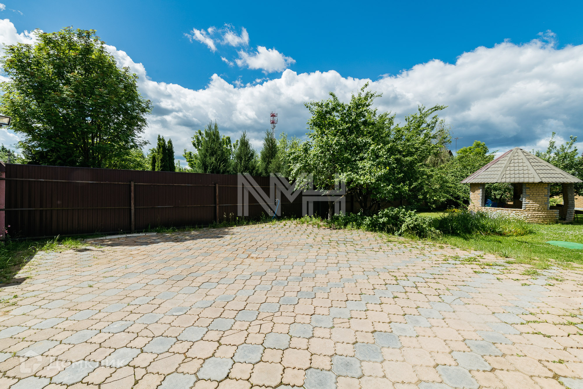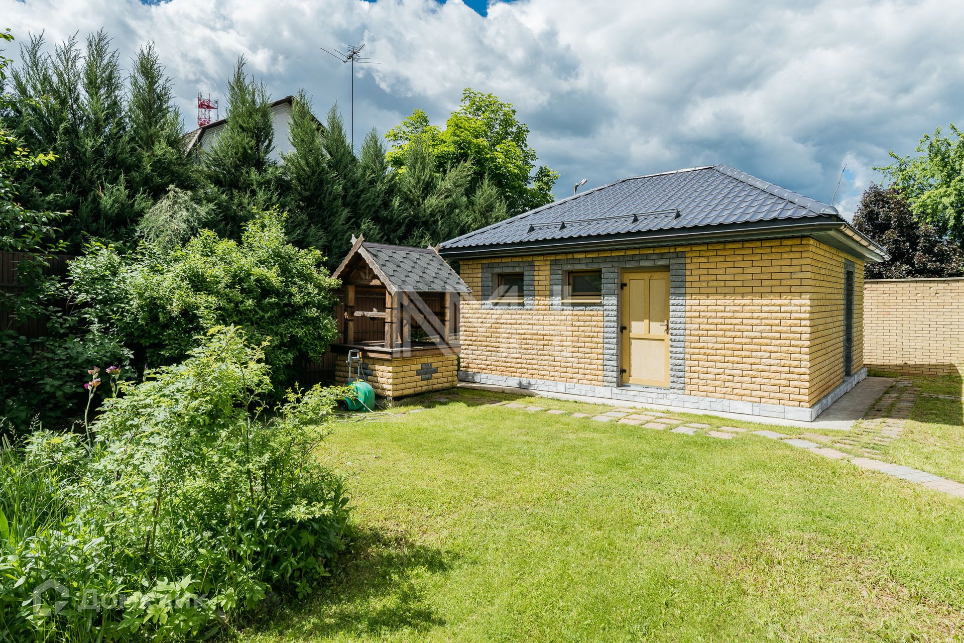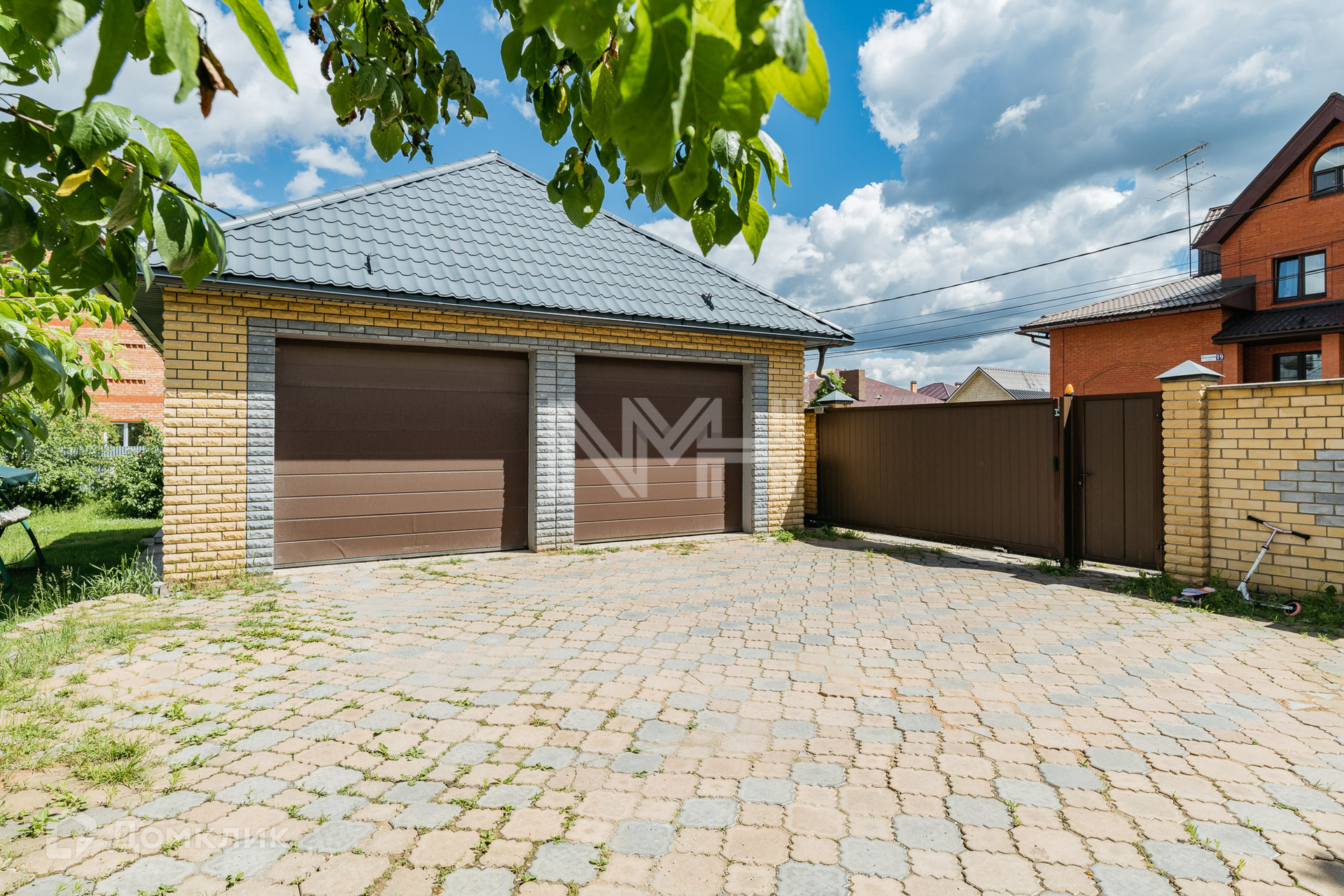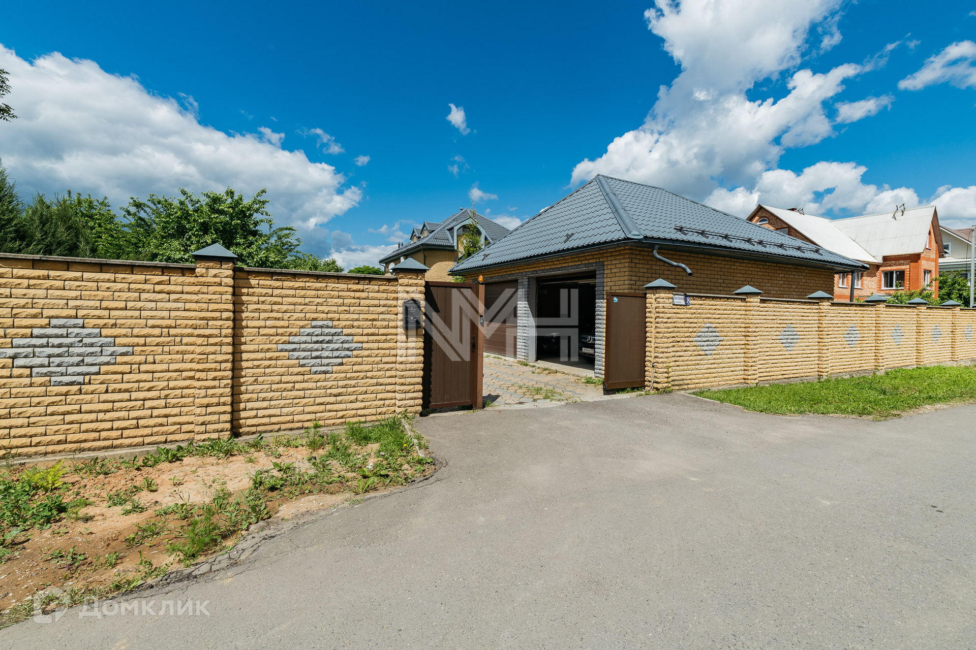 На участке расположен гараж на 2 автомобиля, автоматические ворота, оборудованы 2 парковочных места для автомобилей, беседка, хозяйственный блок на 80 кв м с подведенными коммуникациями (возможно переоборудование под сауну или блок для персонала). Участок имеет 2 въезда.