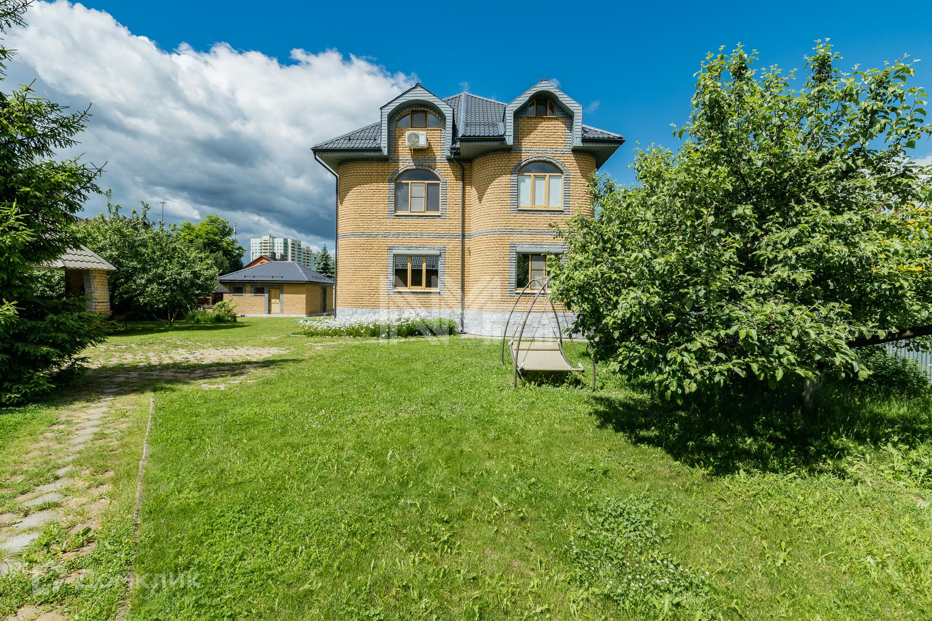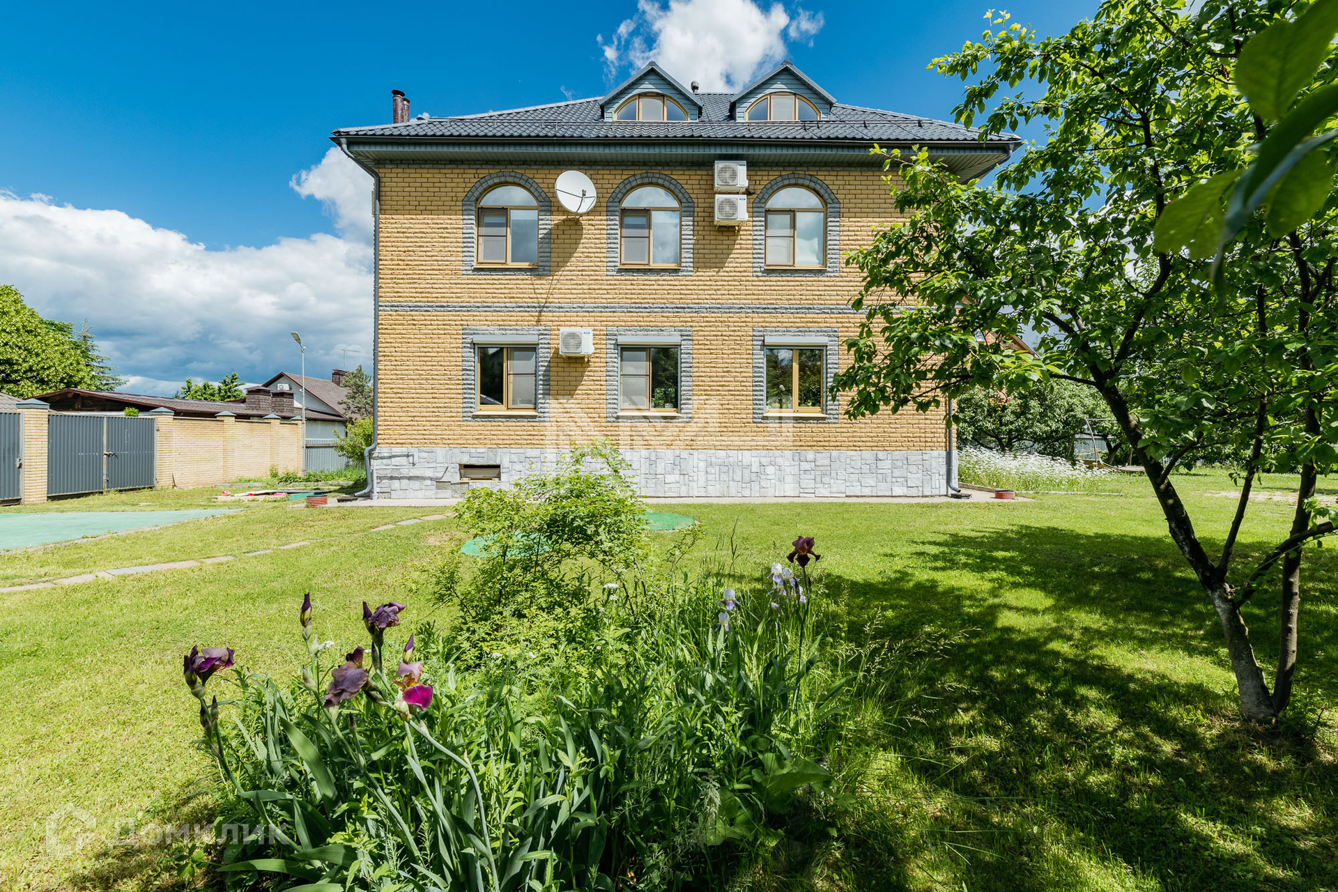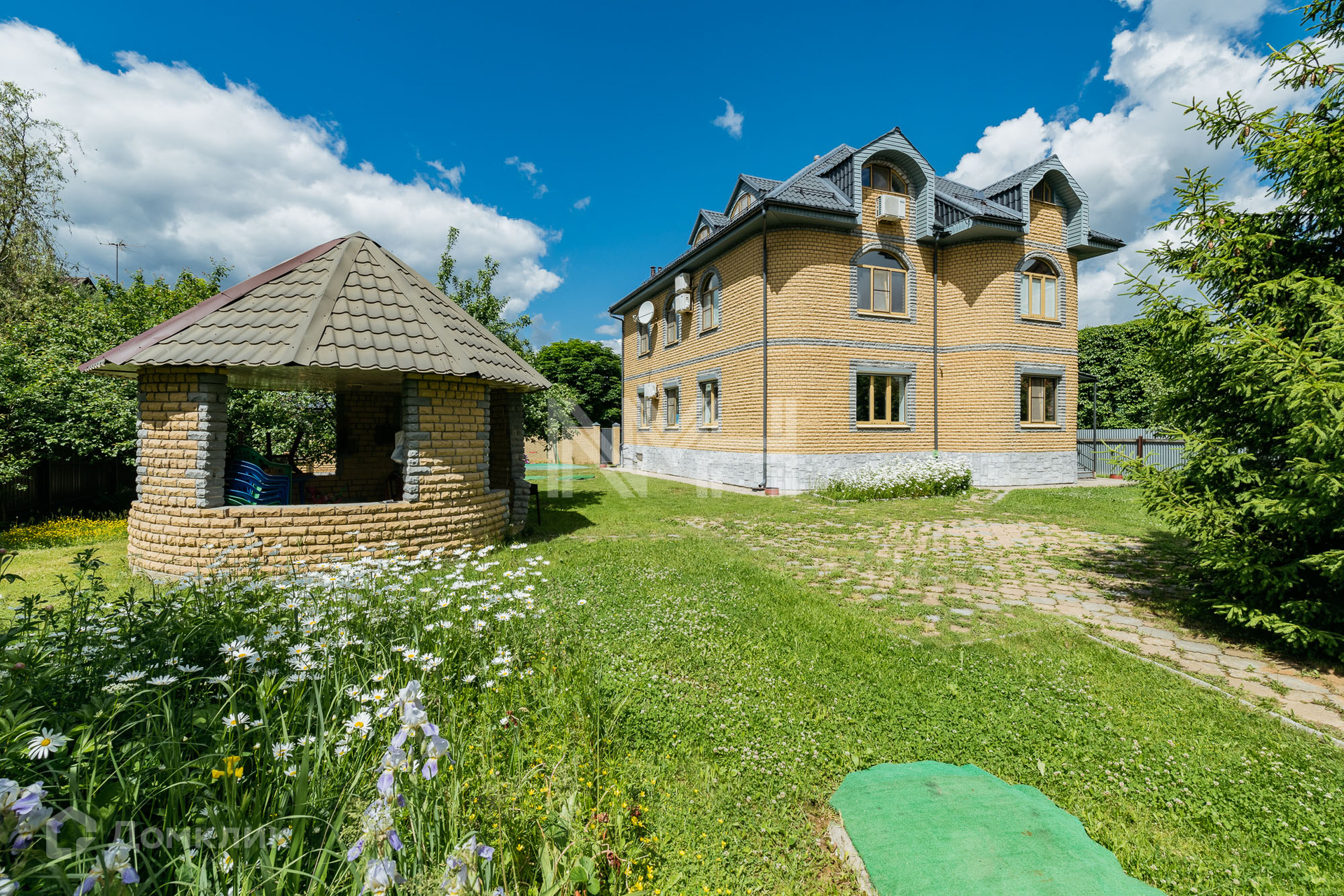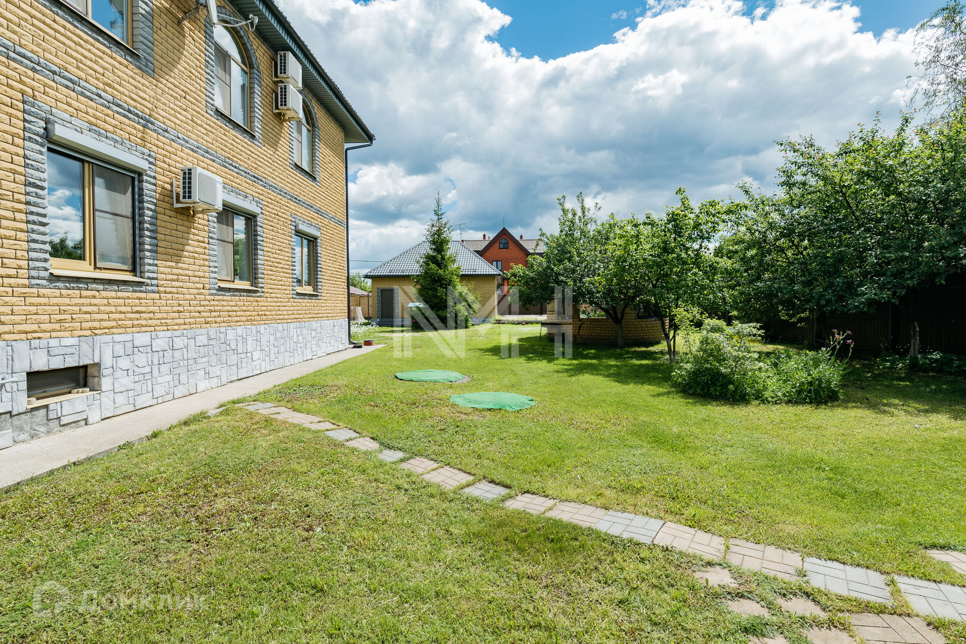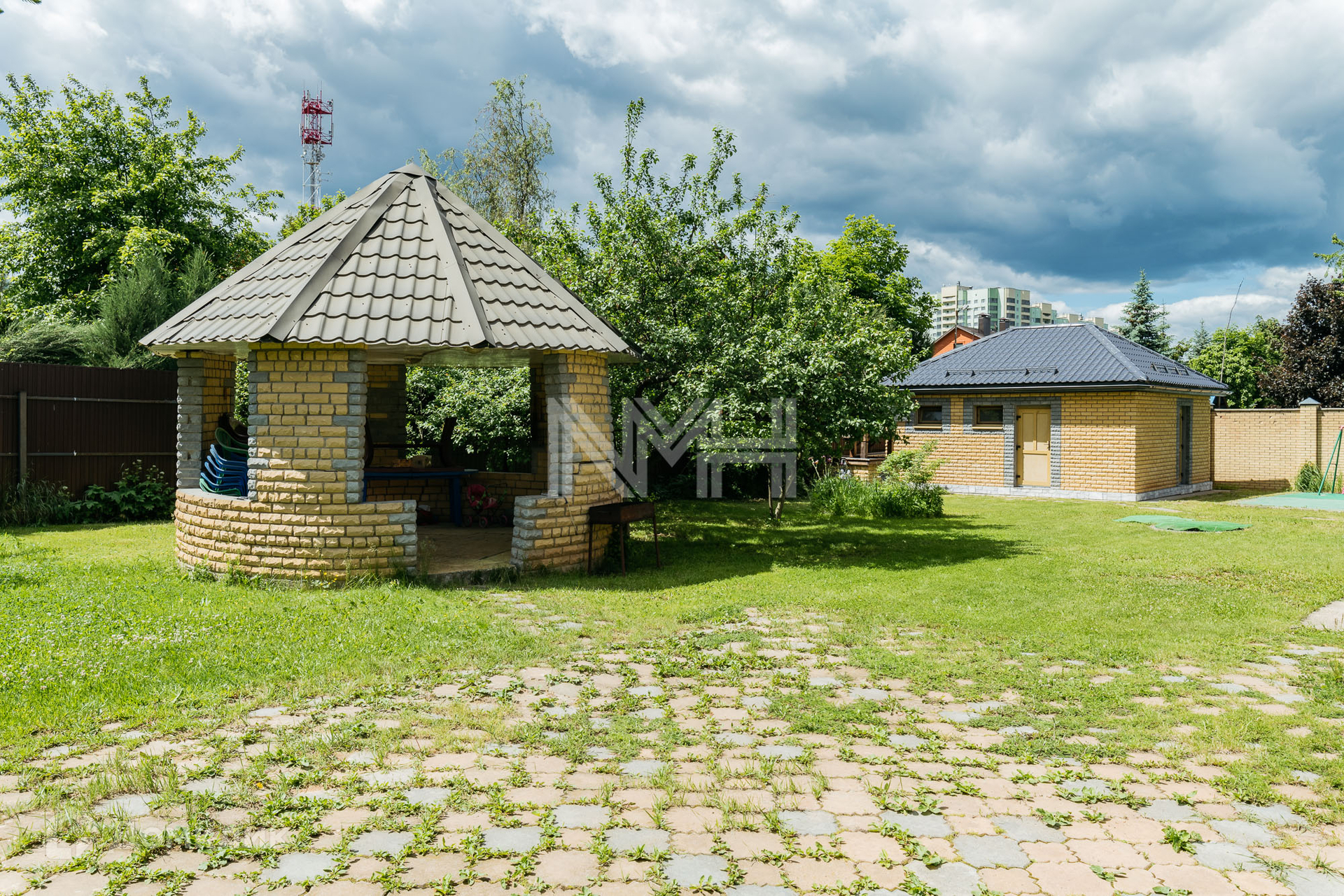 На участке расположен гараж на 2 автомобиля, автоматические ворота, оборудованы 2 парковочных места для автомобилей, беседка, хозяйственный блок на 80 кв м с подведенными коммуникациями (возможно переоборудование под сауну или блок для персонала). Участок имеет 2 въезда.
