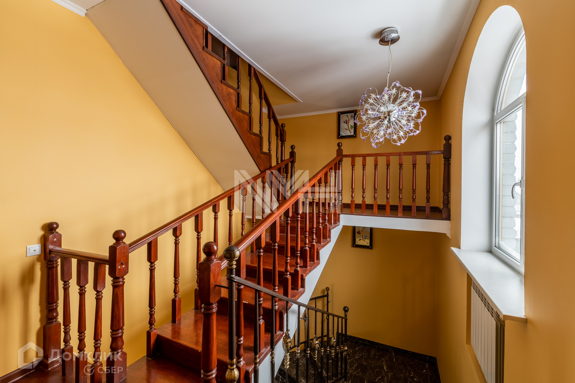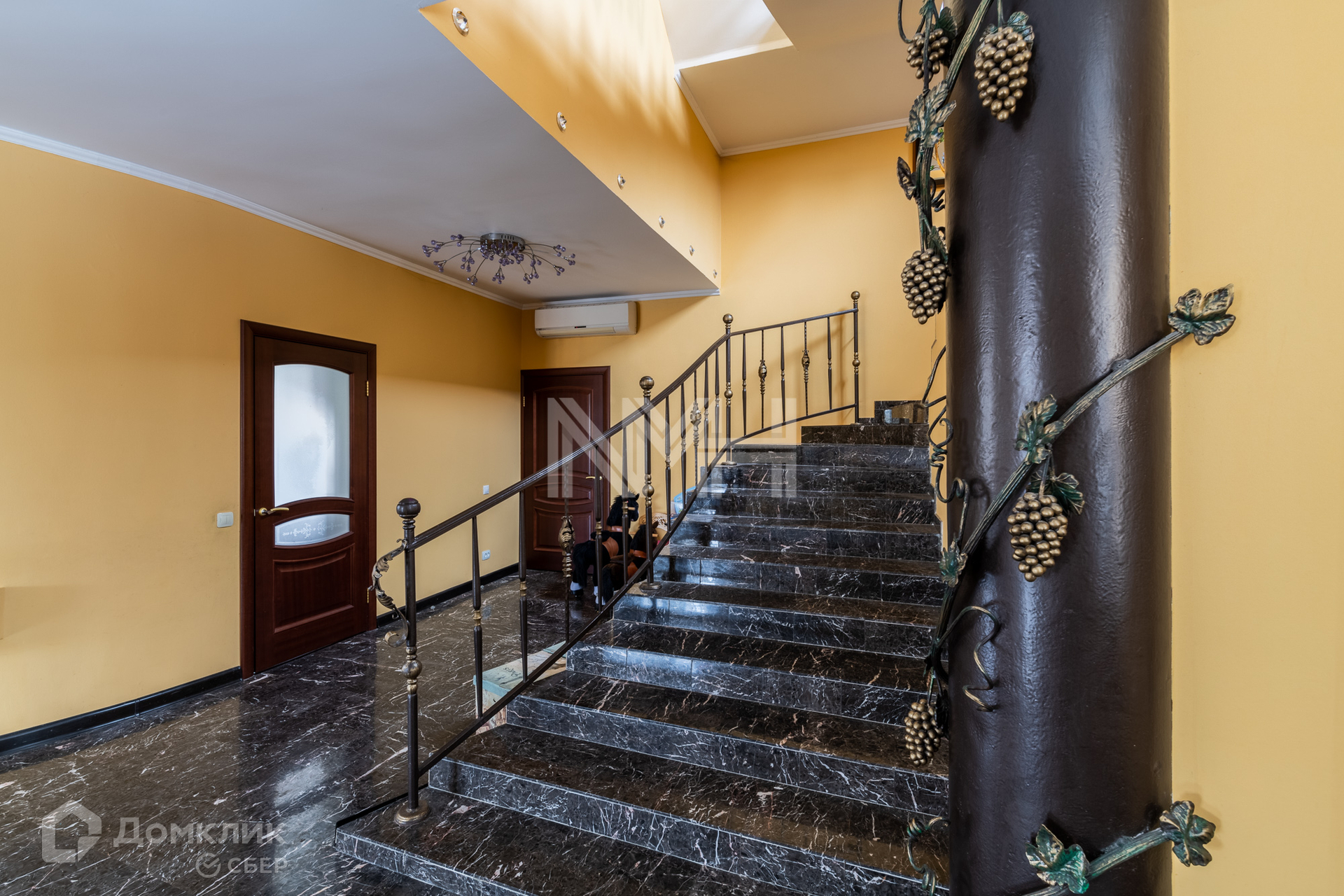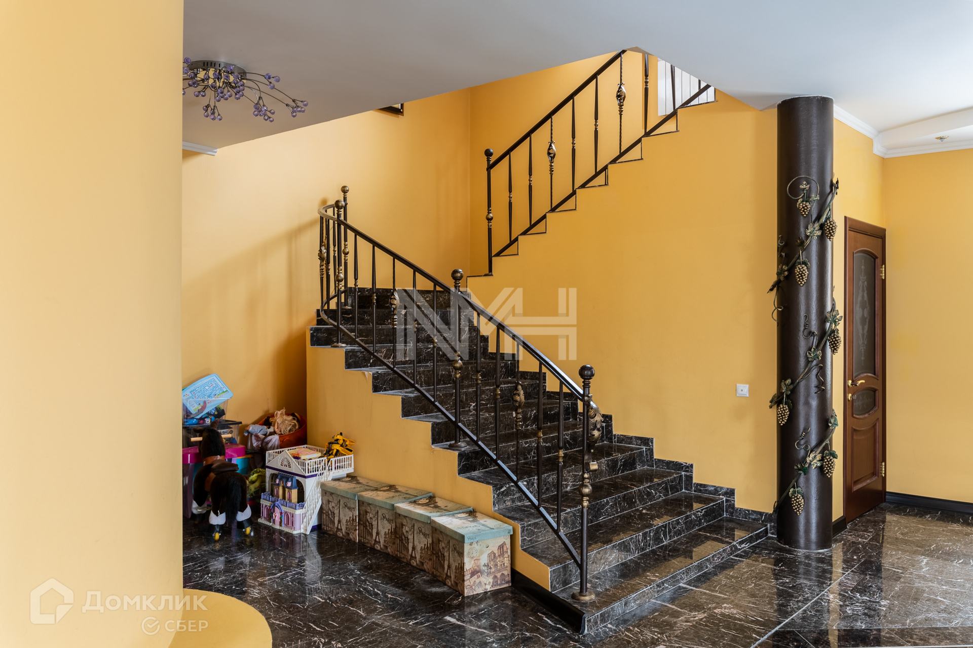 На первом этаже: кухня, гостиная, санузел, гардеробная, холл, монолитная лестница с коваными перилами.