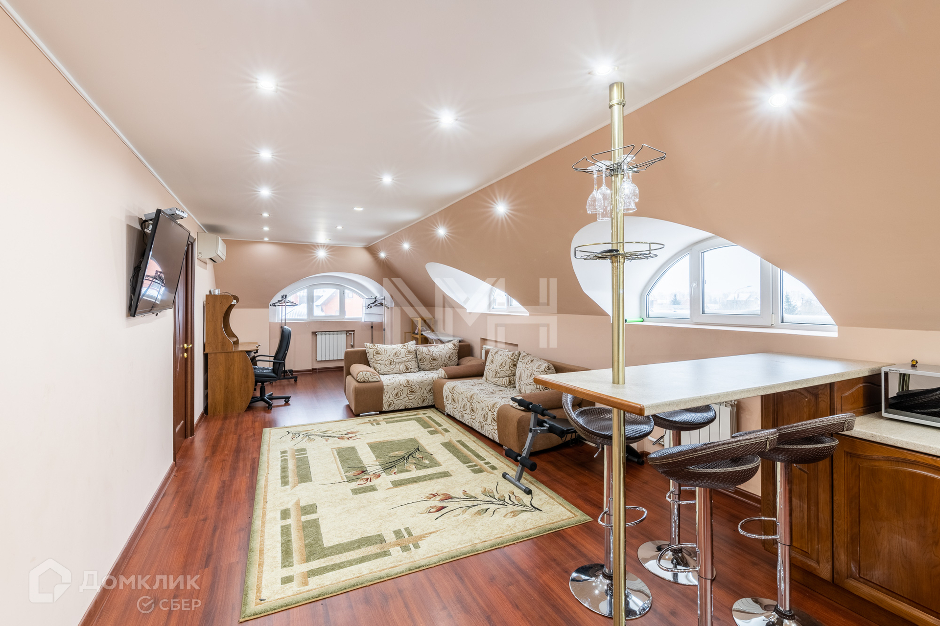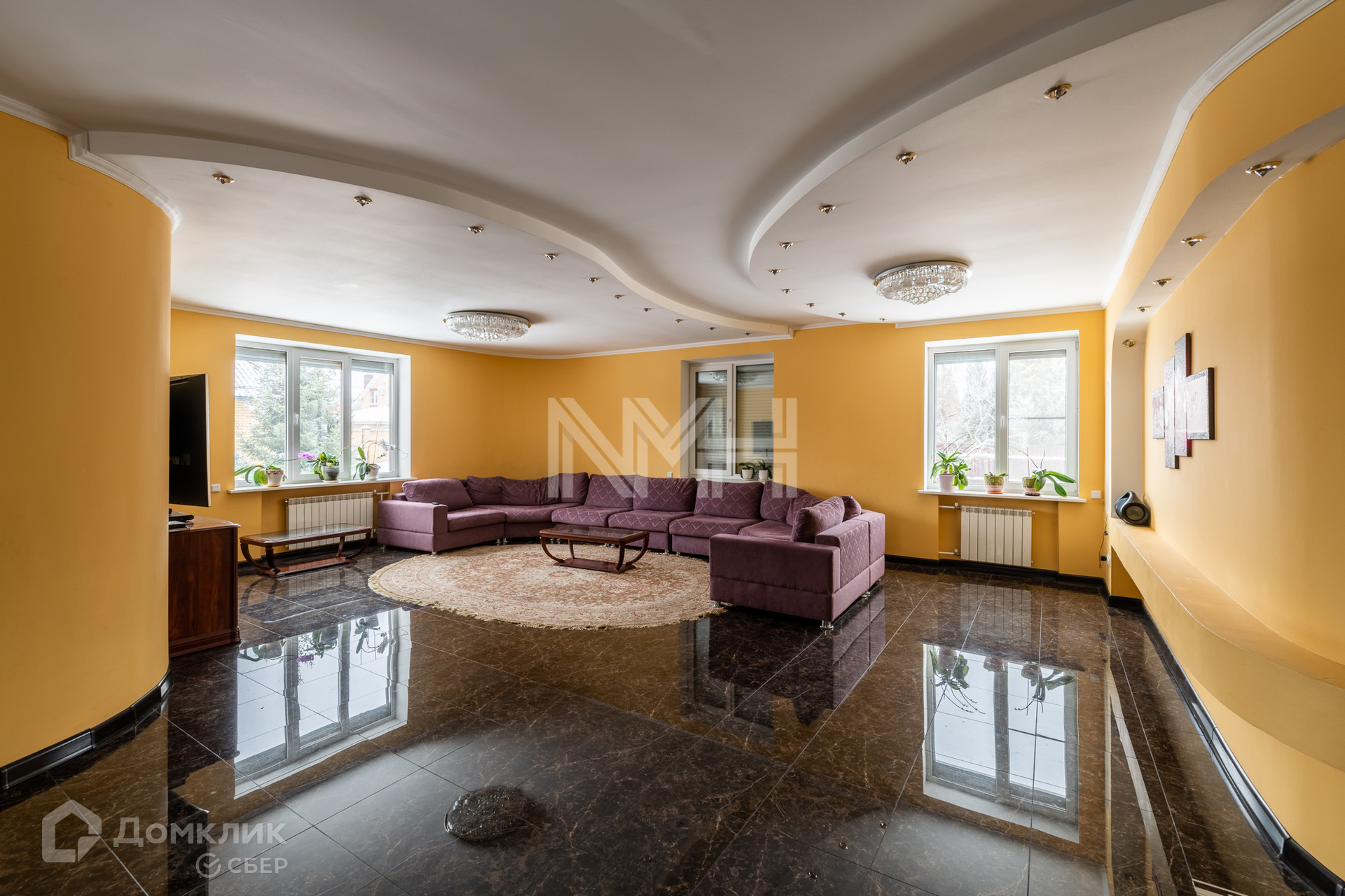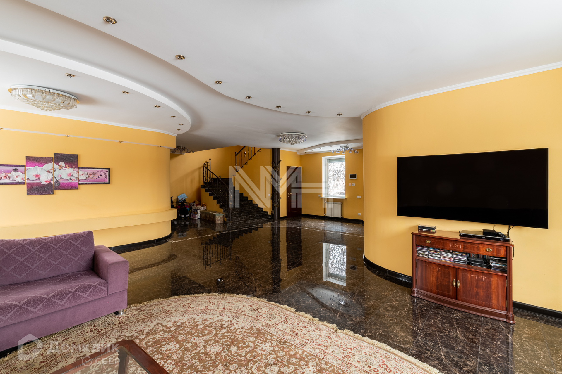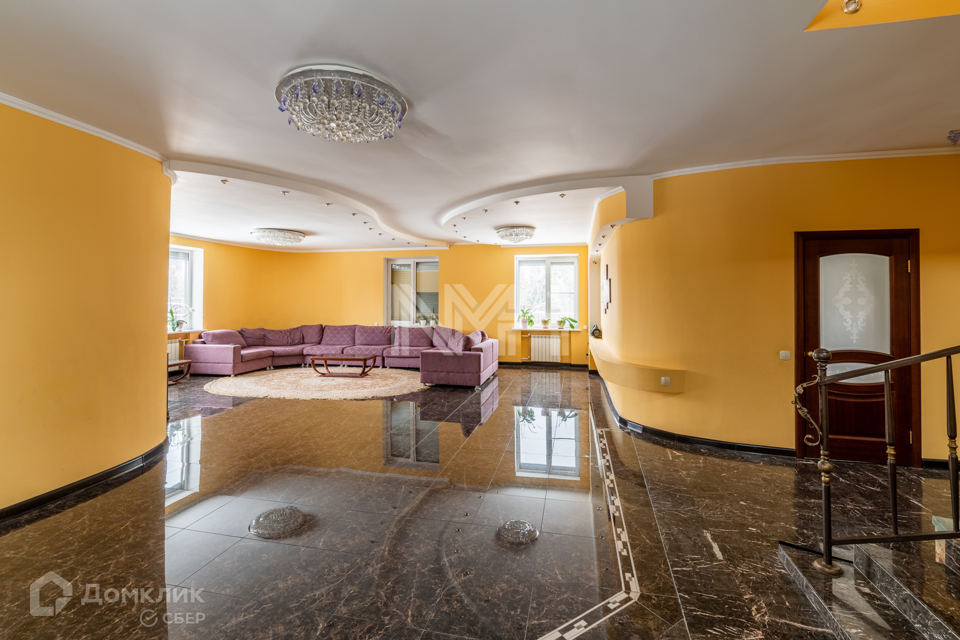 На первом этаже: кухня, гостиная, санузел, гардеробная, холл, монолитная лестница с коваными перилами.