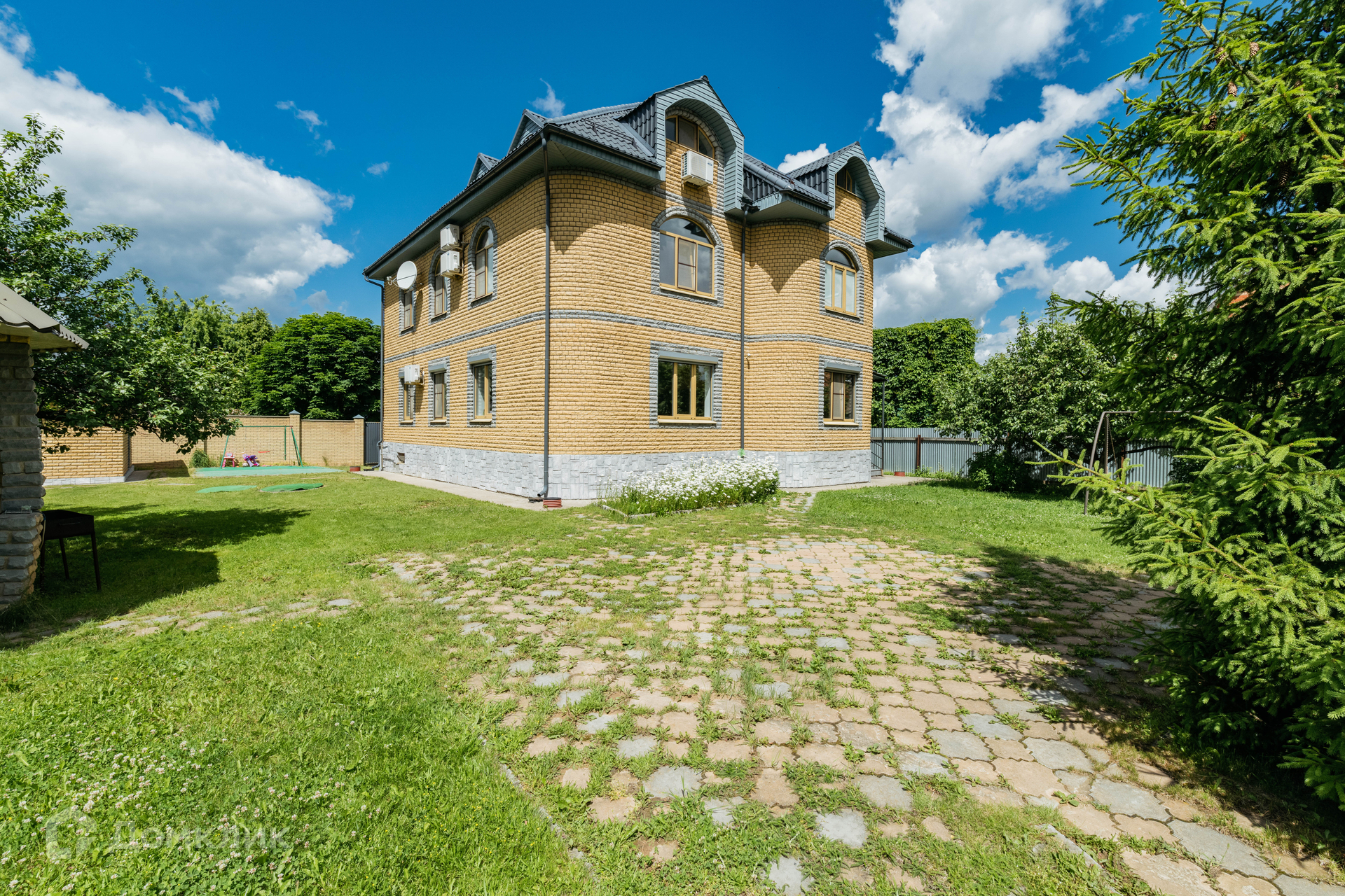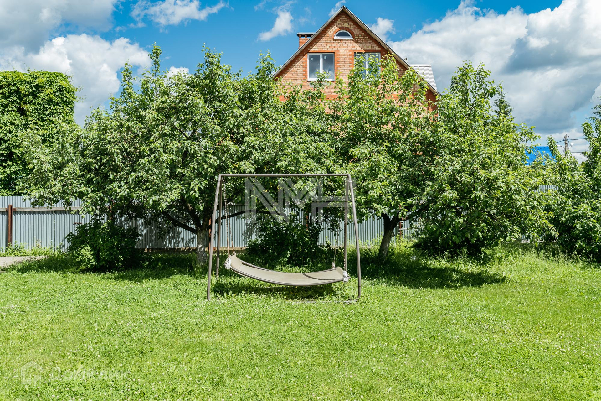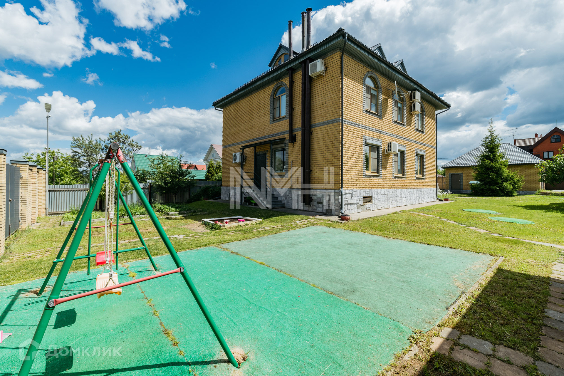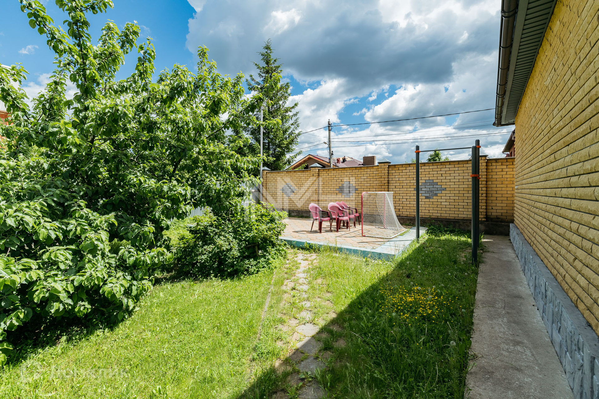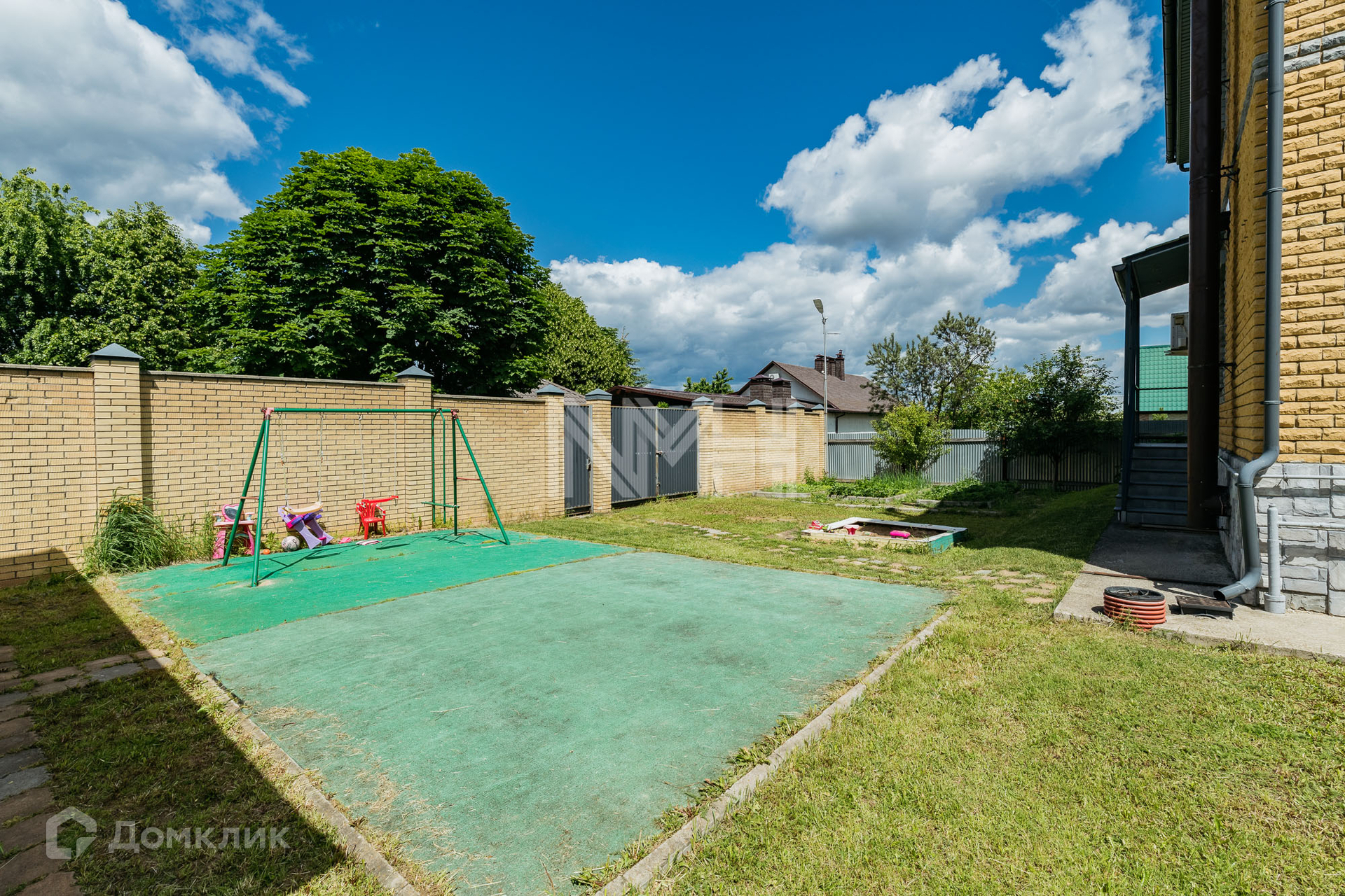 Участок с газоном и местом для установки бассейна, на участке оборудована детская игровая площадка.