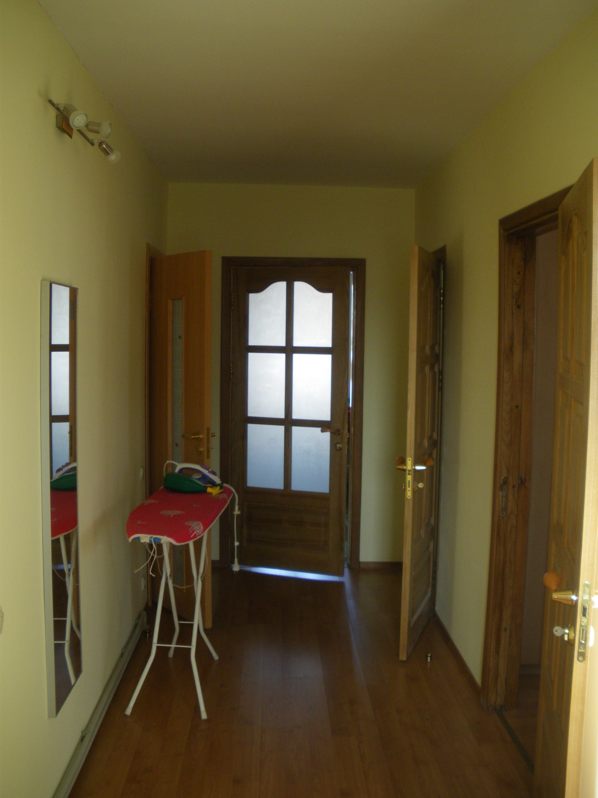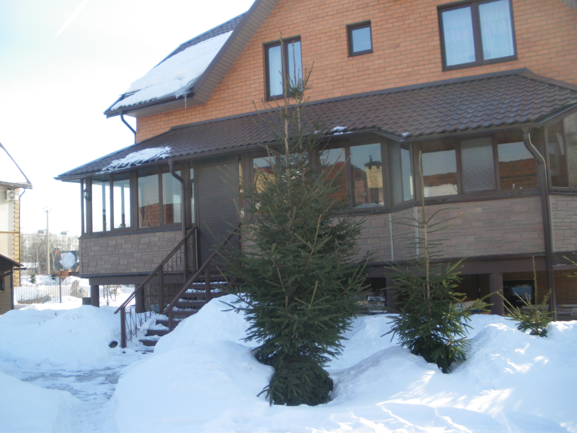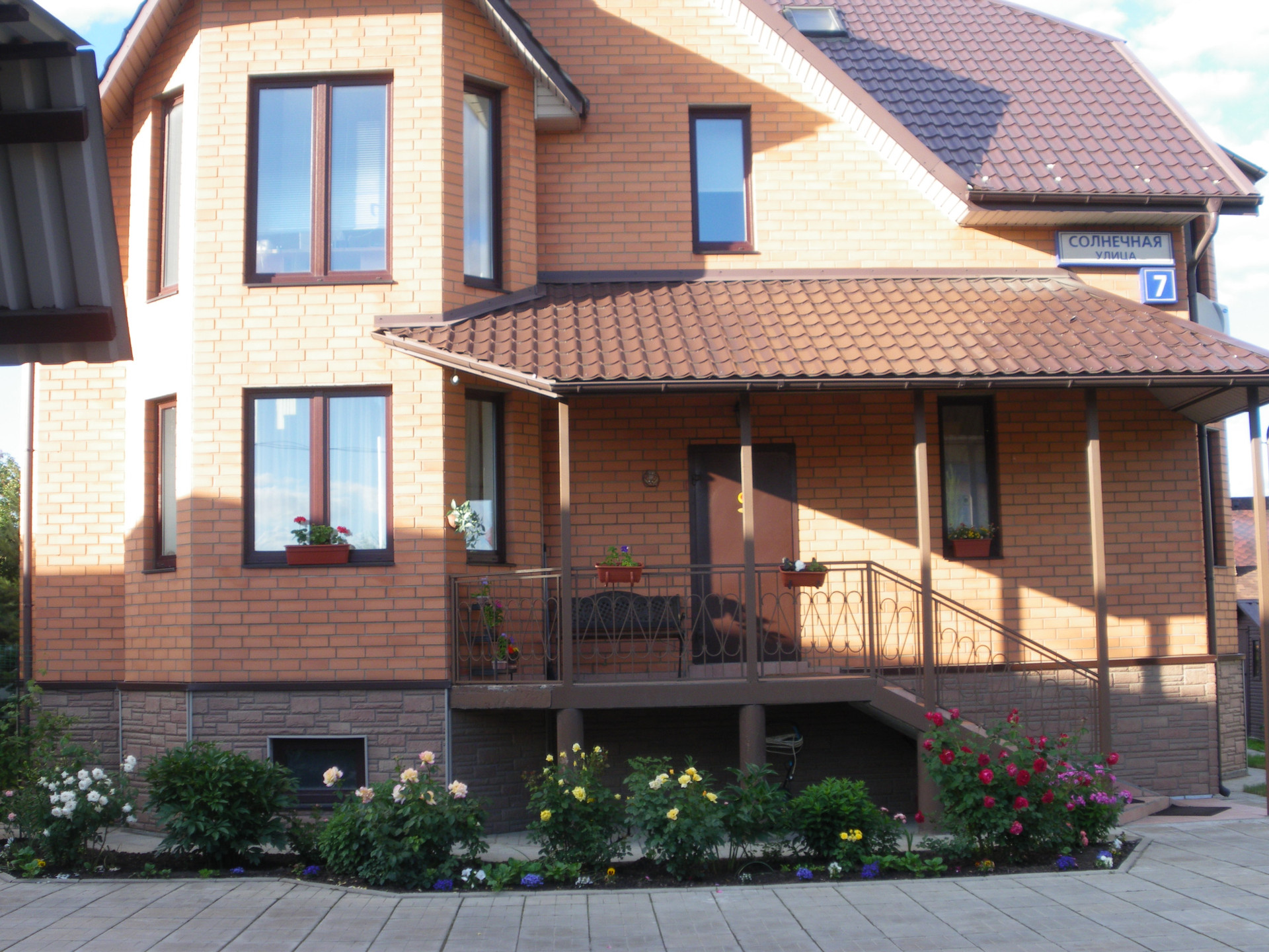 Дом состоит из двух независимых половин. В каждой своя кухня и два санузла (на каждом этаже). Первая половина состоит из гостиной/кухни и 3-х спален на втором этаже. Вторая половина устроена как "второй свет": гостиная/кухня на первом и спальня+ галерея на втором этаже. Имеется цокольный этаж с русской баней, спортзалом и кладовкой. Кроме перечисленного, существует мансардный этаж с отоплением и окнами. Обе половины соединяются верандой с выходом на участок. На участке несколько грядок, теплица, детская площадка. Во дворе - гараж и навес для 3-х машин со смотровой ямой, отдельный мотоциклетный гараж. Двор выложен тротуарной плиткой.