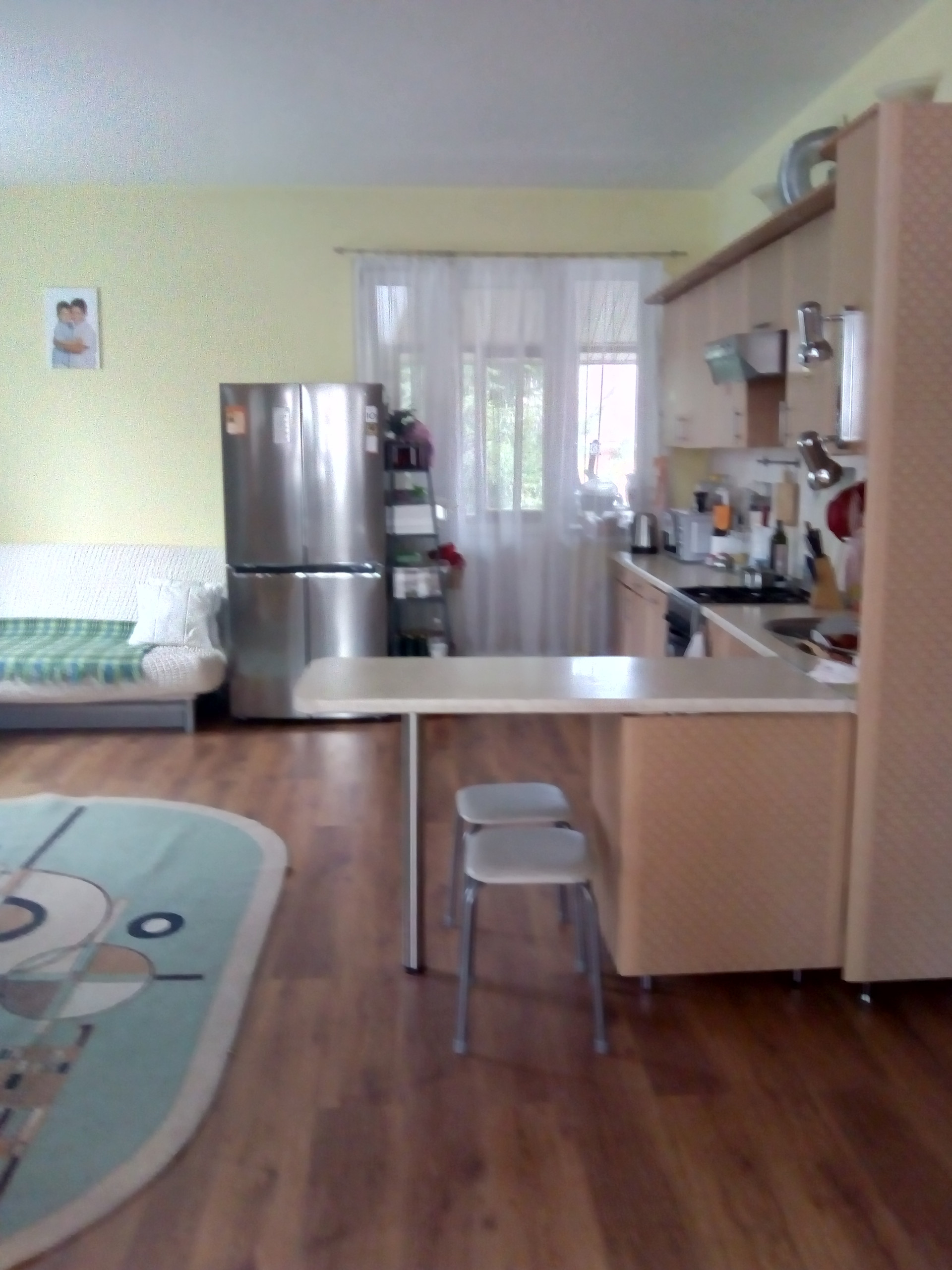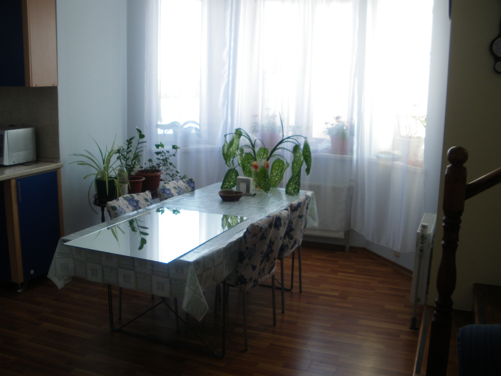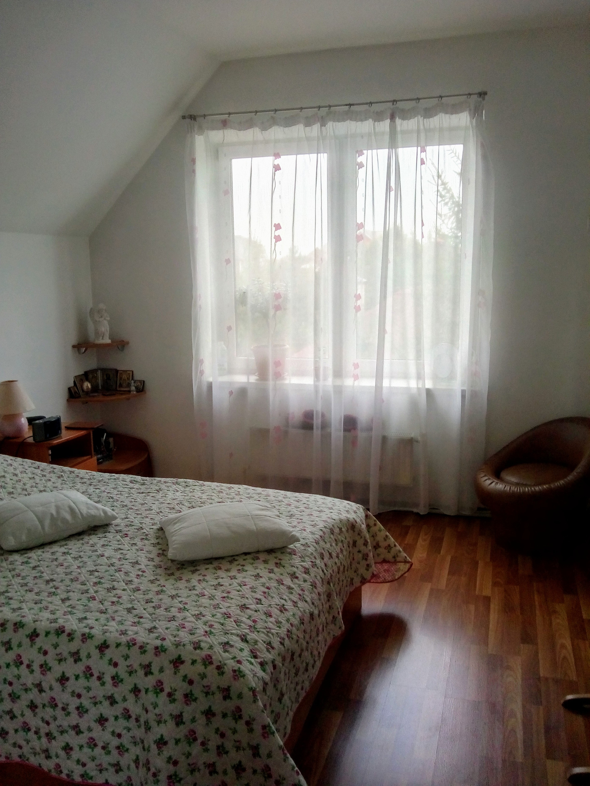 Дом состоит из двух независимых половин. В каждой своя кухня и два санузла (на каждом этаже). Первая половина состоит из гостиной/кухни и 3-х спален на втором этаже. Вторая половина устроена как "второй свет": гостиная/кухня на первом и спальня+ галерея на втором этаже. Имеется цокольный этаж с русской баней, спортзалом и кладовкой. Кроме перечисленного, существует мансардный этаж с отоплением и окнами. Обе половины соединяются верандой с выходом на участок. На участке несколько грядок, теплица, детская площадка. Во дворе - гараж и навес для 3-х машин со смотровой ямой, отдельный мотоциклетный гараж. Двор выложен тротуарной плиткой.