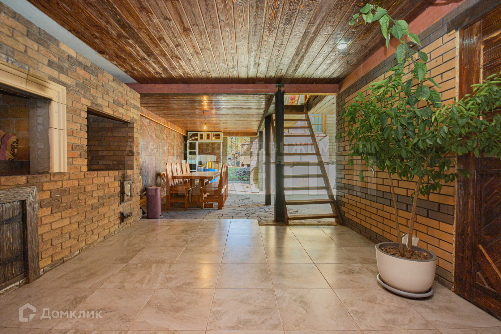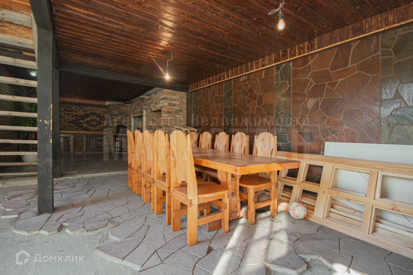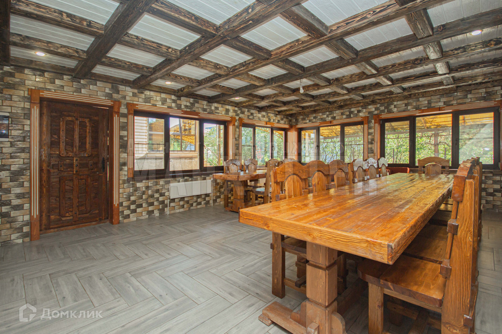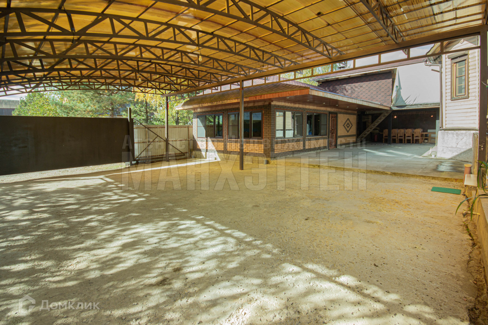 В отдельном строении оборудован обеденный зал со своей кухней и мангальной зоной, помещение подключено к домовой системе отопления.