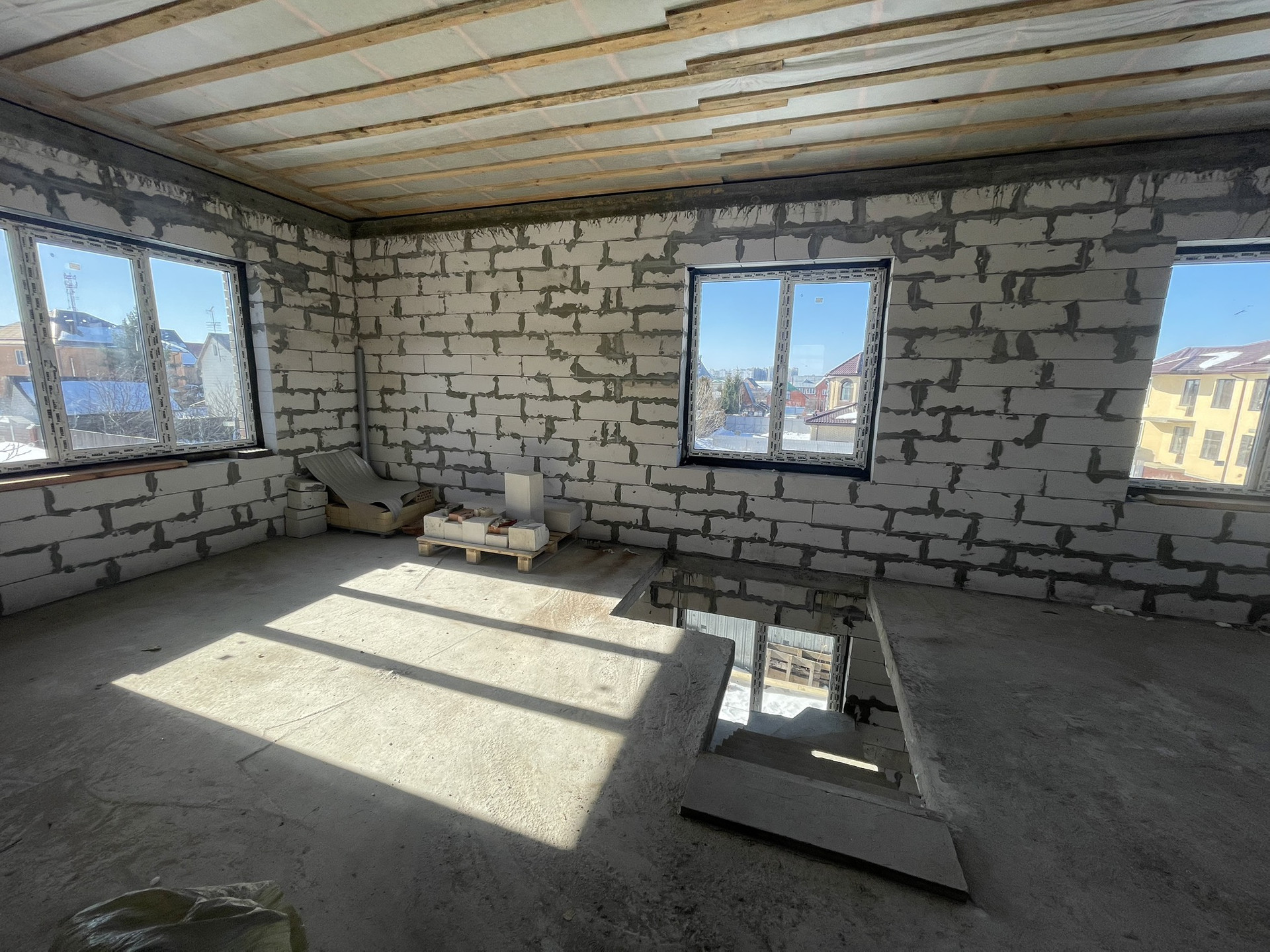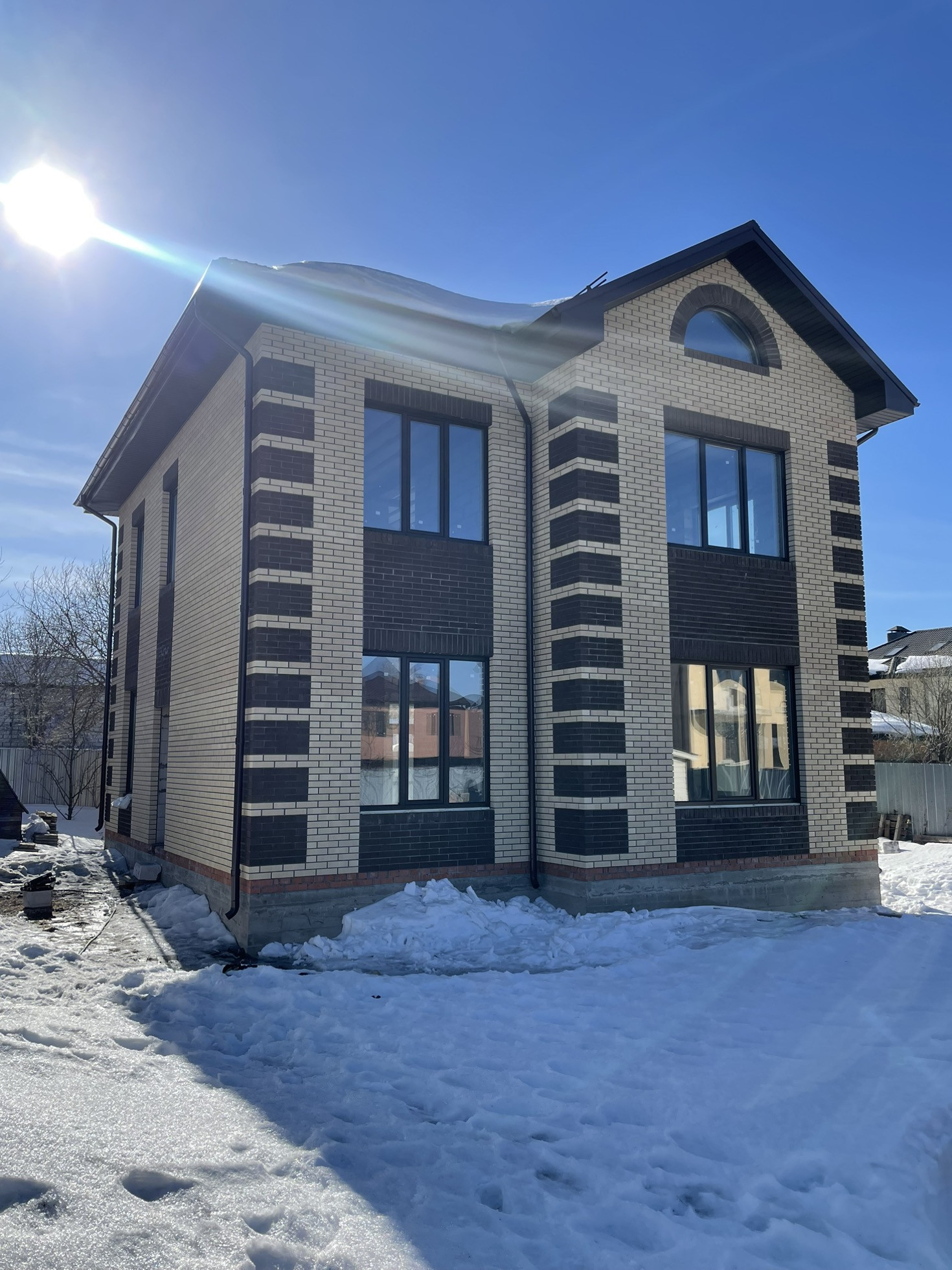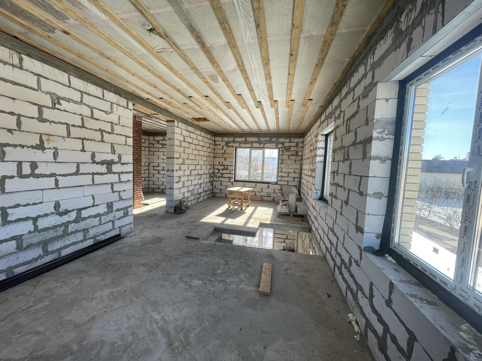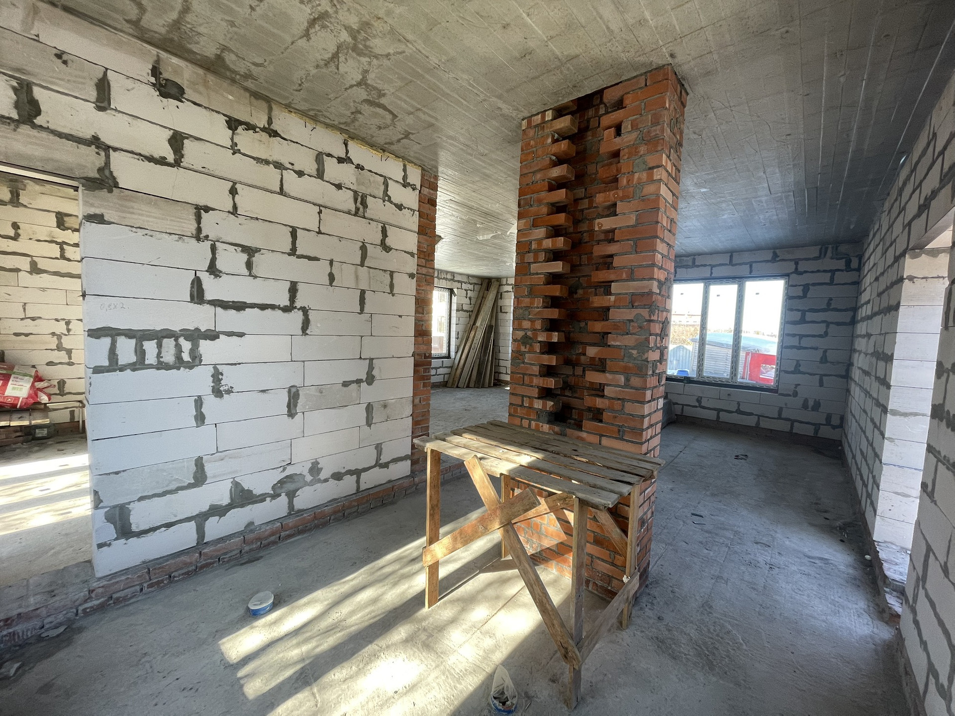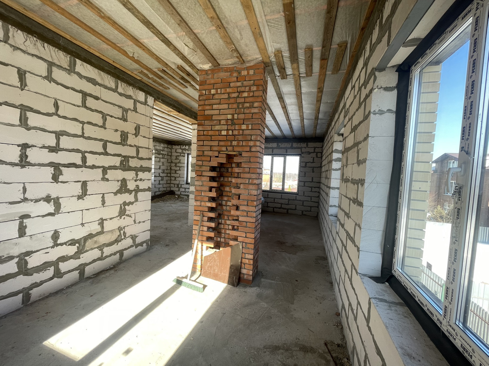 Стены - блок "Аэробел" + облицовочный кирпич цвета "солома" со ставками коричневого кирпича. Крыша перекрыта металлочерепицей. Окна ПВХ, 3-й стекло пакет с ламинацией под темное дерево. Ленточный фундамент выкопан на глубину промерзания, вязка фундамента из 12-ой арматуры по ГОСТу. Плита перекрытия 12-я арматура 2 слоя сетки ячейки 18*18. Подготовки коммуникации проложены в фундамент. Толщины плиты 20см. Стены толщиной 46см, 30см блок , 3.5 Эми воздушный зазор, 12.5 облицовочный кирпич. В углах имеются колонны из полнотелего кирпича. Плита перекрытия первого этажа -толщина 17см, двойная сетка 12-й арматуры, ячейка 18*18. Лестница залита железобетон. С кухни оставлен большой проем с выходом на веранду. Размеры дома: 9*11 по длинной стороне, по короткой стороне 9*10