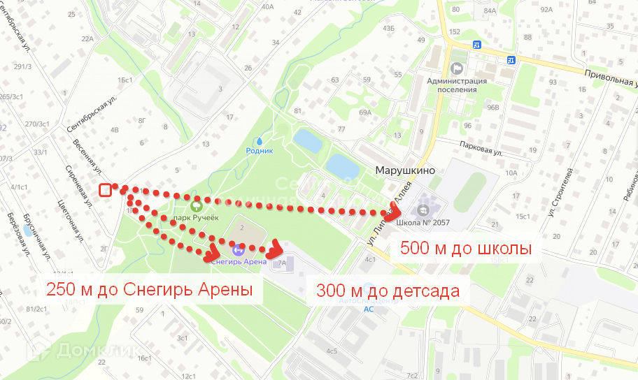 В шаговой доступности школа (500 м пешком), детский сад (300 м), спортивный центр "Снегирь Арена" (250 м), парк "Ручеек" (100 м)