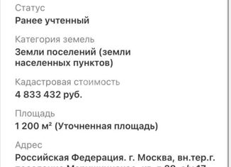 Арт. 41274412 Продам земельный участок 12 соток в "СНТ" Ручеек. ИЖС. Участок выровнен, огорожен, залит фундамент 8*9 , имеется садовый дом 20 м 2 в хорошем жилом состоянии. Свет 15 квт, колодец на участке. Газ подведен к границе участка. Прописка Москва. Идеальная транспортная доступность. Один собственник. Без обременений. Полная стоимость. Ипотек... |