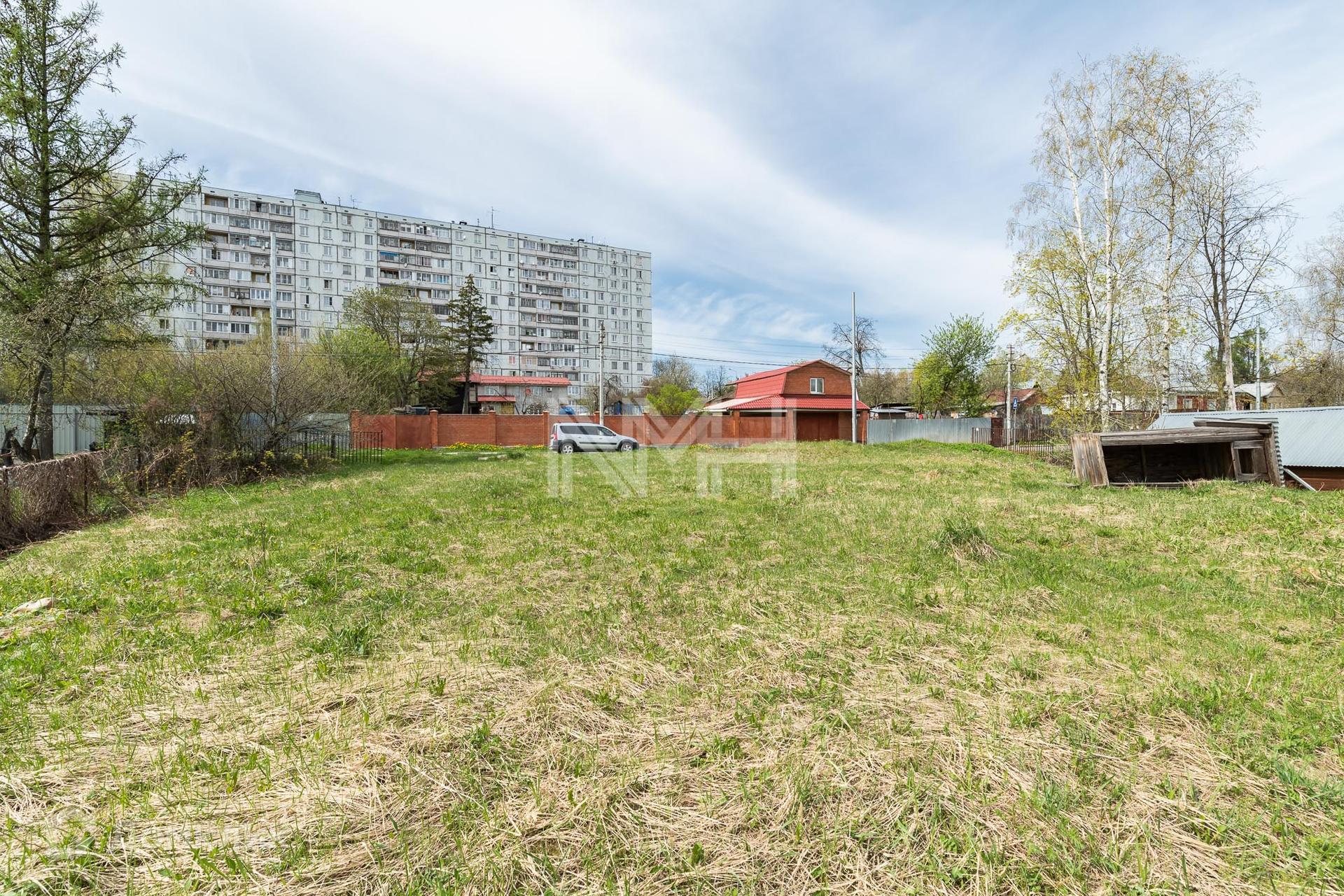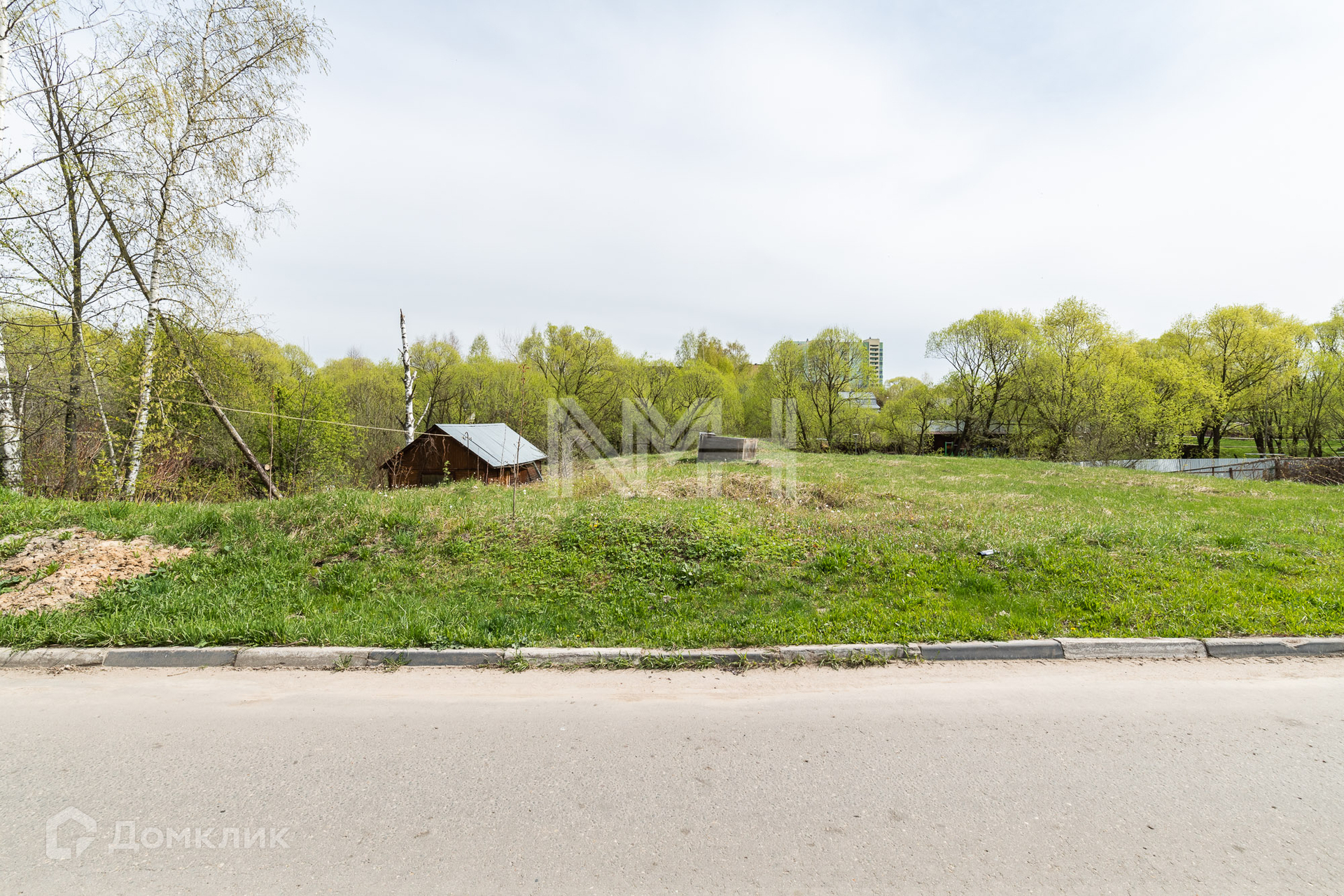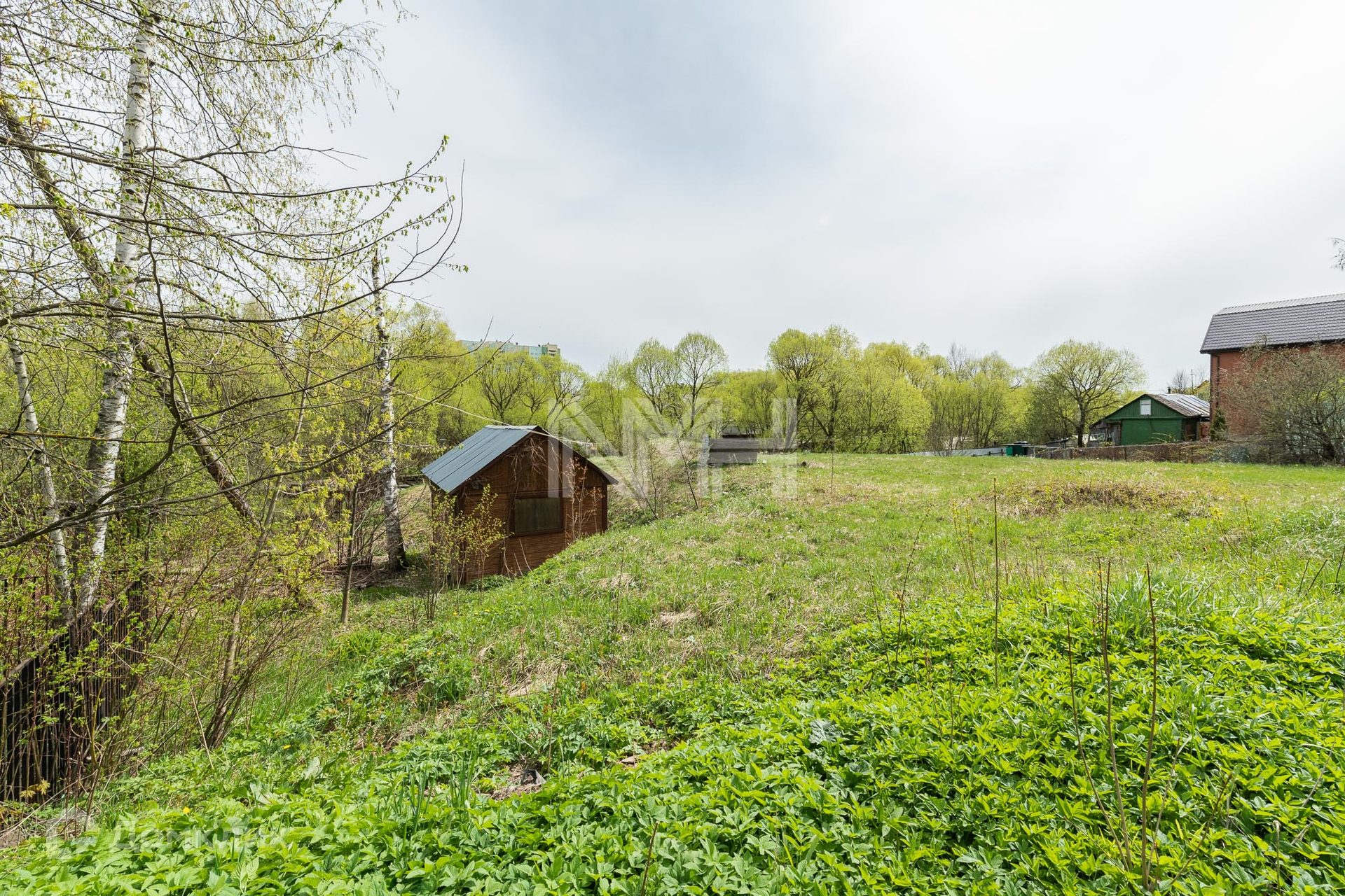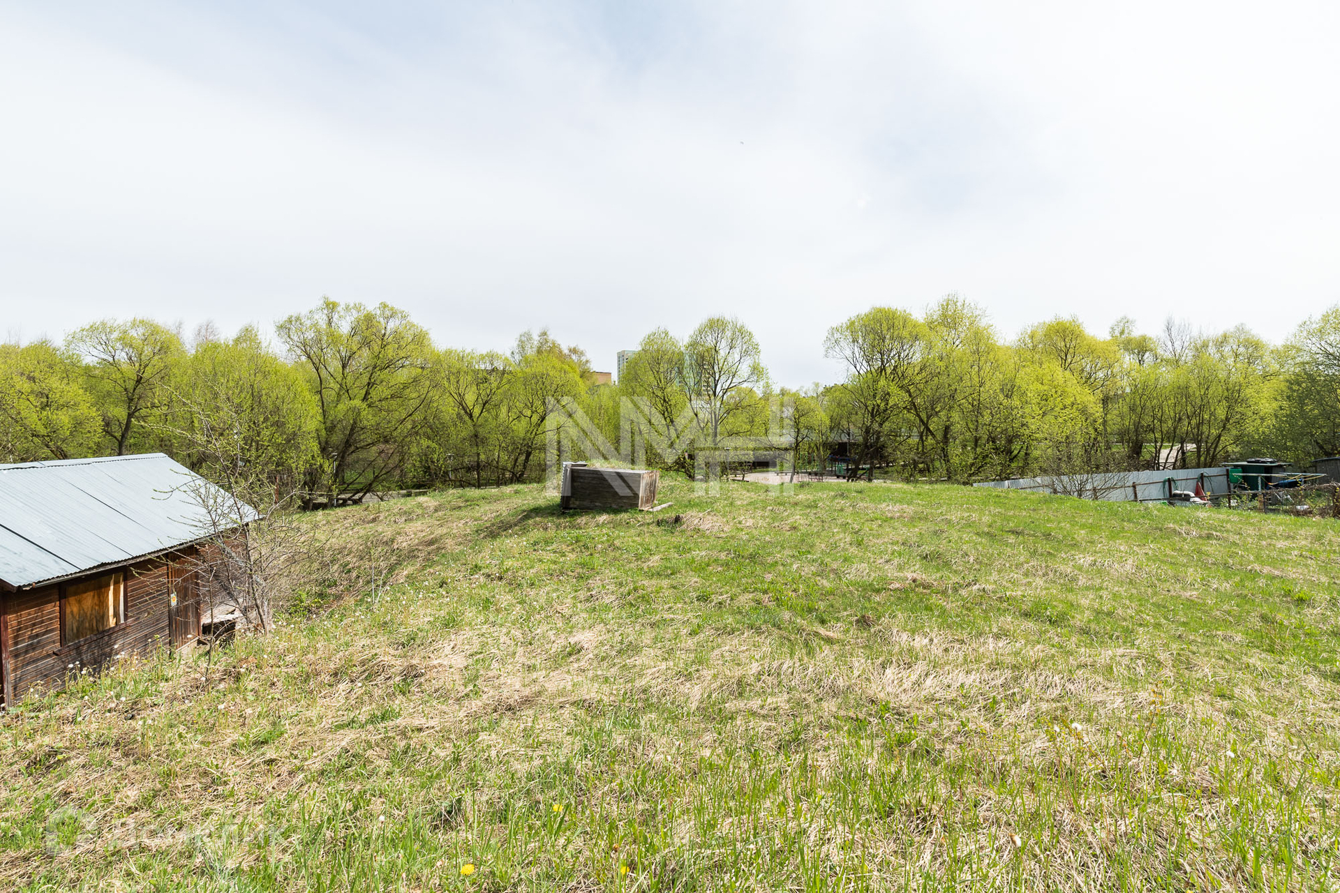 Участок правильной формы, без насаждений, обнесен забором с 3 сторон и видом на парк. На участке расположена хозяйственная постройка.