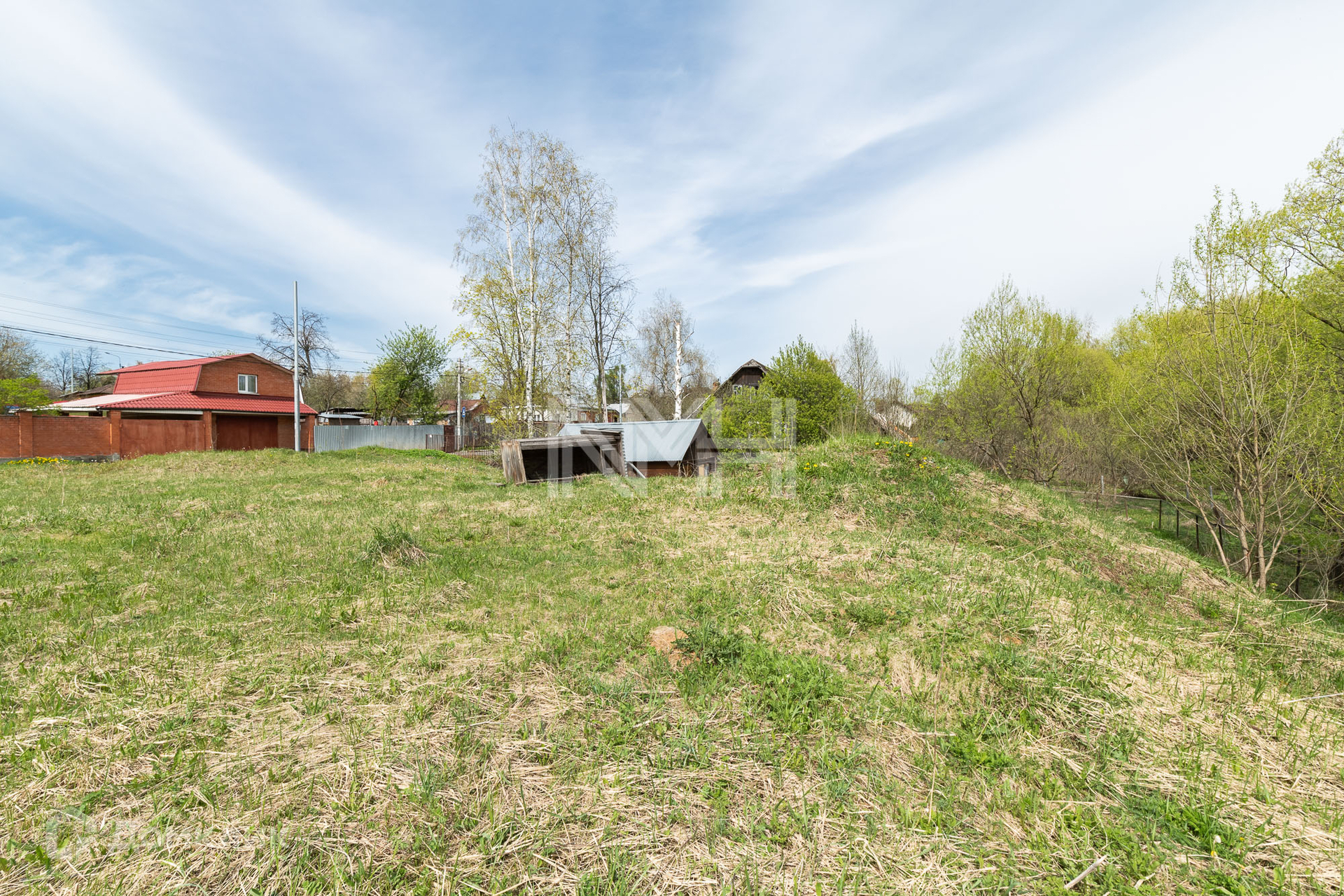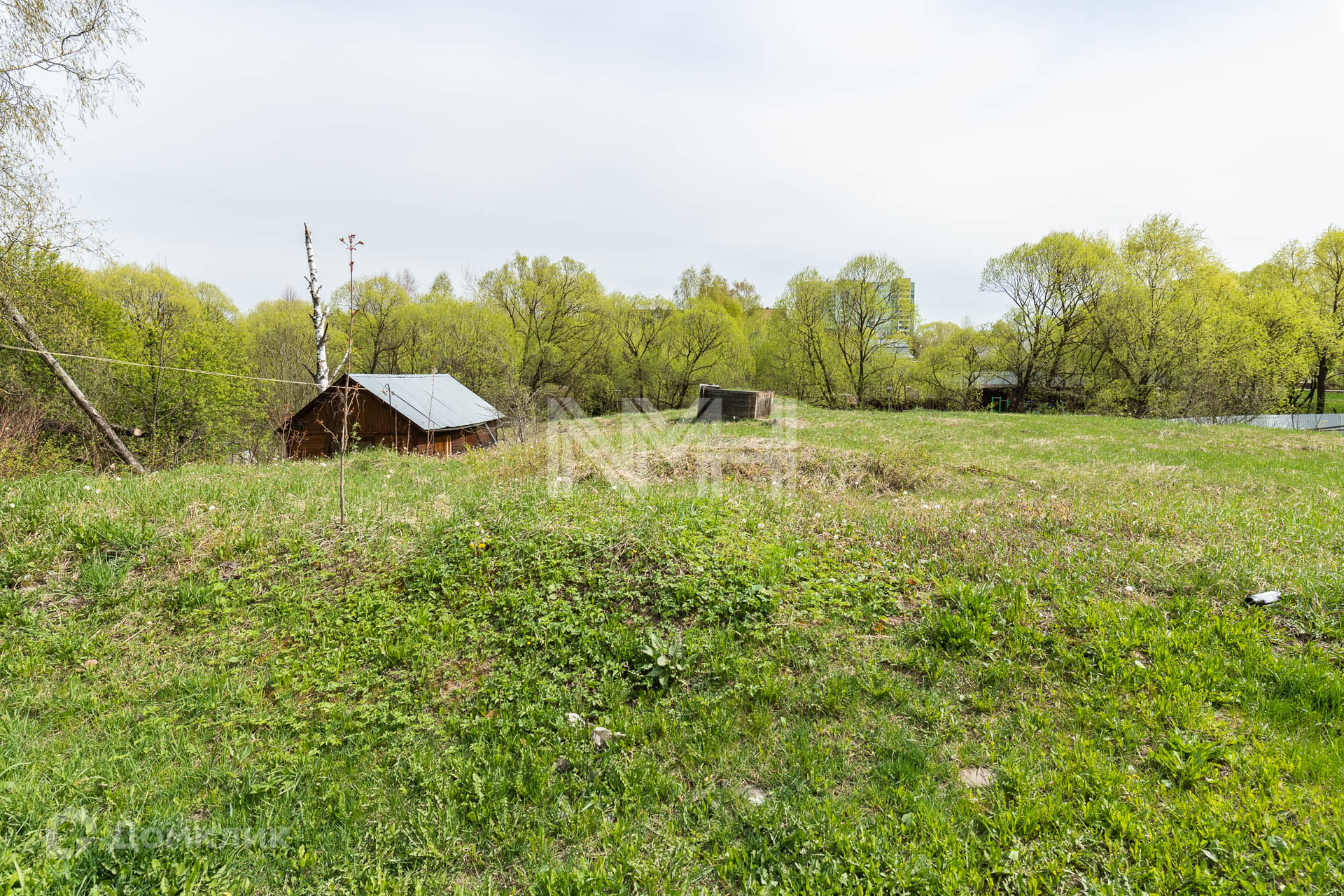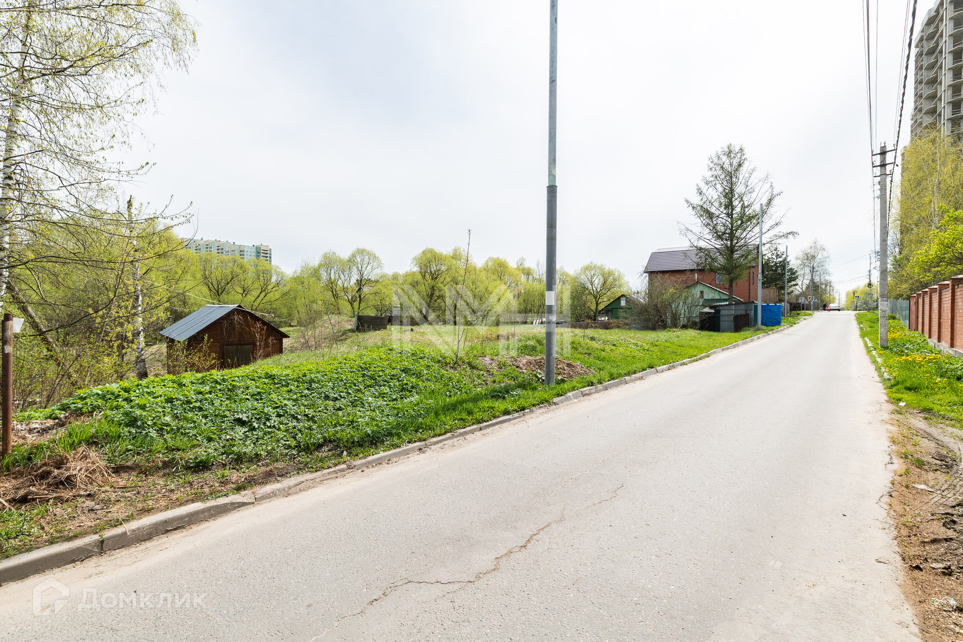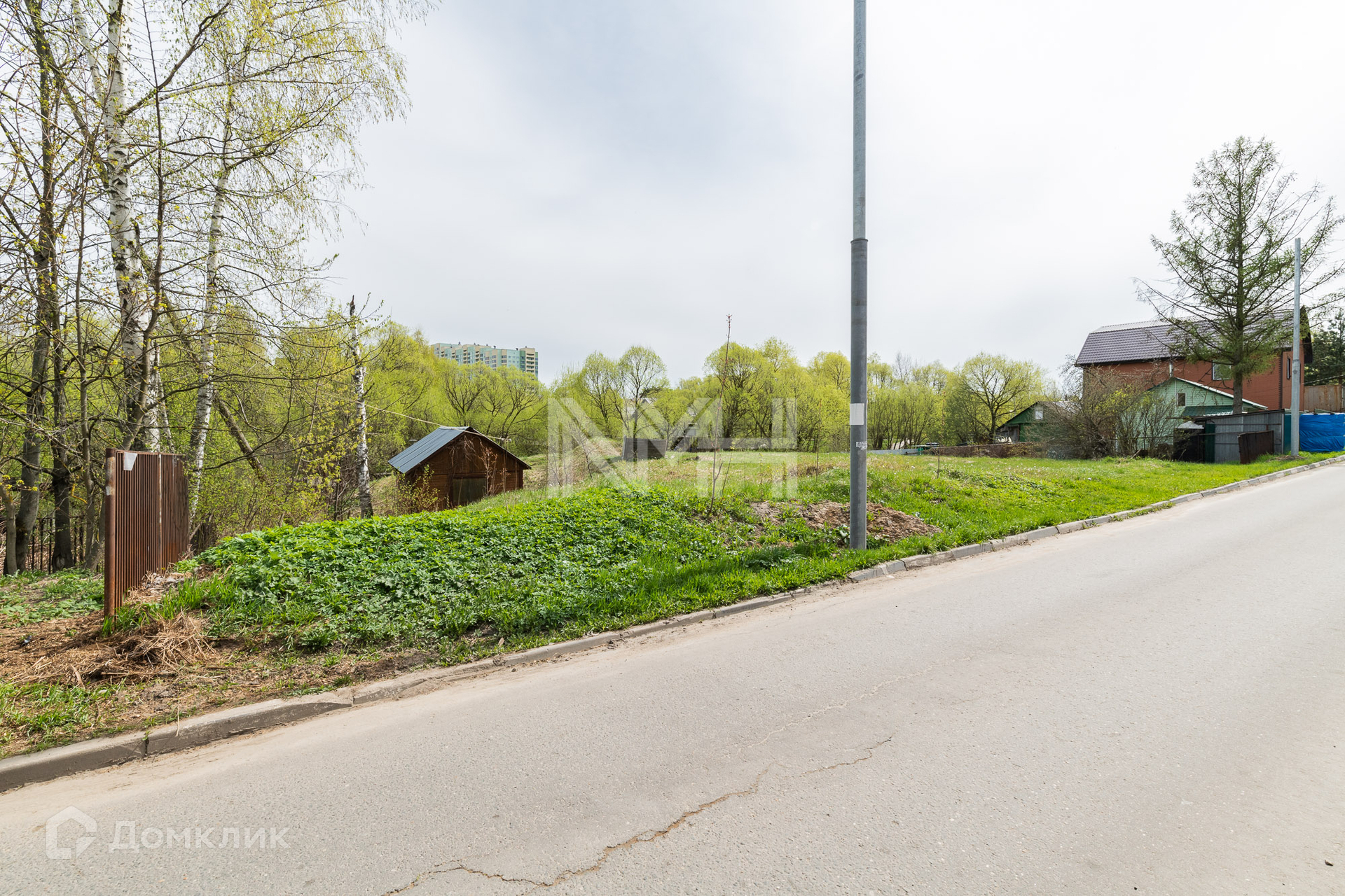 Участок правильной формы, без насаждений, обнесен забором с 3 сторон и видом на парк. На участке расположена хозяйственная постройка.