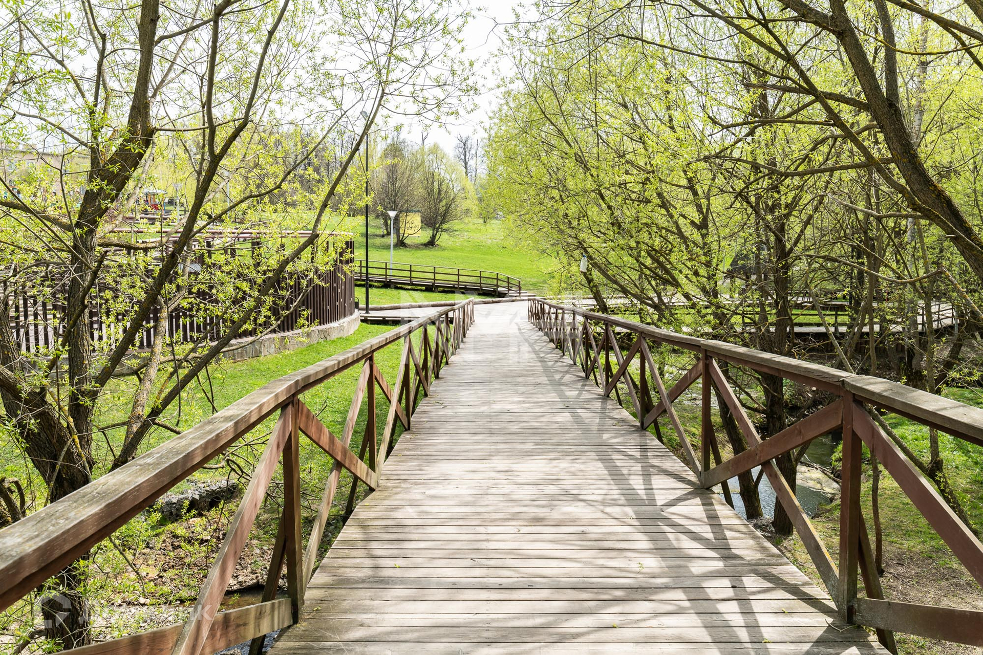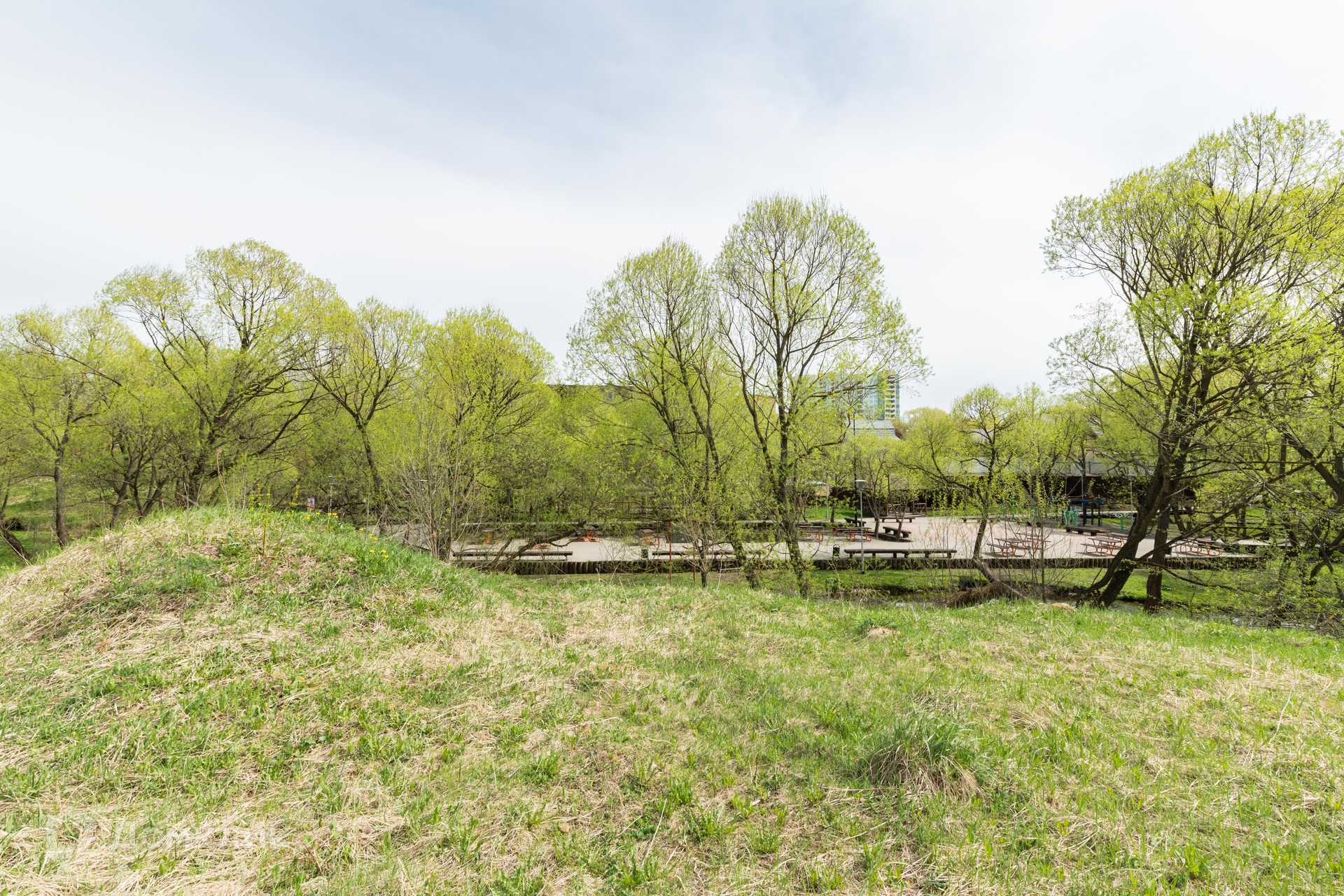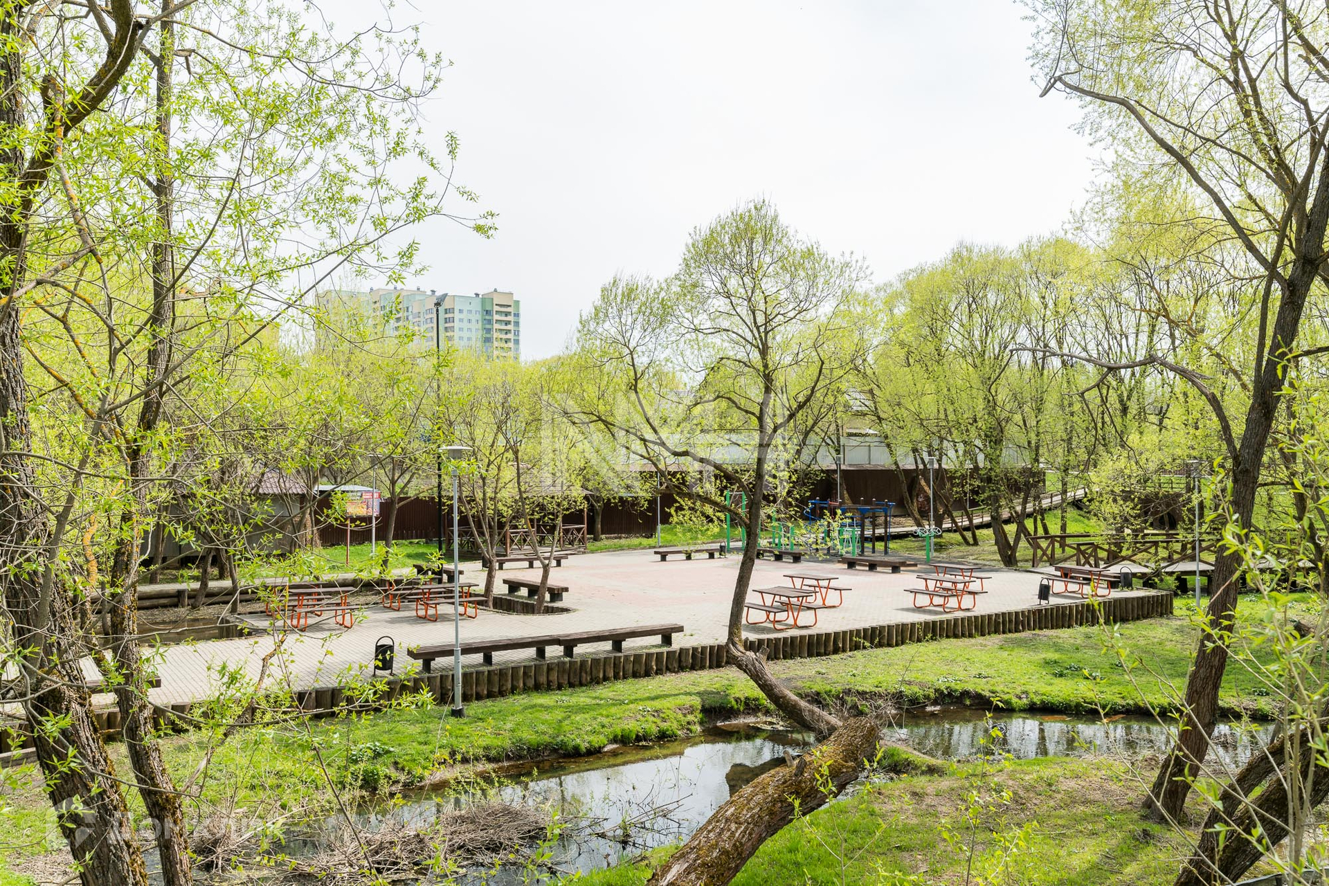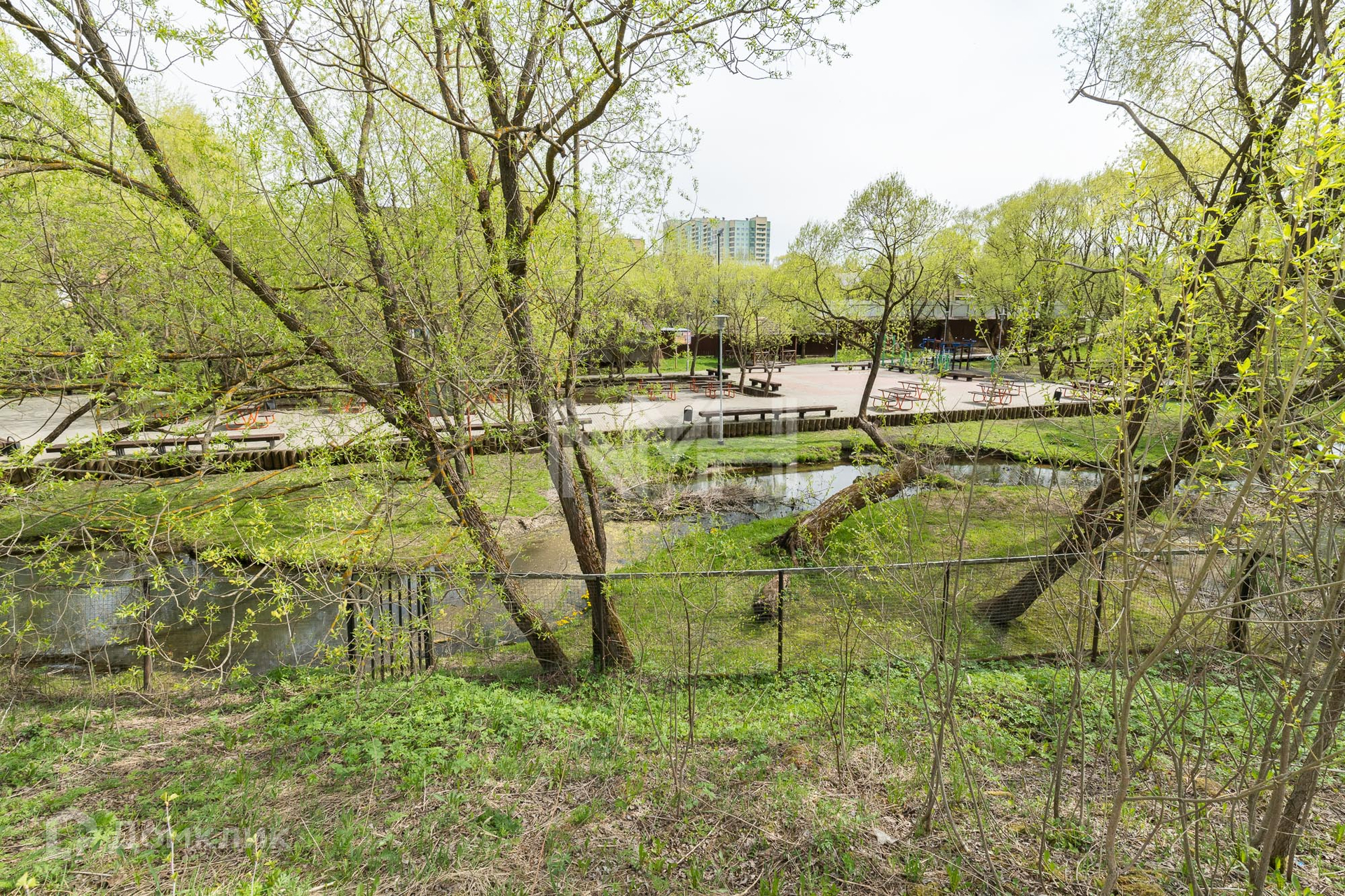 Участок правильной формы, без насаждений, обнесен забором с 3 сторон и видом на парк. На участке расположена хозяйственная постройка.