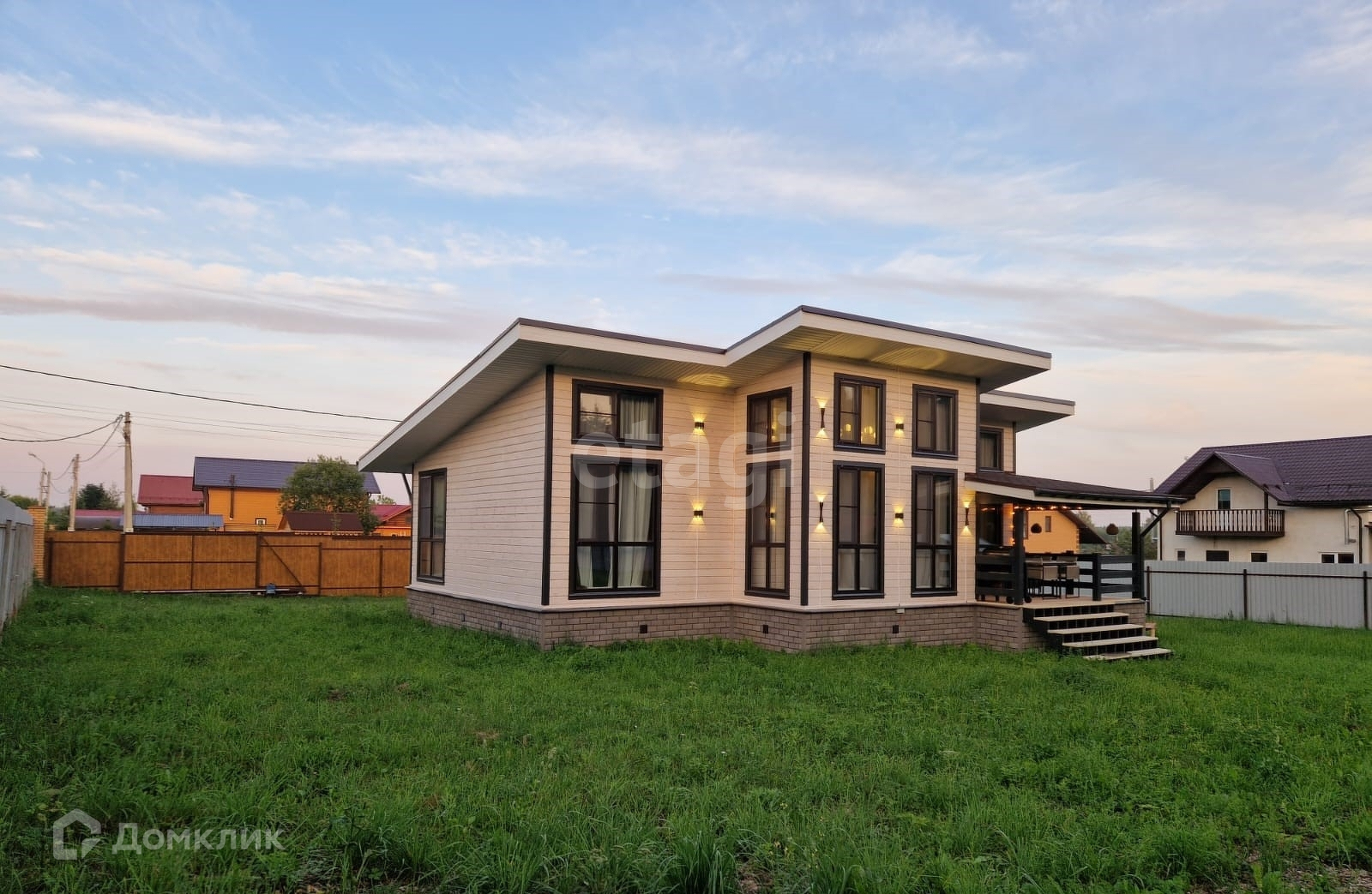 Дом спроектирован как финское шале Aurinkomets с односкатной крышей, с лицевой части дома (которая выходит на лес) высота потолка 4.2 метра, панорамные окна в пол. Две спальни, большая кухня-гостиная, большая терасса с полноценной обеденной зоной. В гостиной с панорамными окнами предусмотрено место для установки камина. Дом наполнен светом, при этом, зимний и тёплый. Все коммуникации сделаны в скрытом виде, чтобы не портить вид краси