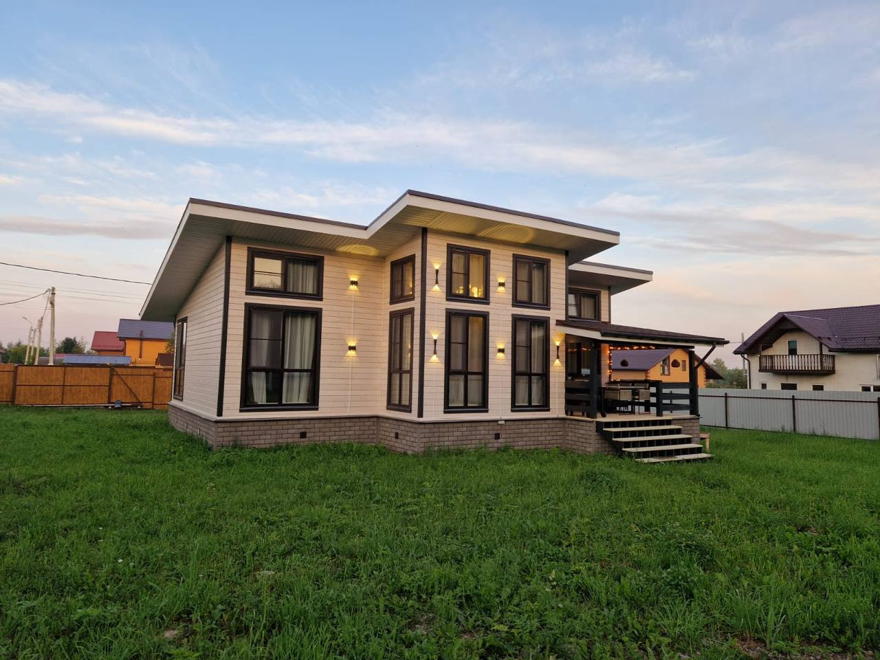 На фасаде дома установлено внешнее освещение, вечером дом выглядит как открытка. Поскольку дом у леса, слышно птиц с утра и до заката, не слышно ни дорог, ни машин.