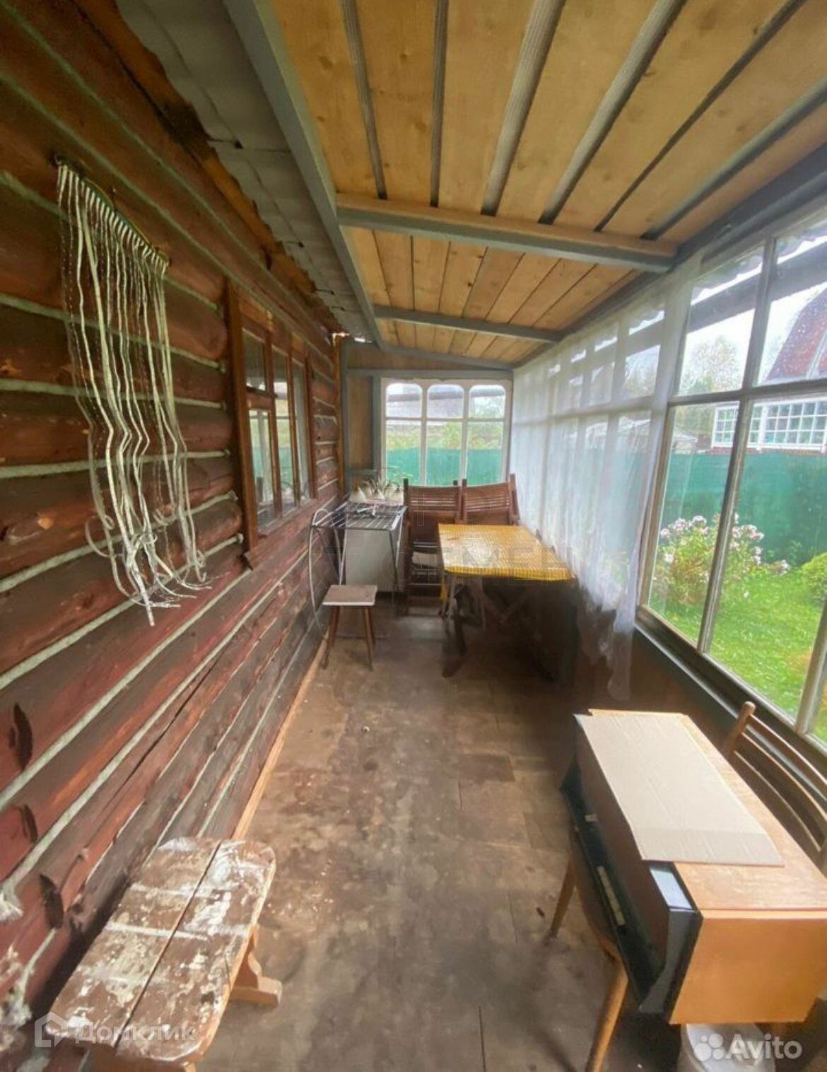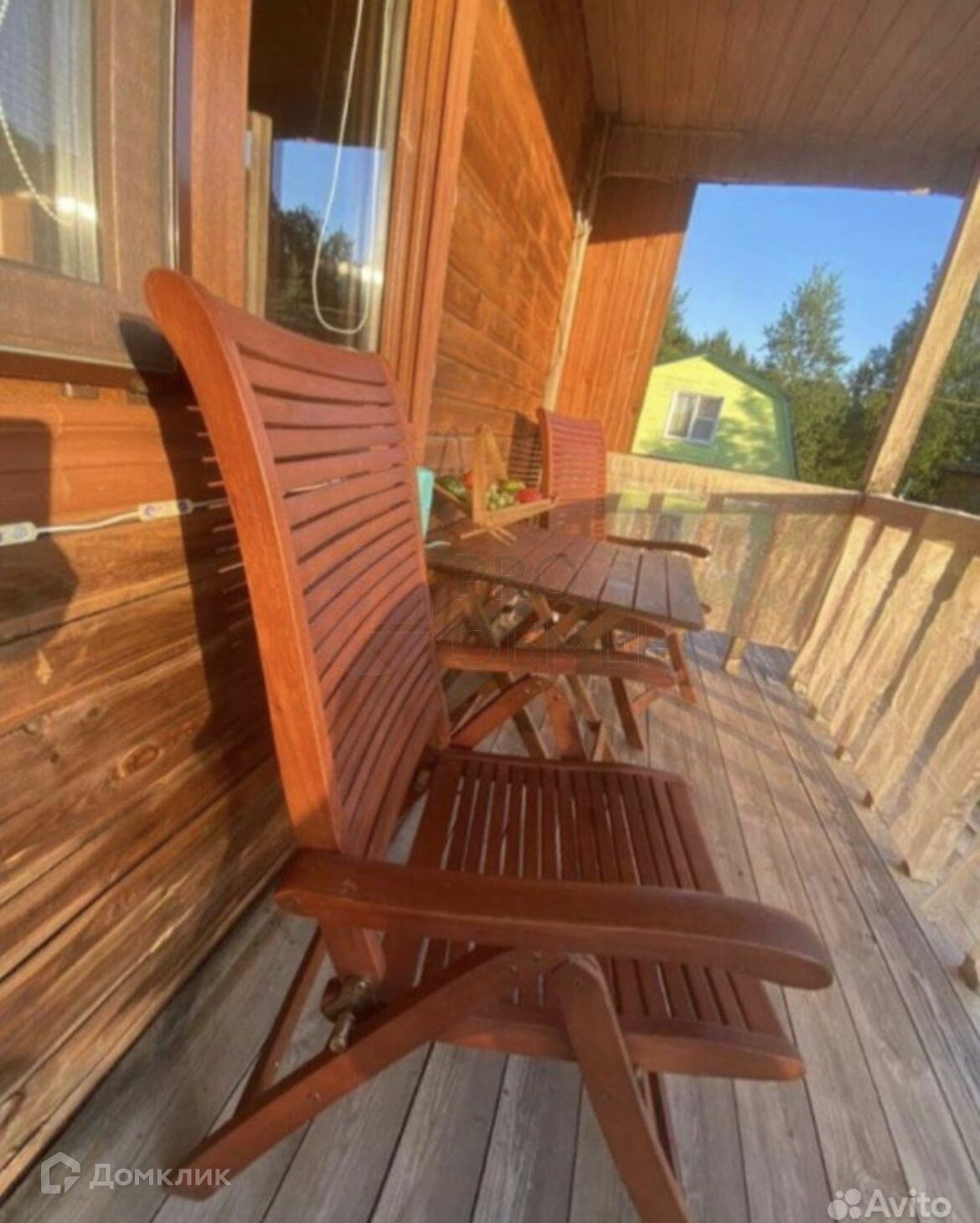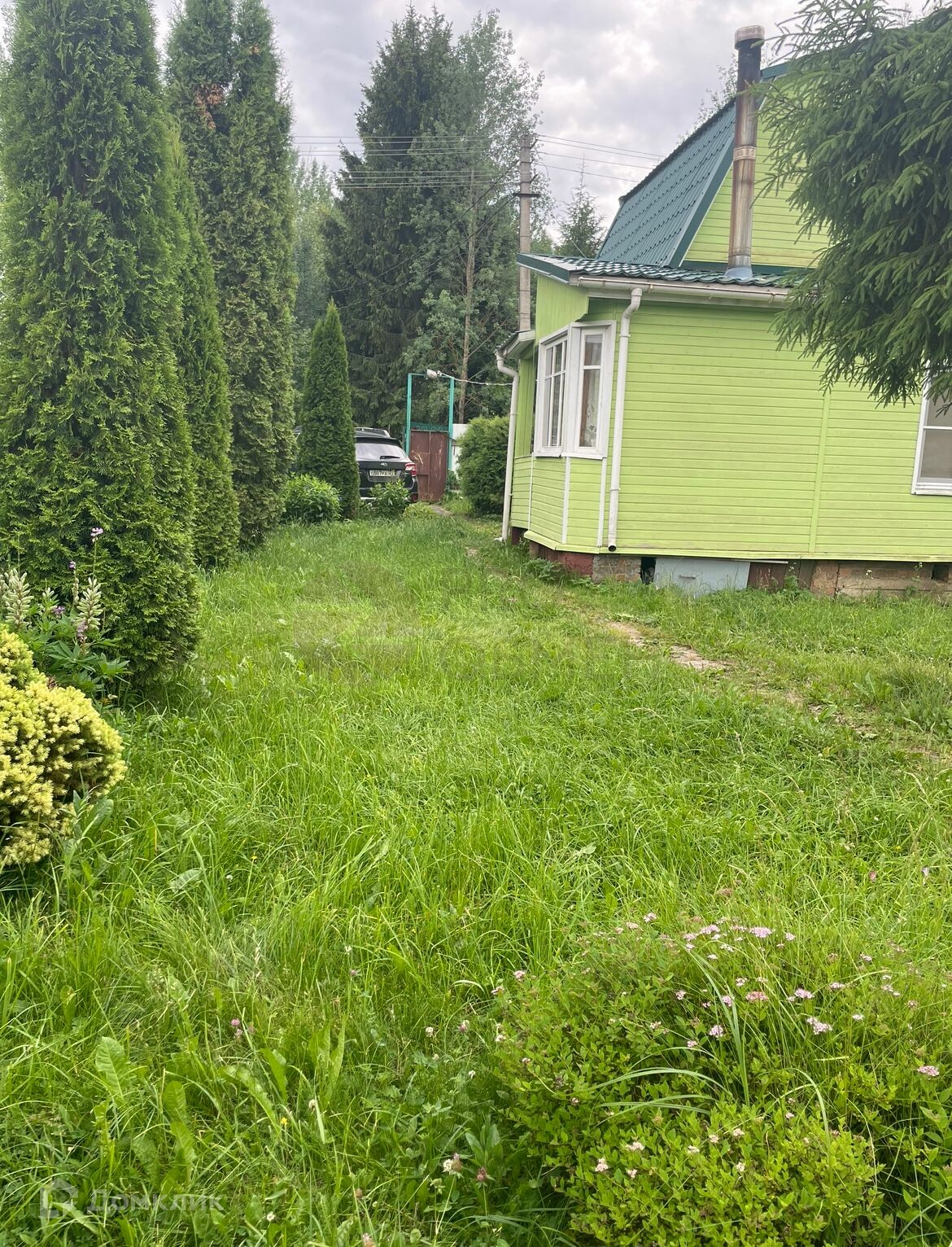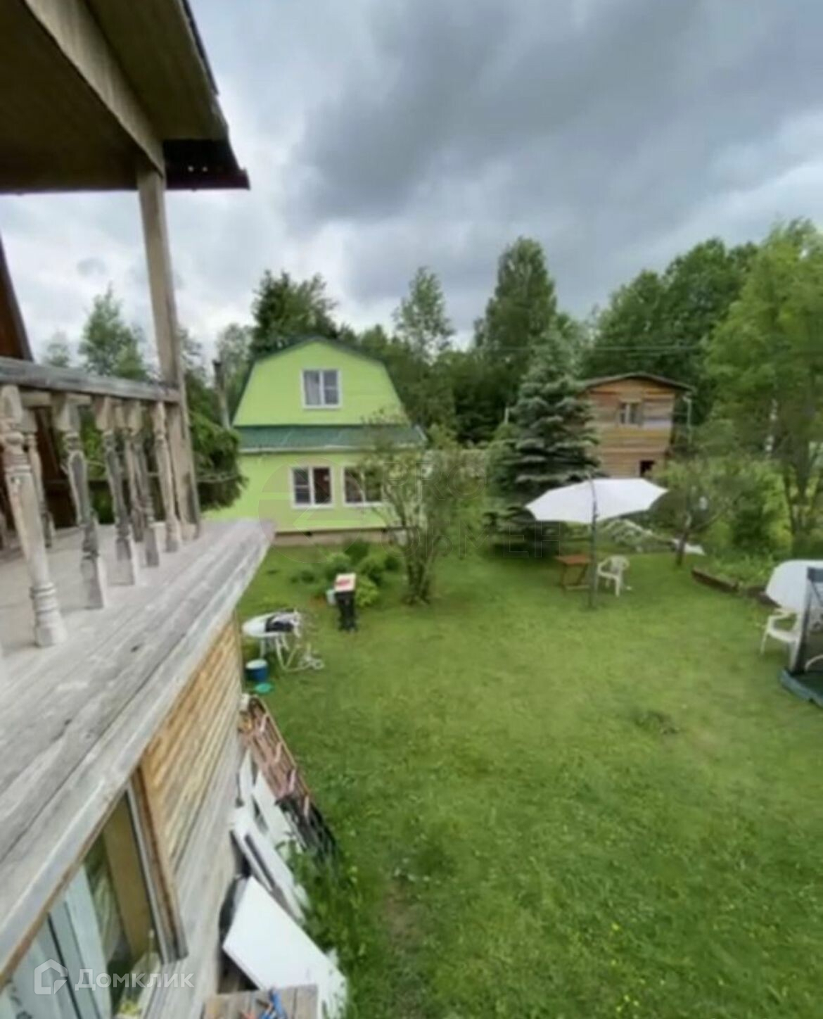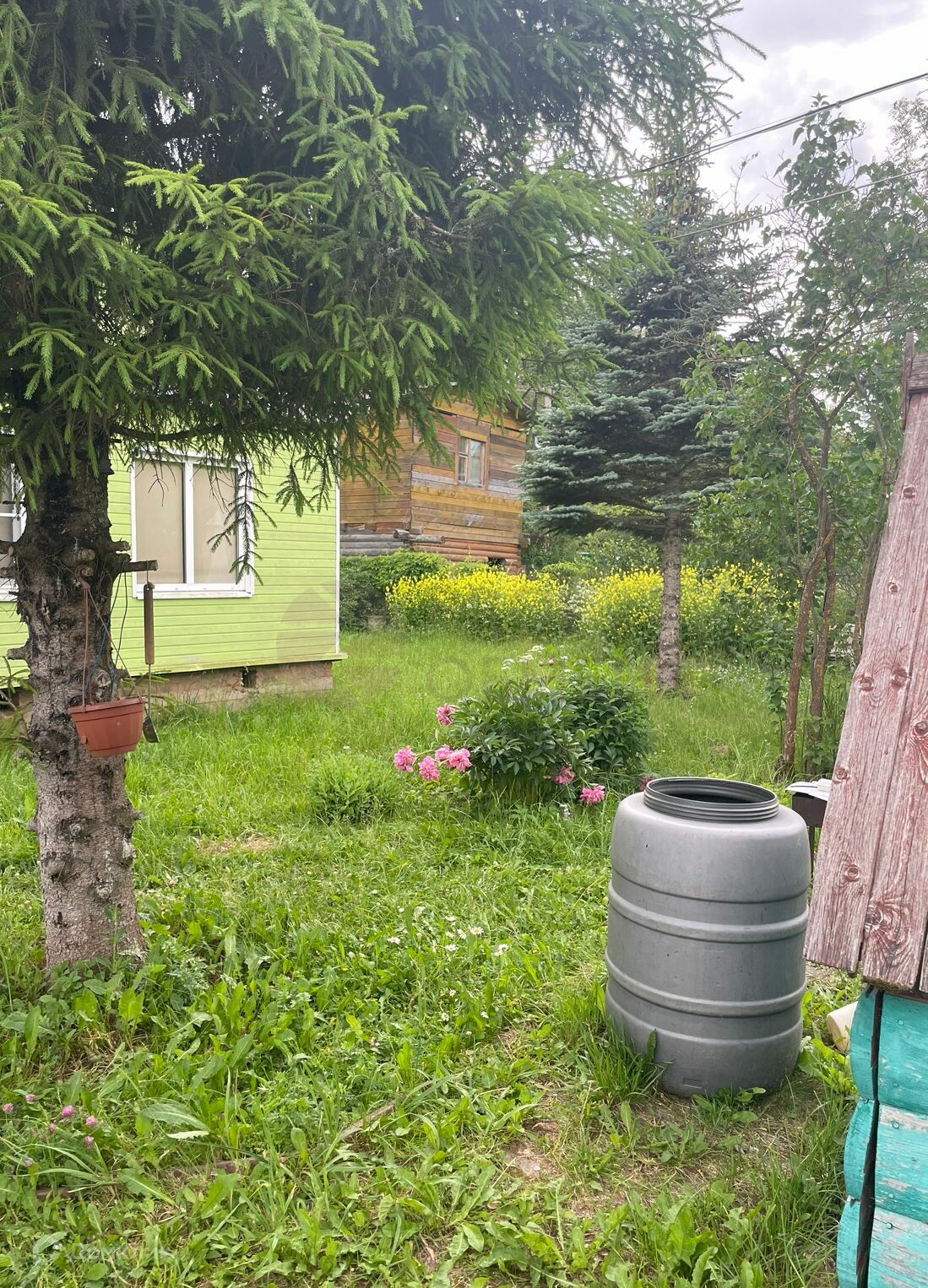 Крытая веранда. На участке туи, елка, плодовые деревья, цветы.