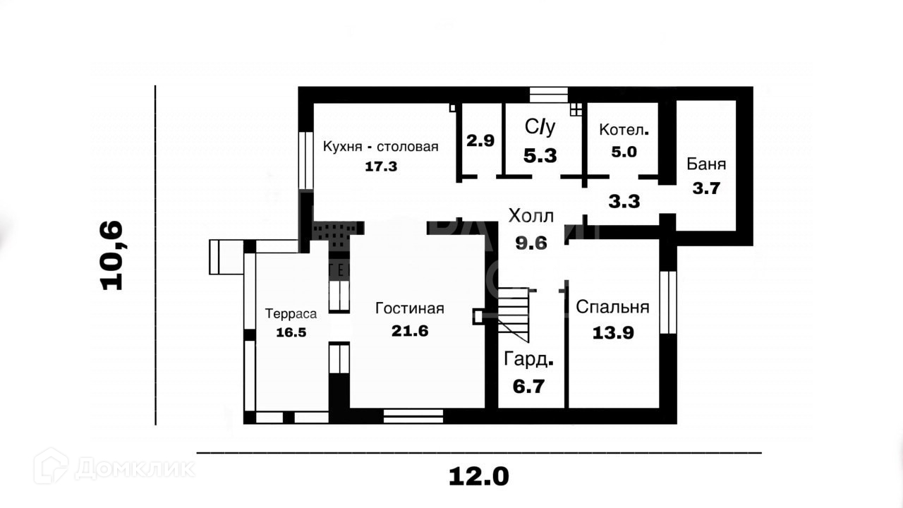Терраса, кухня-столовая, гостиная, 2 помещения для хранения (гардеробная и кладовка), гостевая спальная, санузел, котельная, баня.