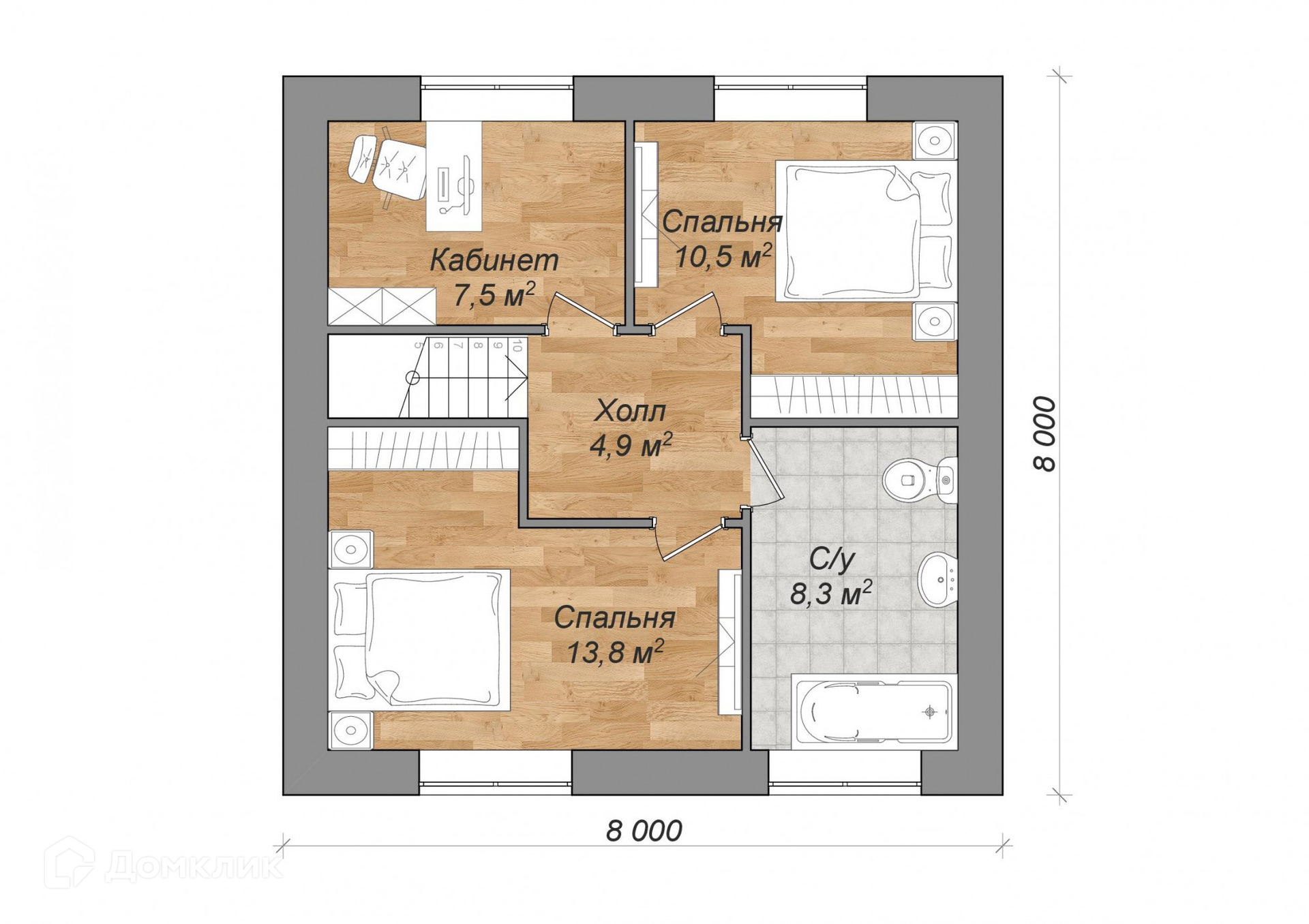 - На втором этаже: 3 комнаты и хозяйский санузел с ванной.