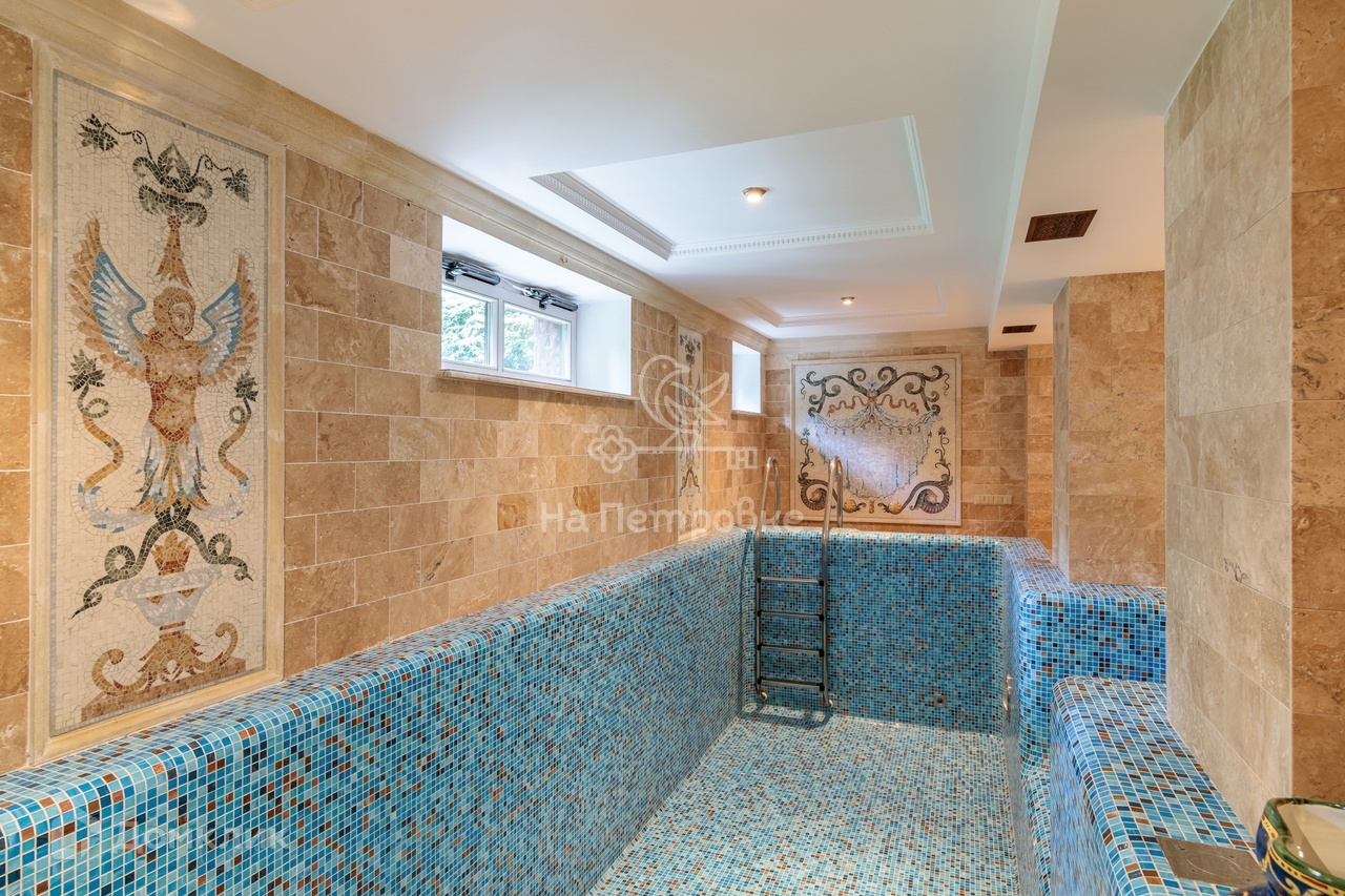 Зона спа и бассейна – это настоящие римские термы: мозаика фабрики РИМ ( как и вся остальная плитка и сантехника), колонны из натурального камня с капителиями из мрамора.