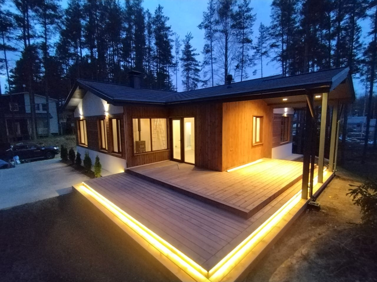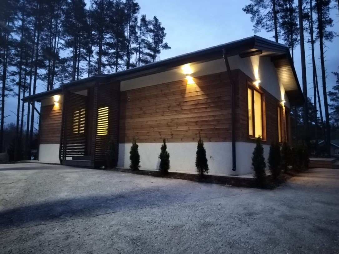 Характеристики: дом построен на монолитной плите, стены - газоблоки 300мм + 50мм утеплитель, отделка фасада штукатурка "Короед" + отделка декоративной доской Скандинавский профиль. Крыша - мягкая кровля, утепление 300мм, водосточная система. Панорамные окна с энергосбережением. Уличное освещение по периметру дома, подсветка кровли и террасы.