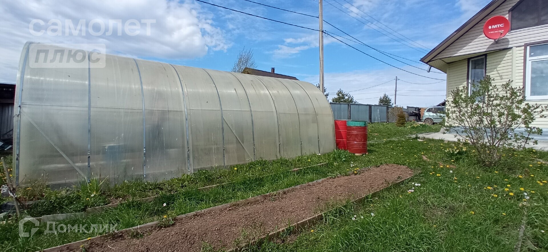 Есть баня+сарай в одном здании, теплица, место под парковку автомобиля, плодово-ягодные насаждения. В дом заведена вода из скважины (трубы с подогревом, не замерзают в морозы), в баню - из колодца.