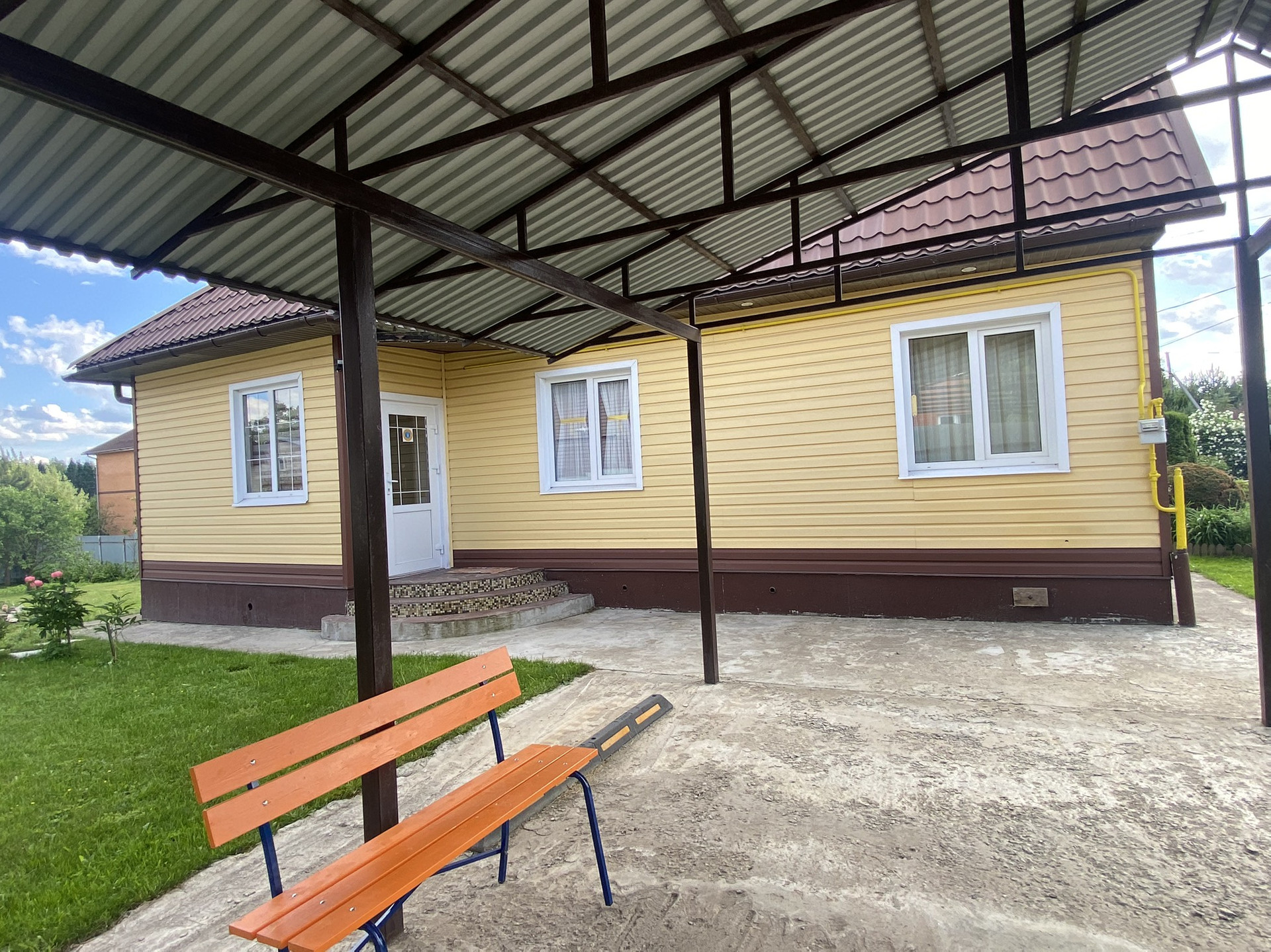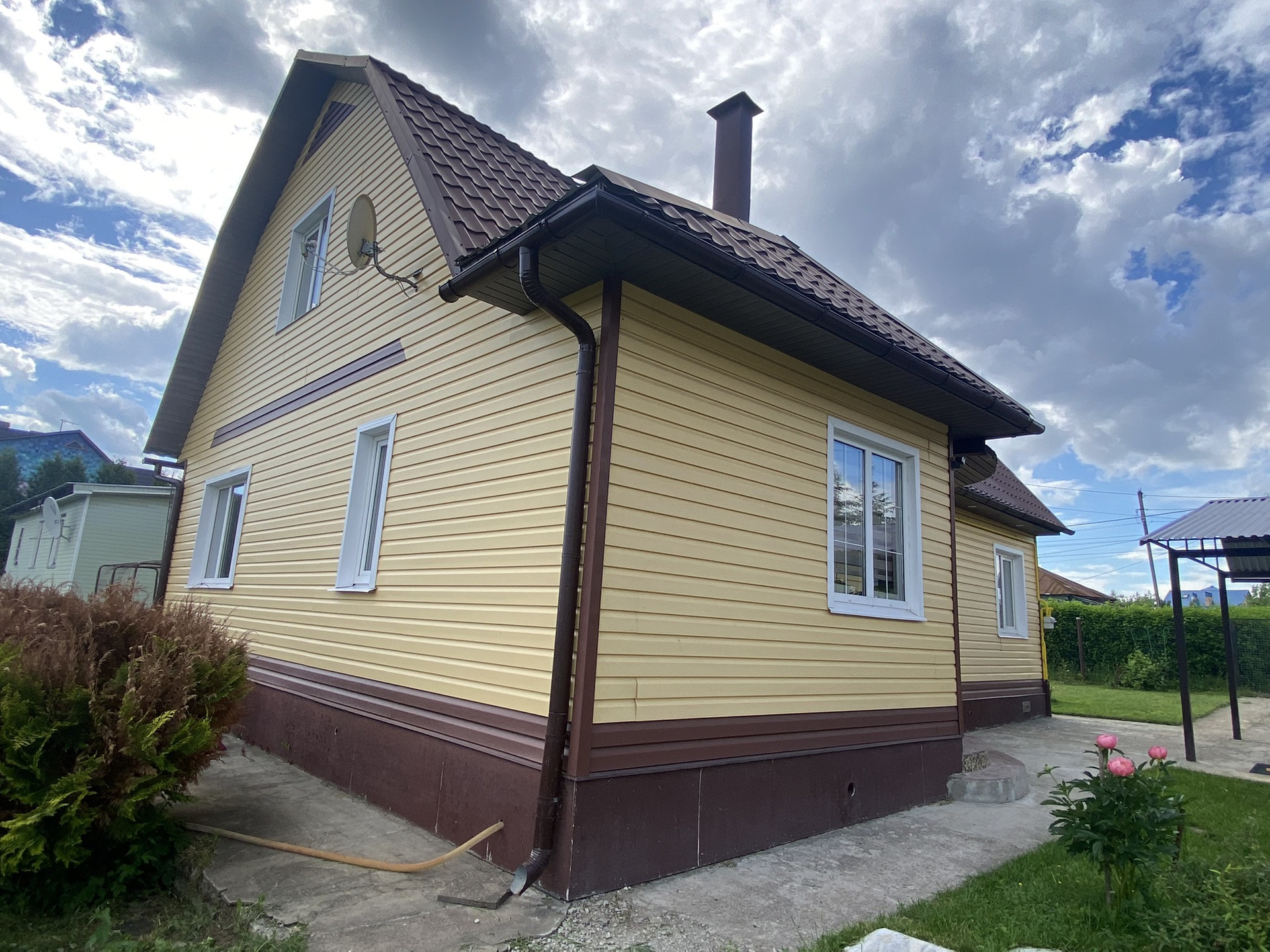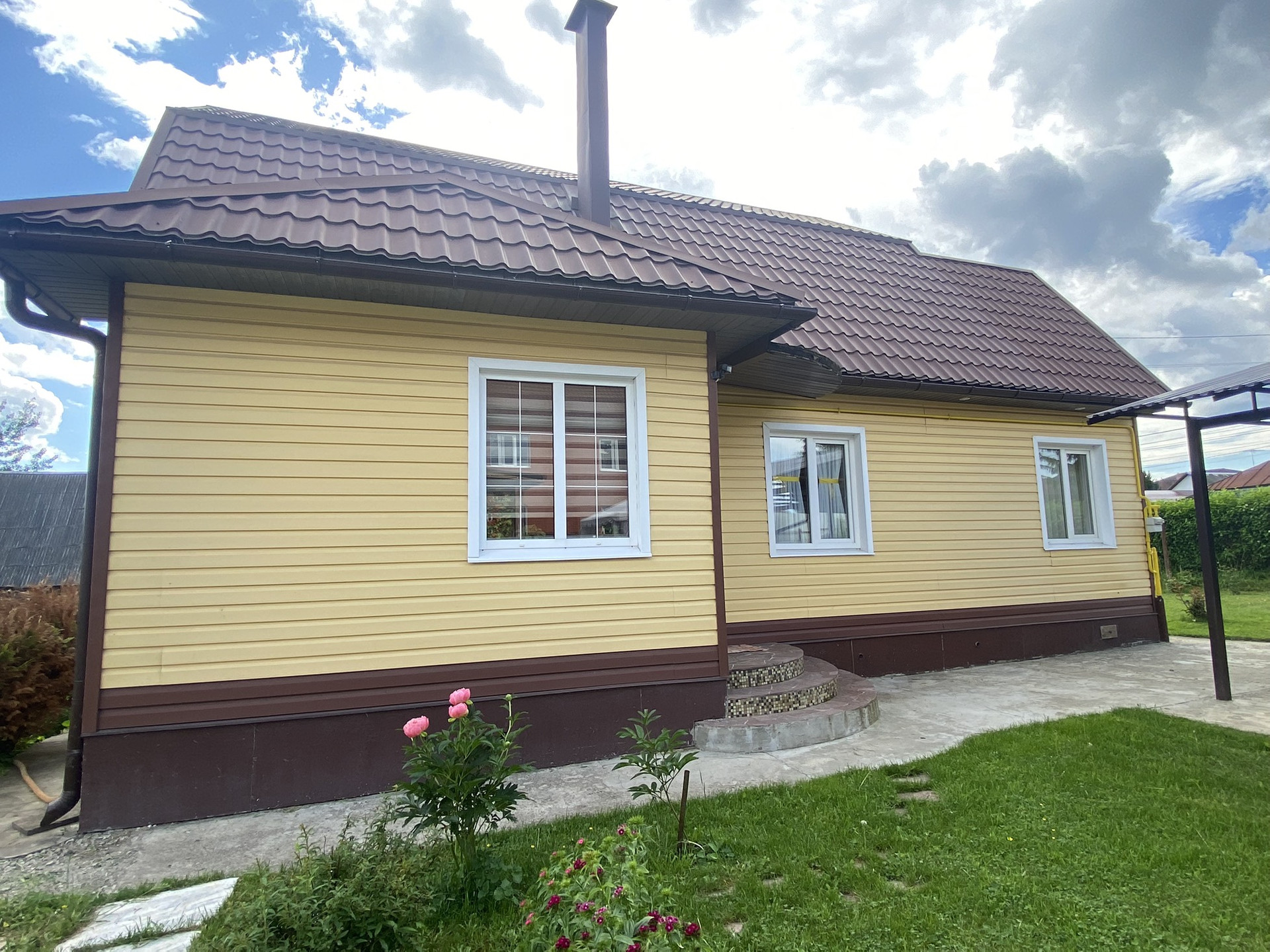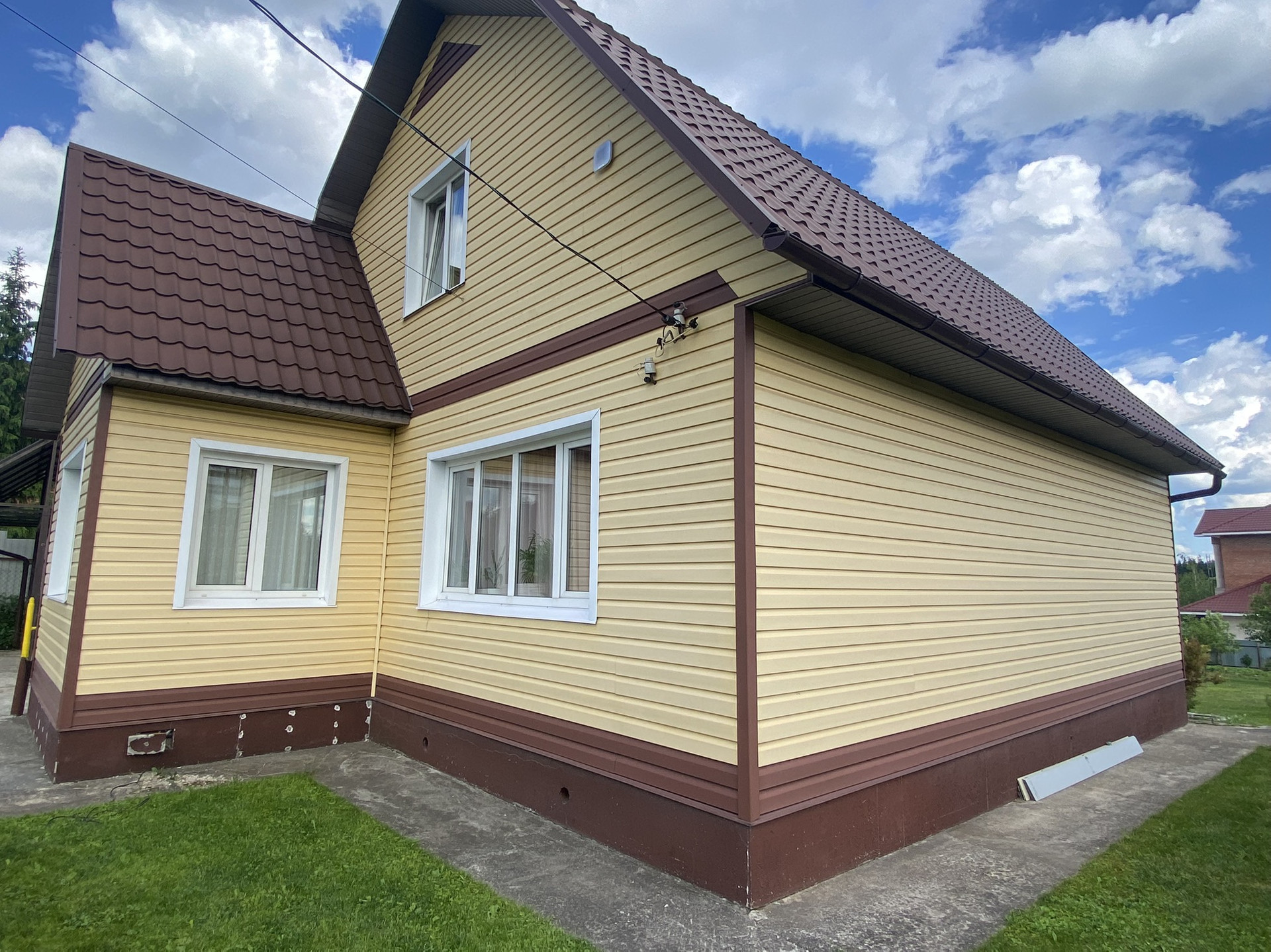 С внешней стороны очень качественный сайдинг. Крыша металлочерепица.