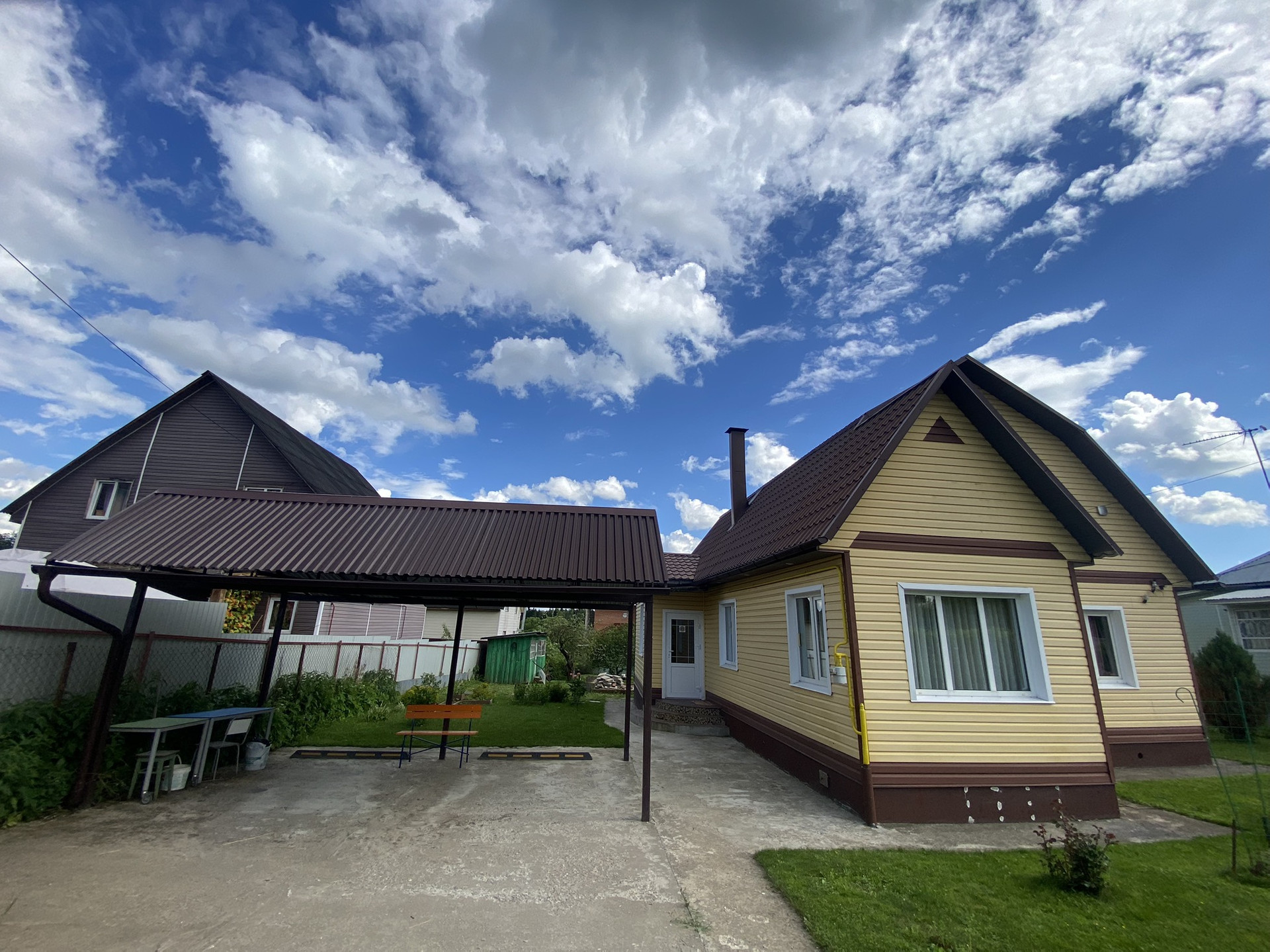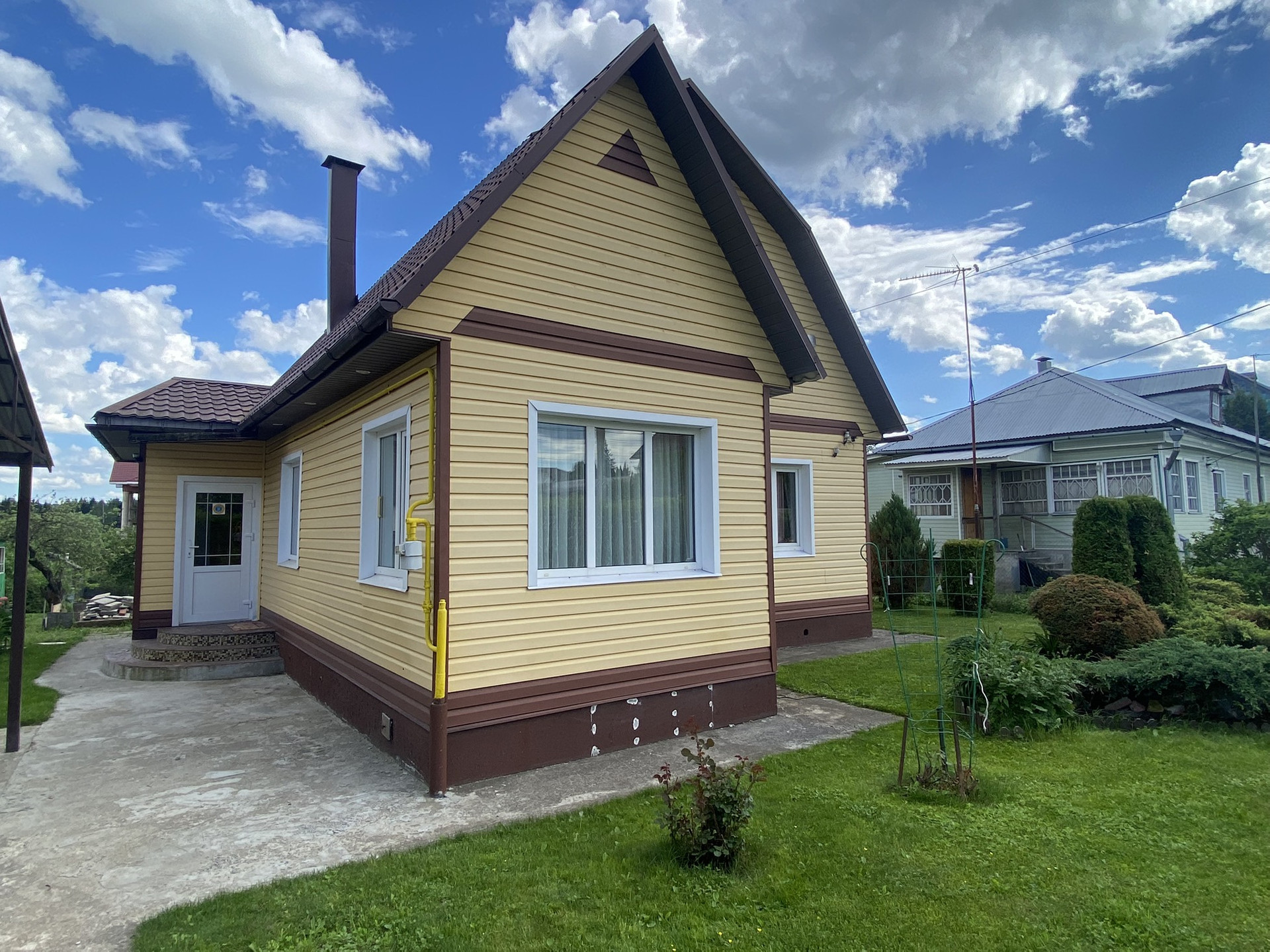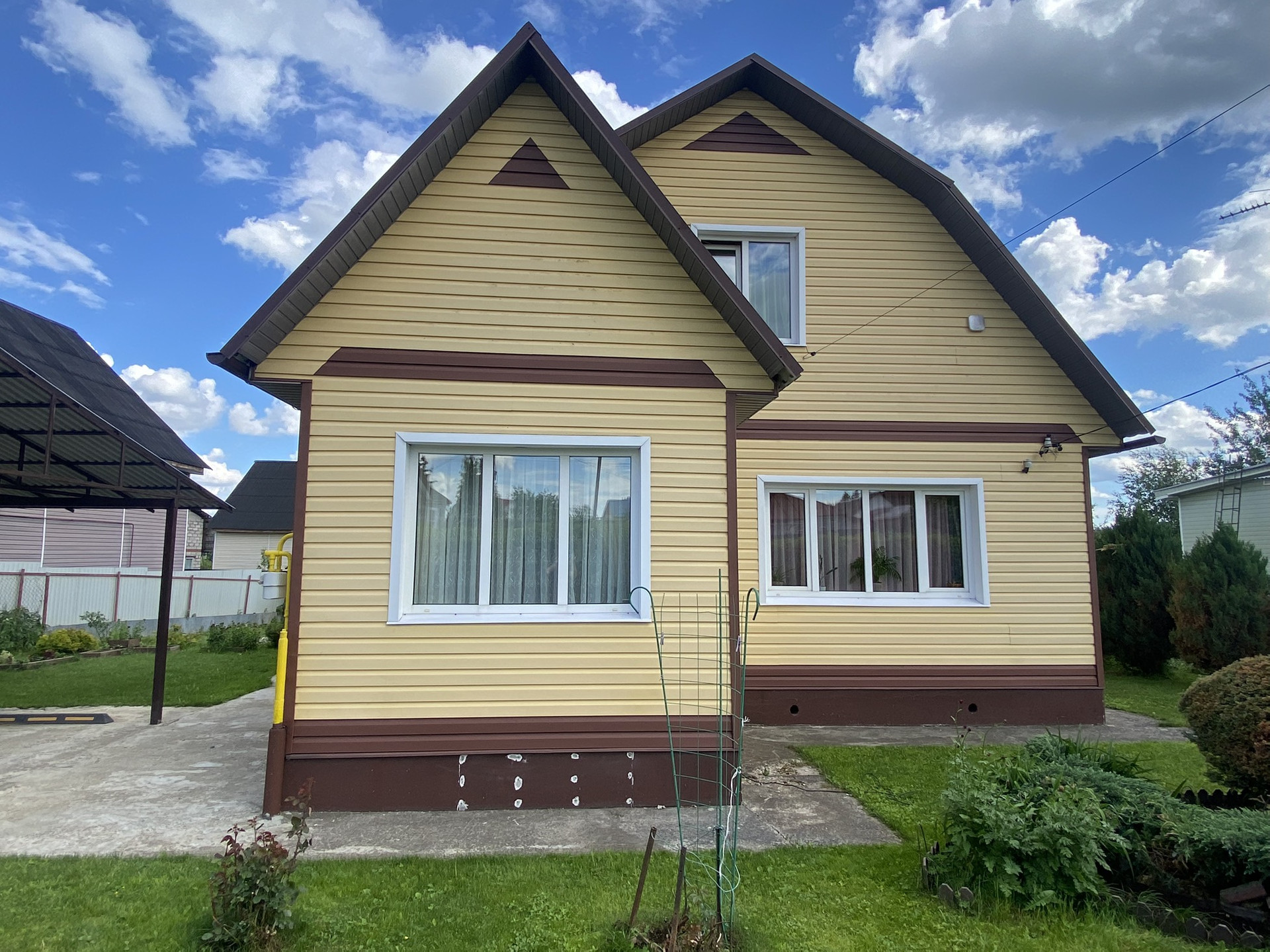 С внешней стороны очень качественный сайдинг. Крыша металлочерепица.
