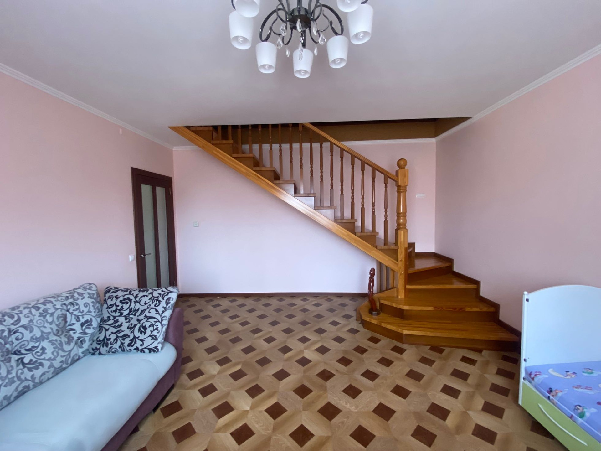 На первом этаже: крыльцо 2,9+2,1 кв.м, коридор 4,1 кв.м., совмещенный санузел 4 кв.м, кухня 12.3+6 кв.м, спальня 14,2 кв.м, гостиная 21.3 кв.м, из гостиной лестница на второй этаж.