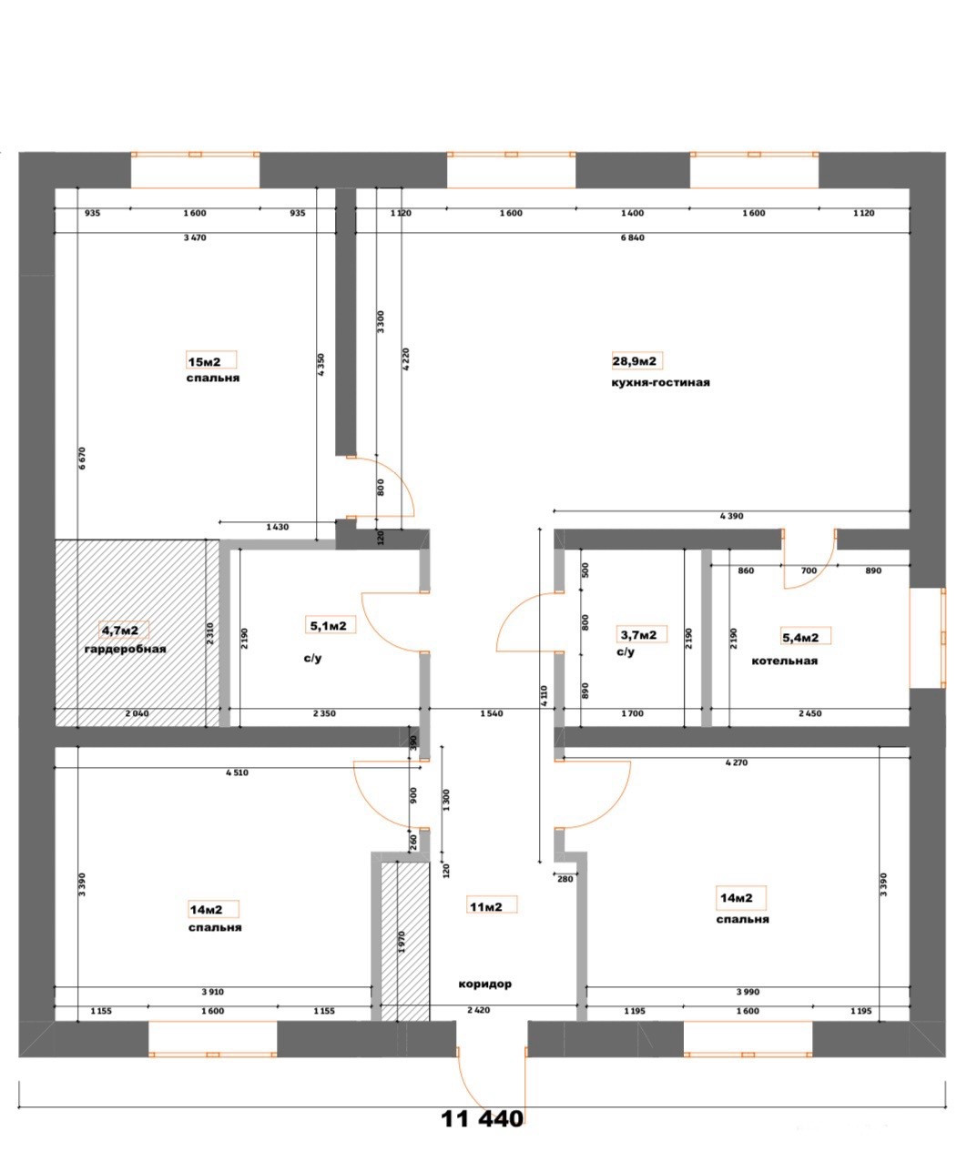 Большая кухня—гостиная 29 м кВ , 3 изолированные комнаты (14/14/15  кВ), гардеробная, совмещенный санузел , отдельный санузел , бойлерная , крыльцо ,