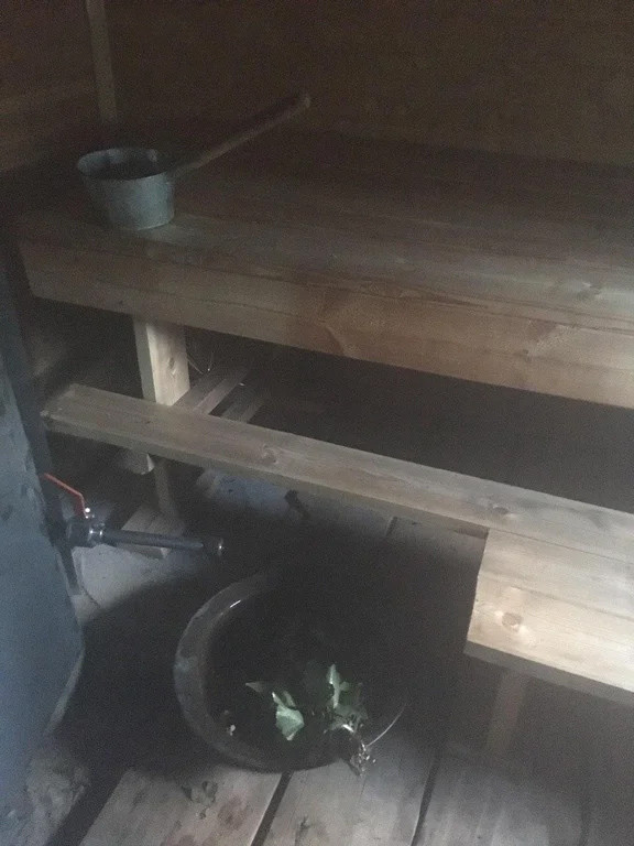 Баня сделана из брёвен, обшита белым сайдингом снаружи. Внутри баня обшита вагонкой. Второй этаж пригоден для проживания (там находится кровать).