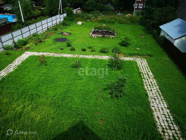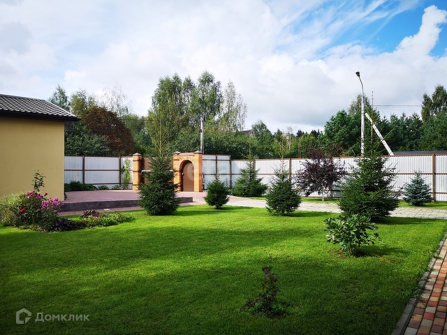 По периметру участка металлический забор из профлиста. На участке сделаны площадки и дорожки, выложенные брусчаткой и плиткой; большая часть - газоны/лужайки, 7-летние деревья (груши, яблони) и кустарники (смородина, крыжовник, жимолость); розы; есть фундамент под баню 4х3м.