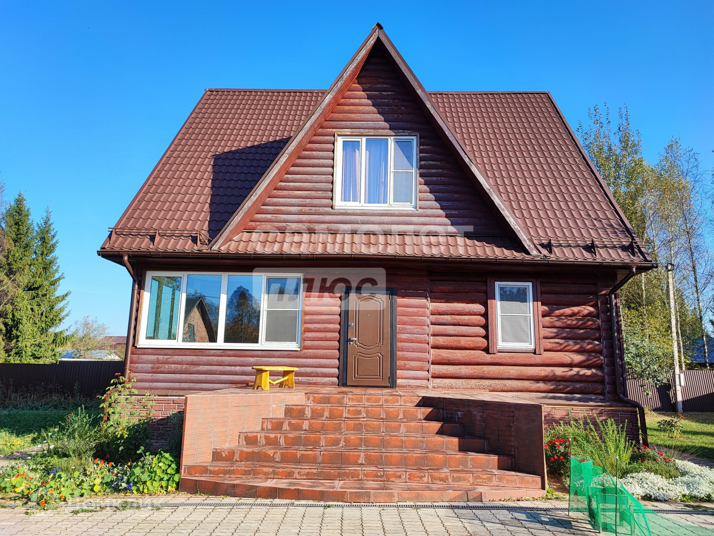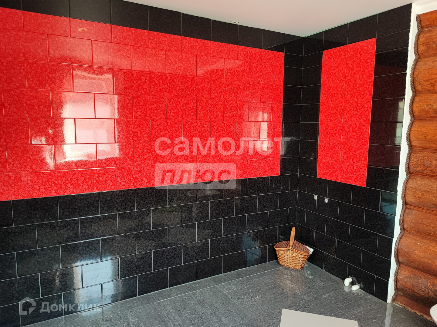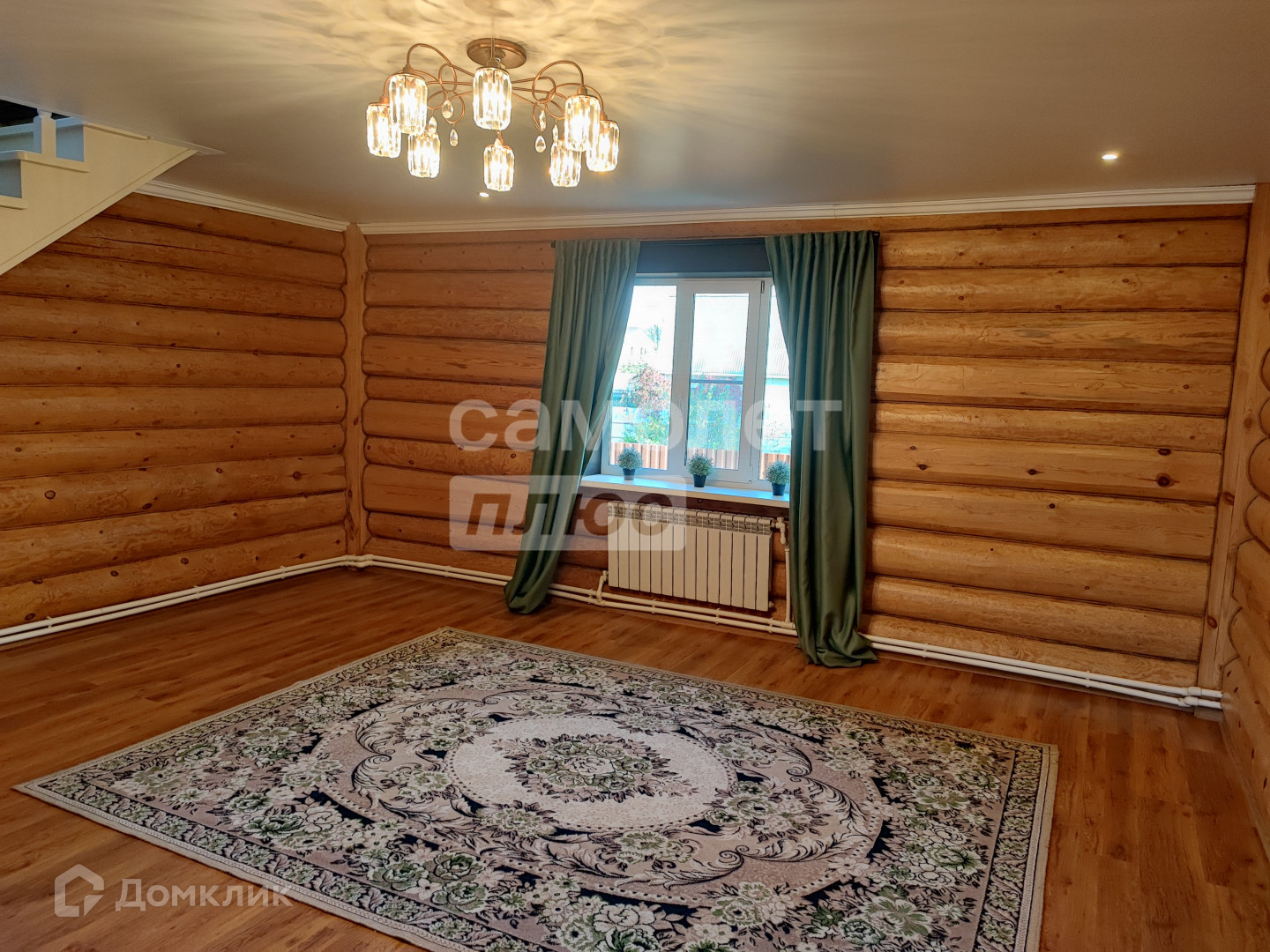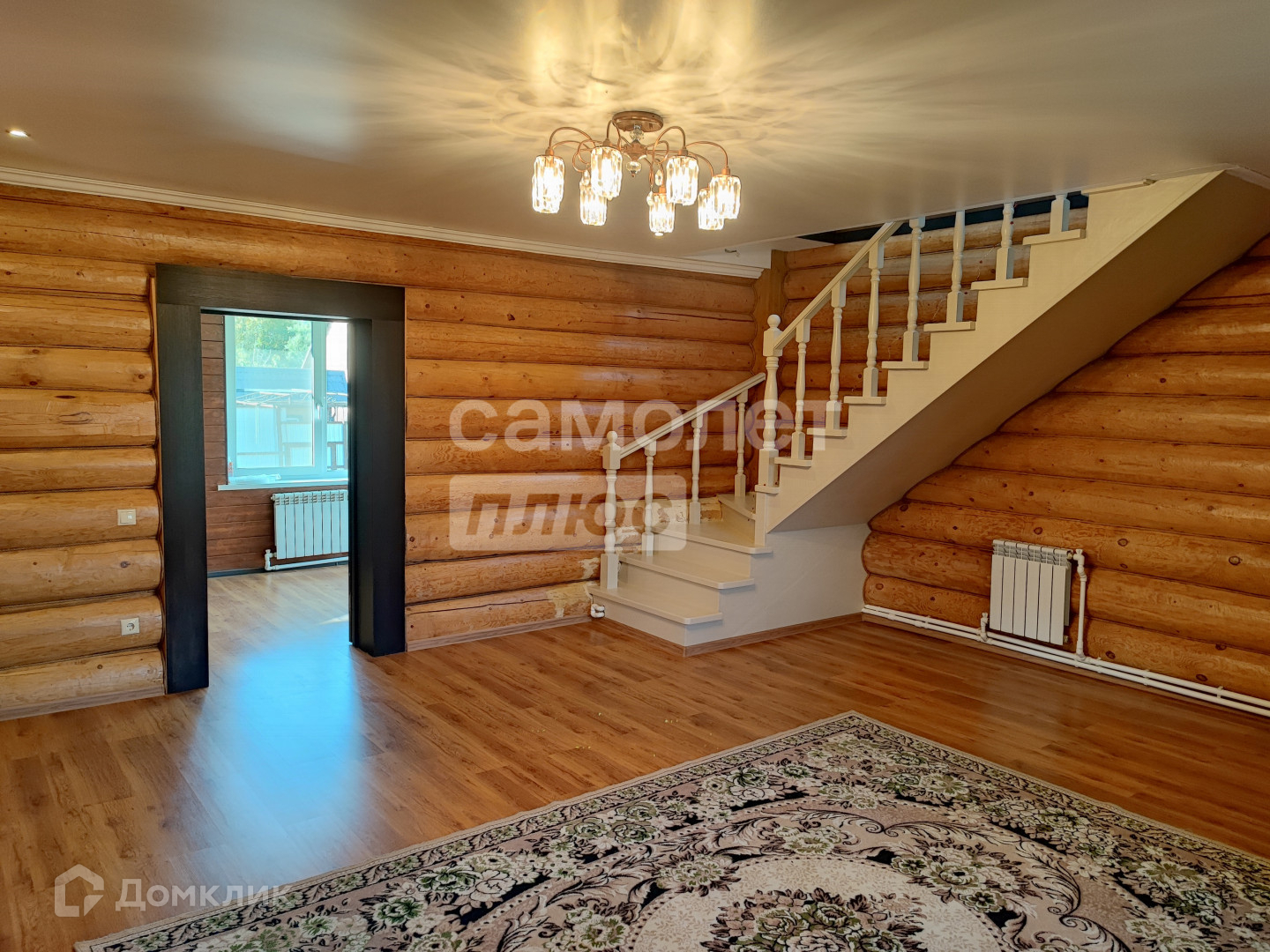 - 1 этаж: прихожая, большой санузел 12,3 кв.м, гостиная с деревянной лестницей на 2ой этаж, кухня; материалы: бревенчатые стены, пол - ламинат