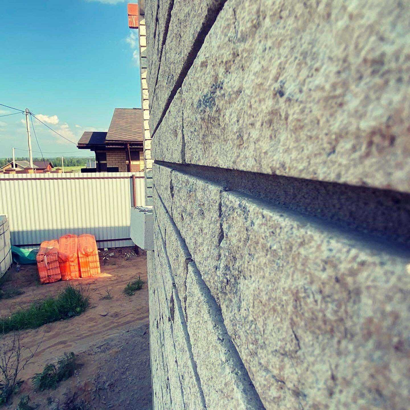Стены - газоблок на 300 мм +облицовка "рваный" кирпич серый.