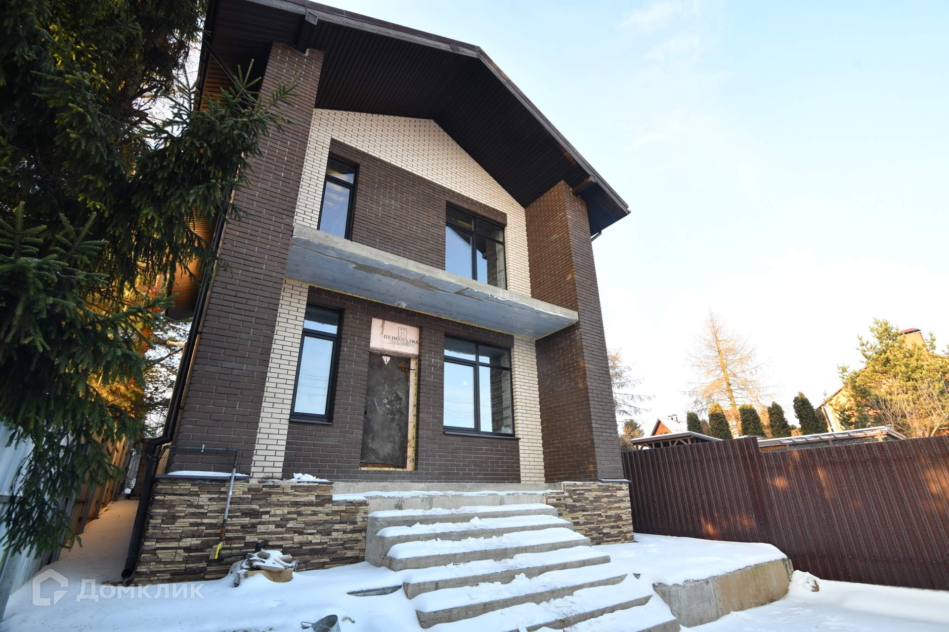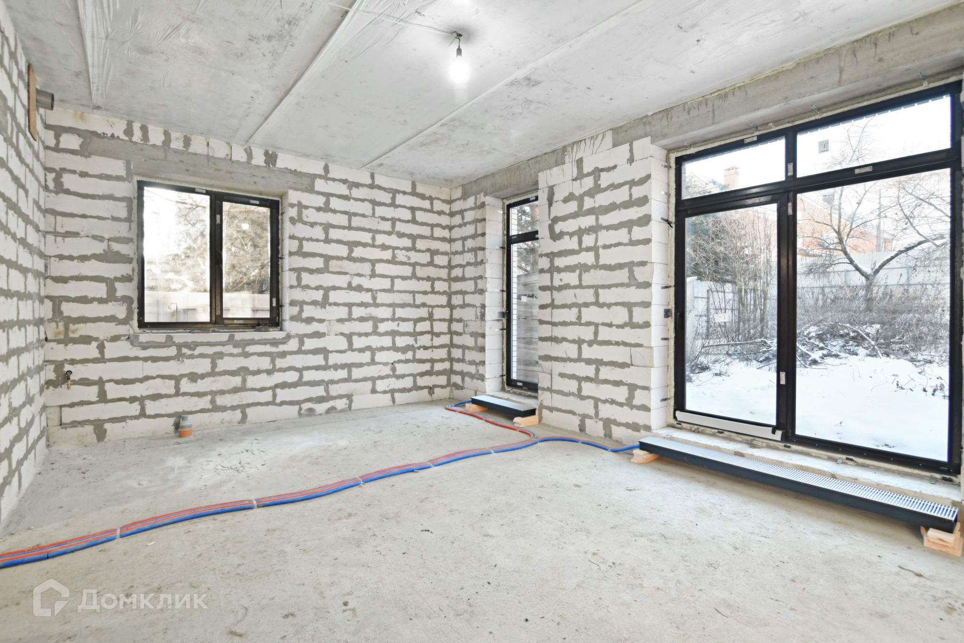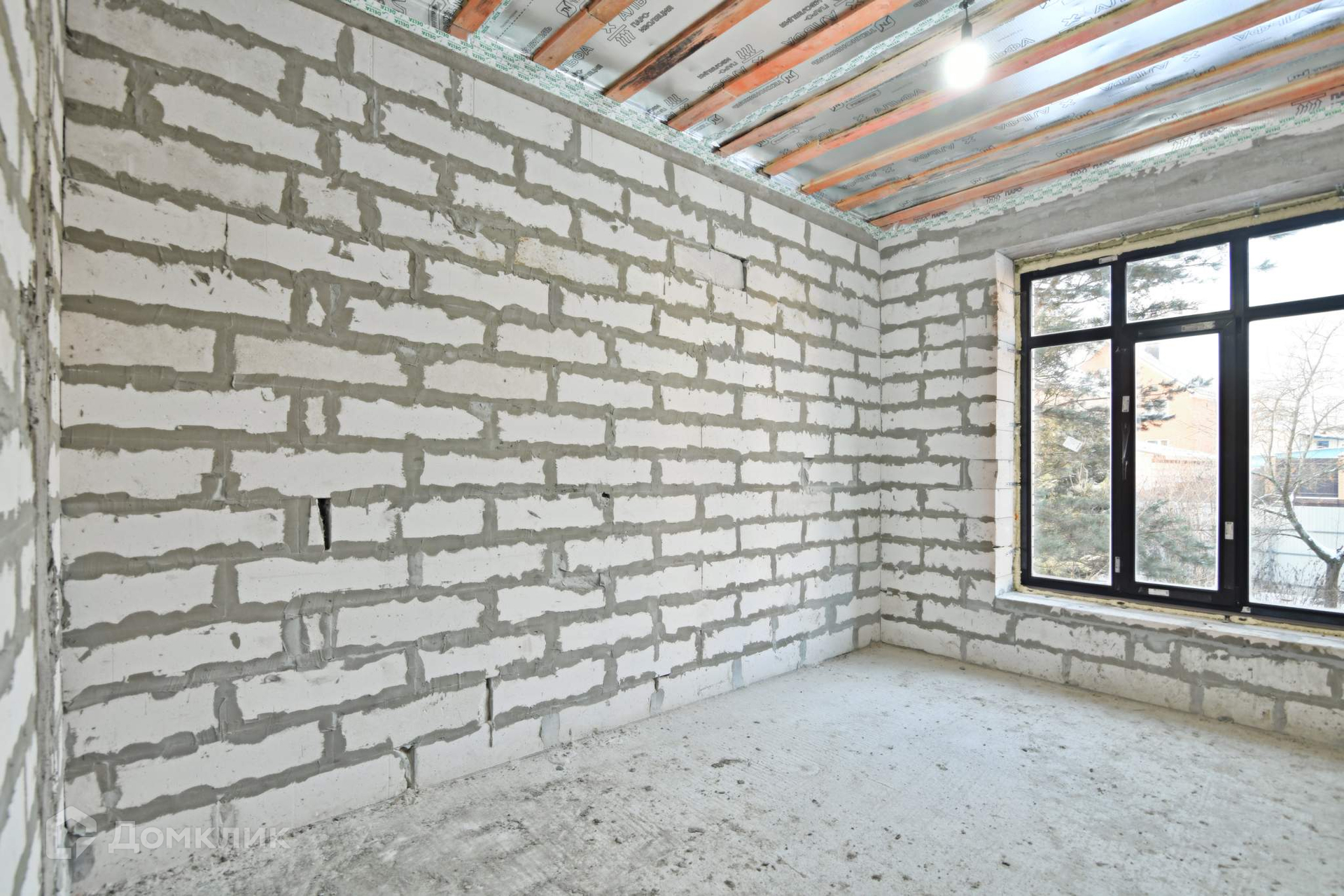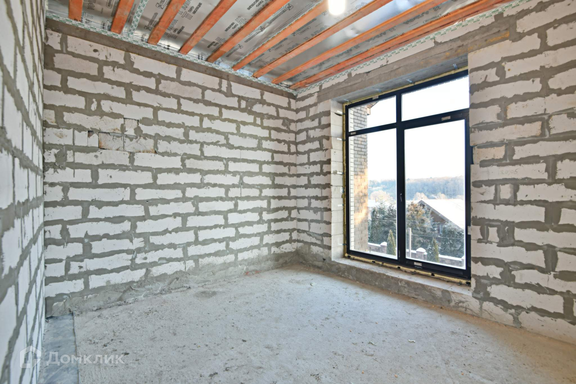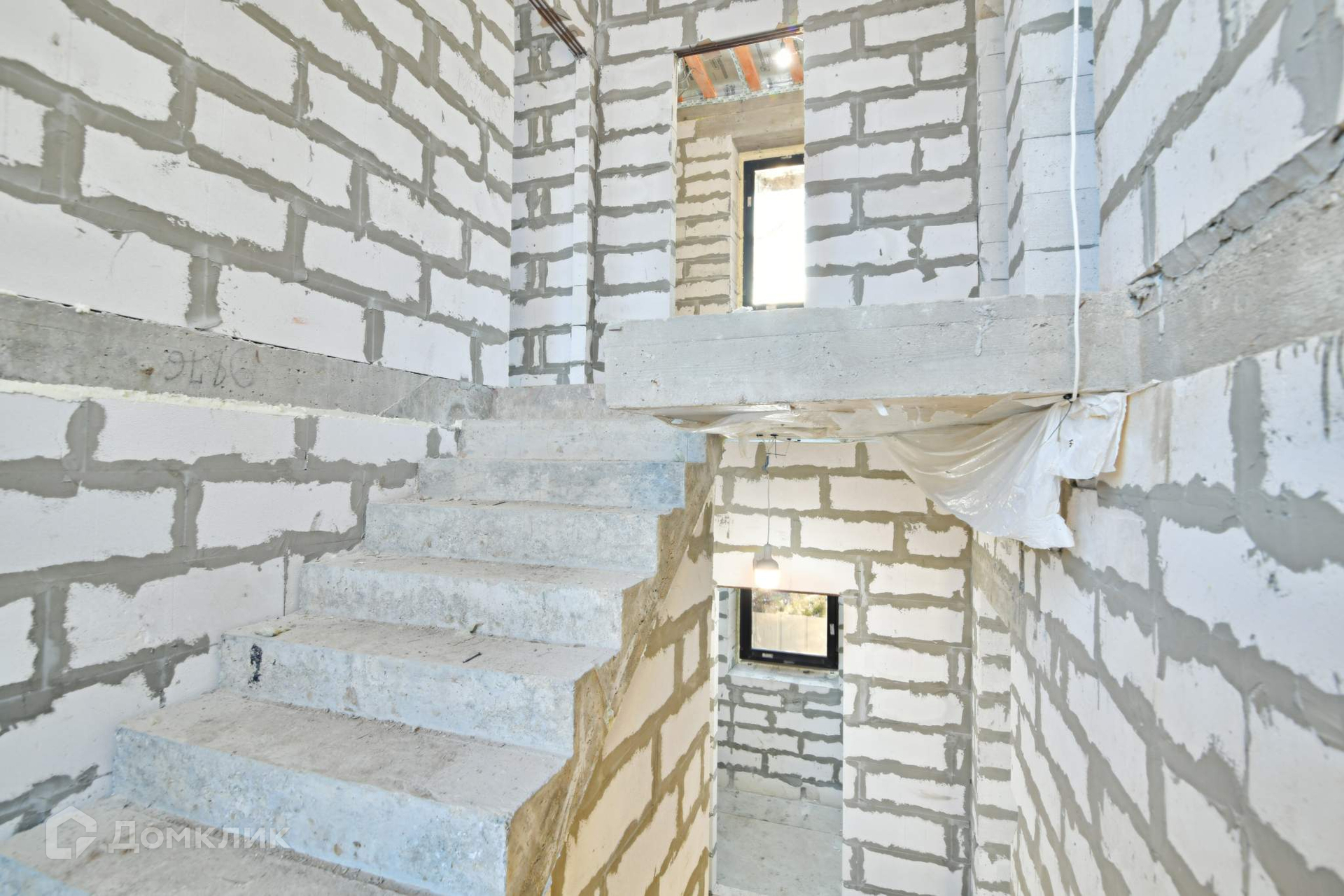 Стены дома построены из автоклавного газобетона толщиной 300 мм. + утеплитель базальтовая вата 100 мм. + облицовочный кирпич. Общая толщина стен 550 мм., дом энергоэффективный. Это не каркасник с фанерными стенами, а капитальное здание с перекрытием из железобетона. Межэтажная лестница также из железобетона - ничего не будет скрипеть. Панорамные окна в пол дают много пространства и света. Высота потолков 3.2 метра.