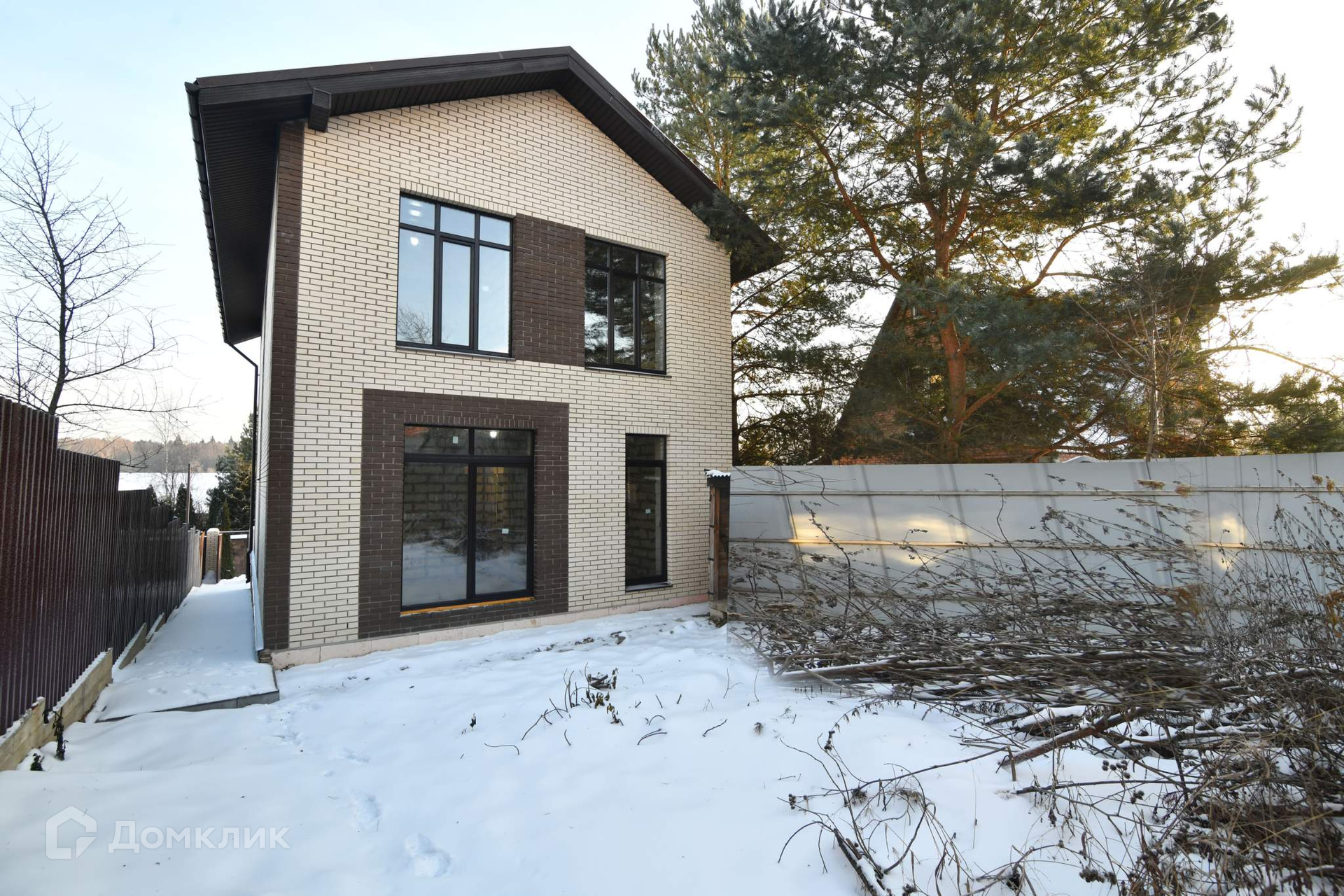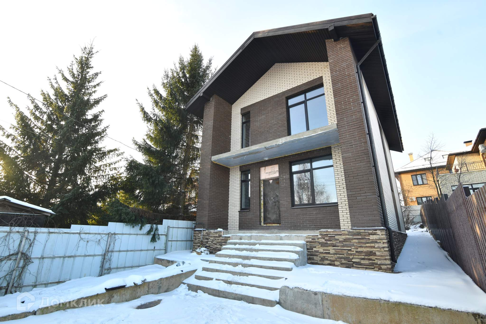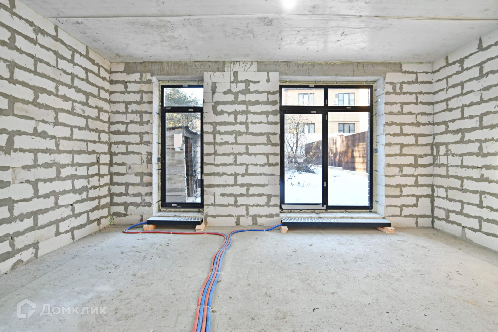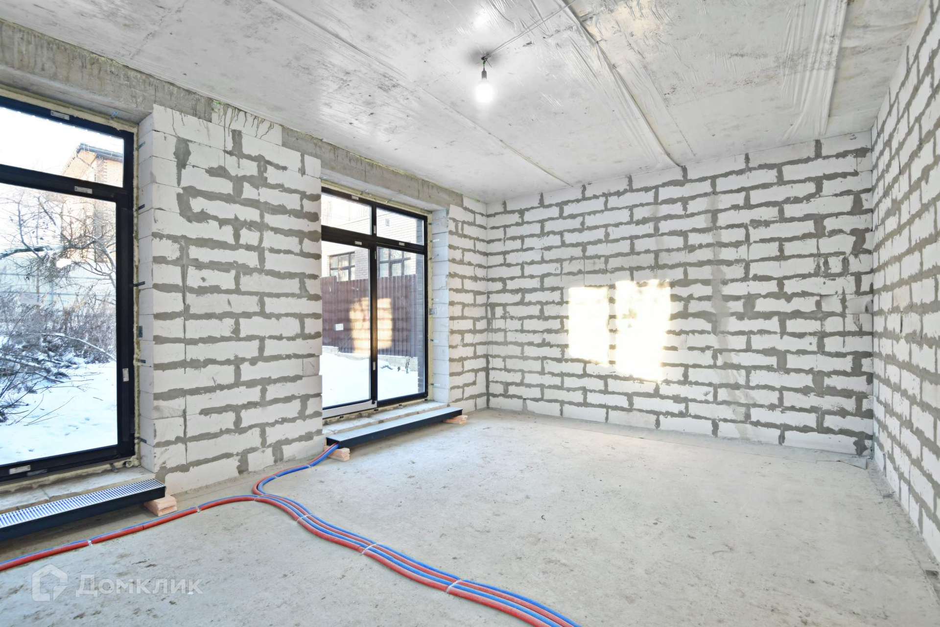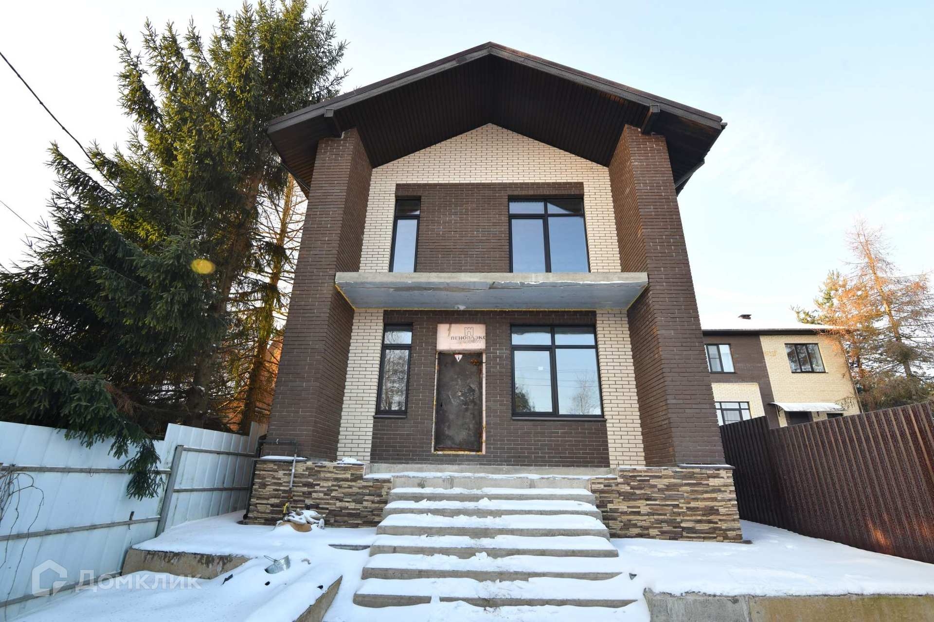 Стены дома построены из автоклавного газобетона толщиной 300 мм. + утеплитель базальтовая вата 100 мм. + облицовочный кирпич. Общая толщина стен 550 мм., дом энергоэффективный. Это не каркасник с фанерными стенами, а капитальное здание с перекрытием из железобетона. Межэтажная лестница также из железобетона - ничего не будет скрипеть. Панорамные окна в пол дают много пространства и света. Высота потолков 3.2 метра.