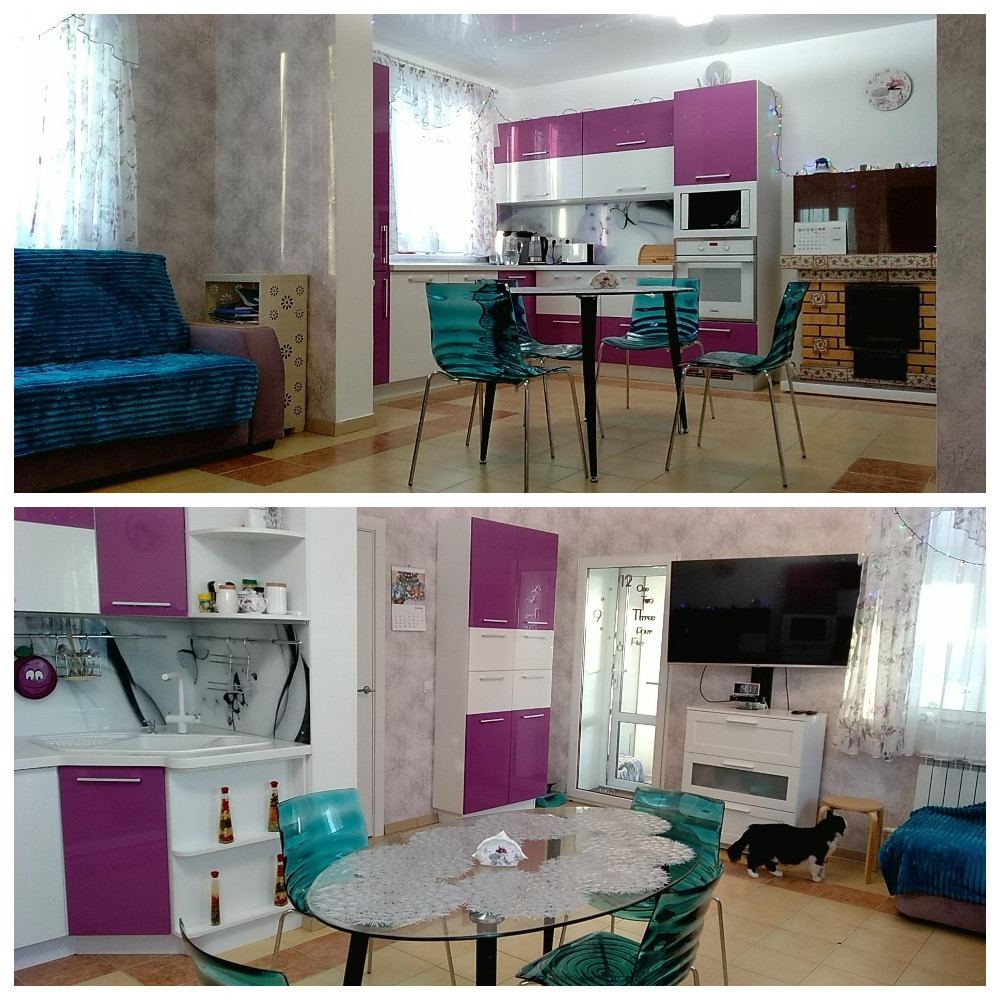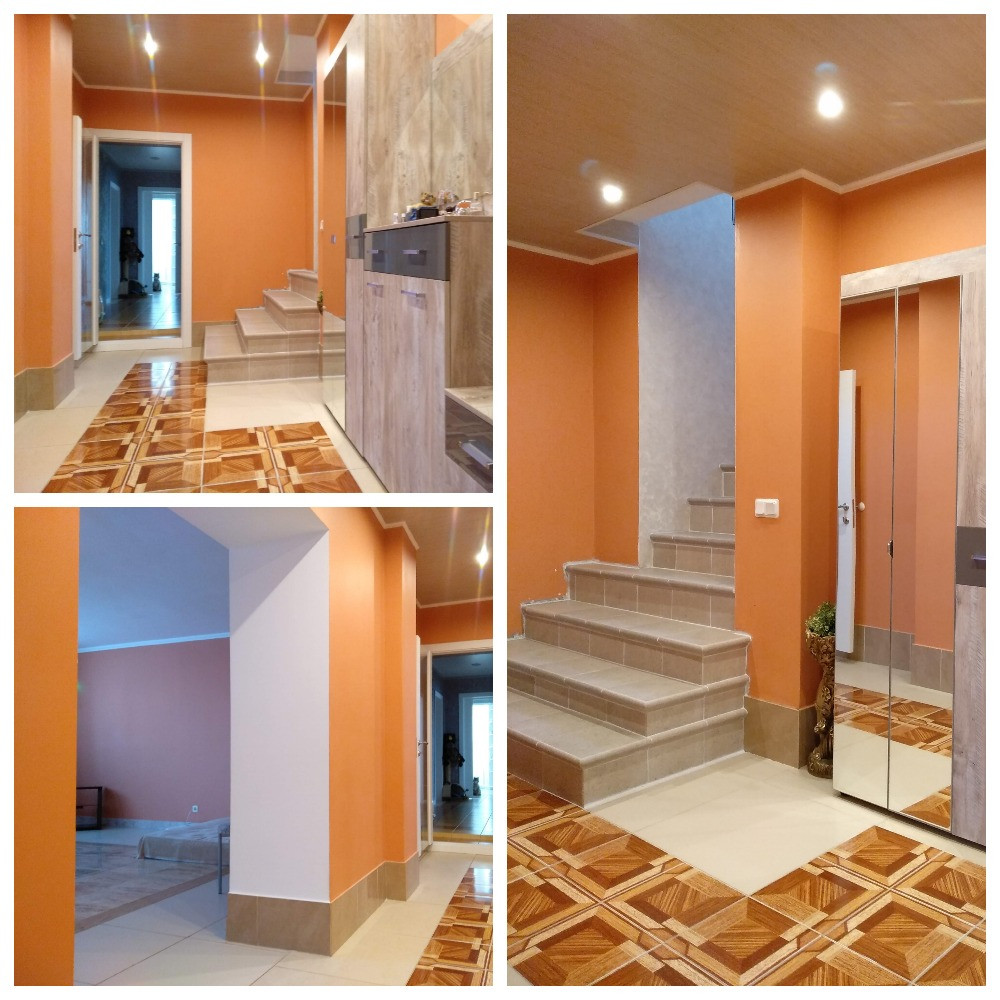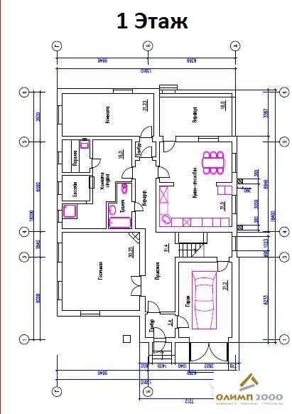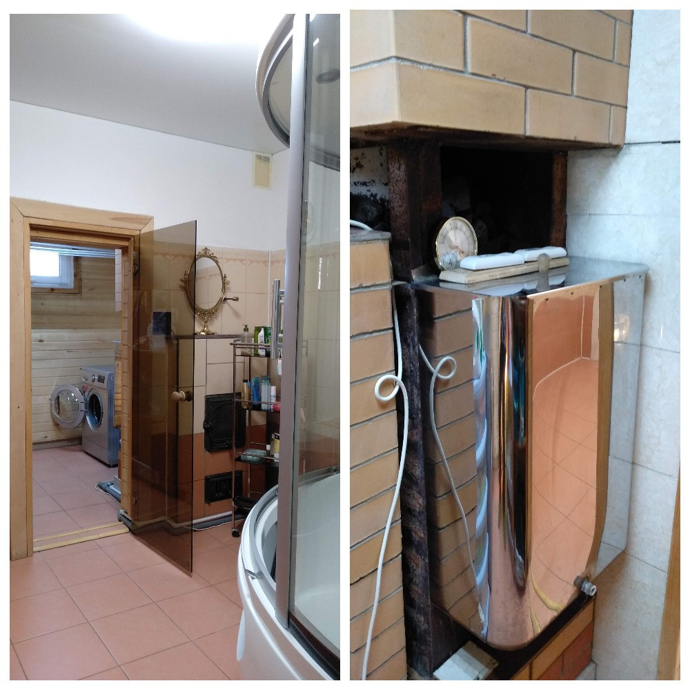 1 этаж – Прихожая, Гараж + котельная (под ними погреб), Коридор, Большая комната, Санузел, Помещение с Баней, Бассейном, Душевой и Комбинированной душевой парной, Комната спальня, Кухня-гостиная с Печью-камином. Закрытая веранда с выходом на участок. На 1 этаже – водяные теплые полы и радиаторы.