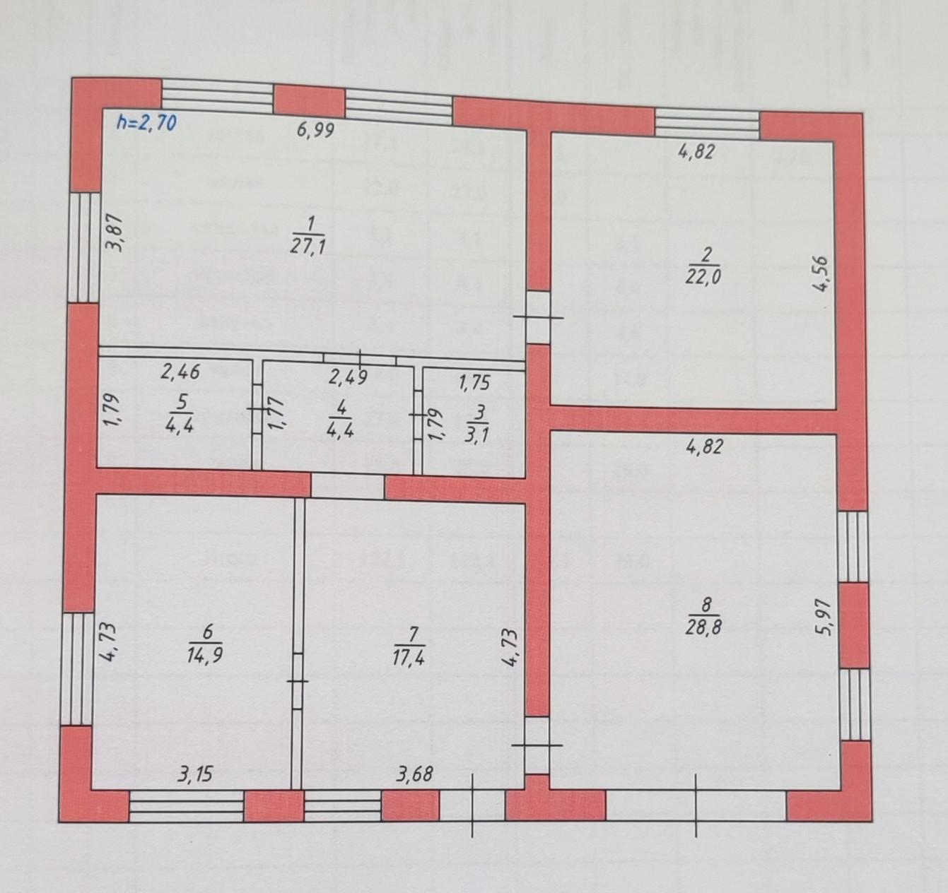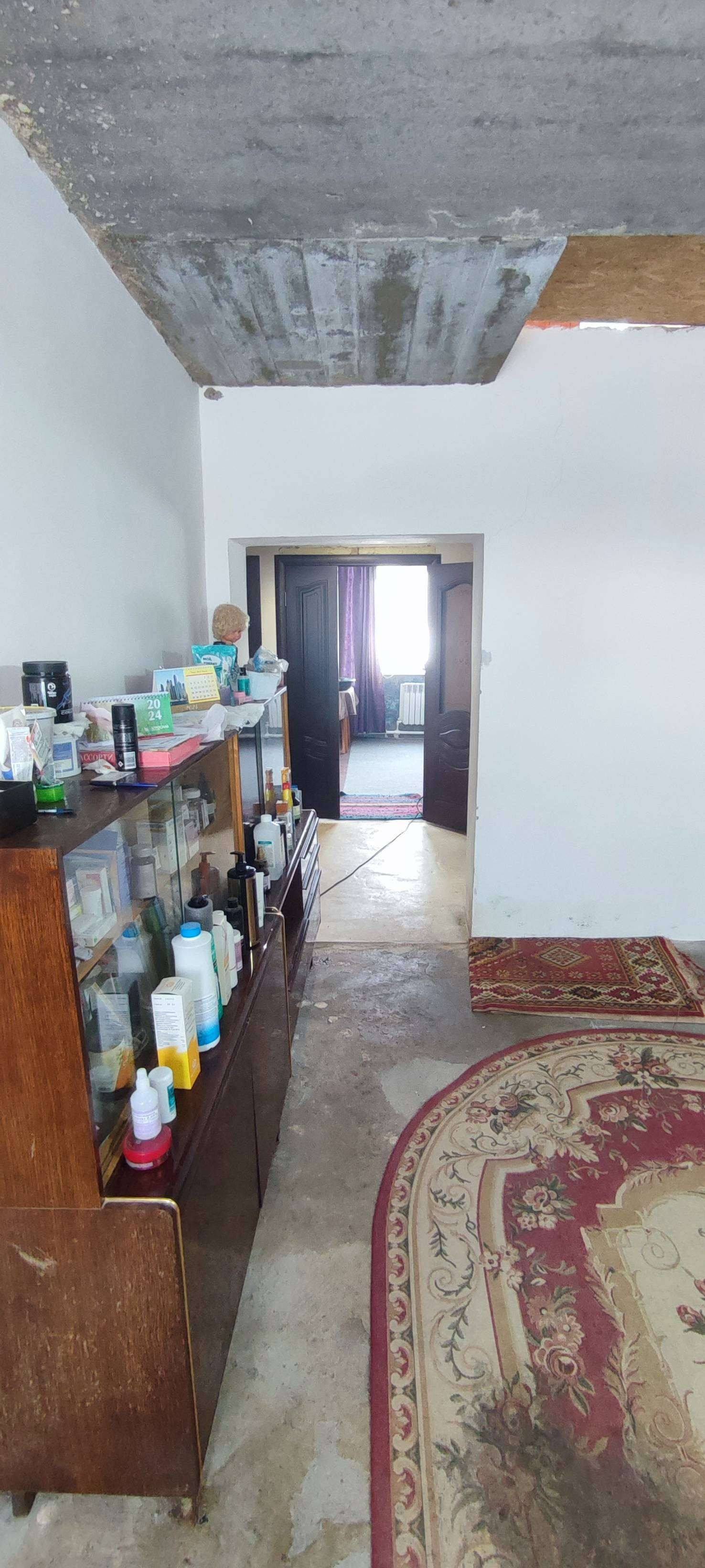 Первый этаж: кухня – 14,9 кв.м., с/у – 4,4 кв. м., гардеробная – 3,1 кв.м., гостиная комната – 27,1 кв.м., спальня – 22 кв.м., коридор - 4,4 кв.м, просторная прихожая 17,4 кв.м, гараж – 28,8 кв.м.. В спальне и гостиной оклеены обои, натяжной потолок, с/у в кафеле.