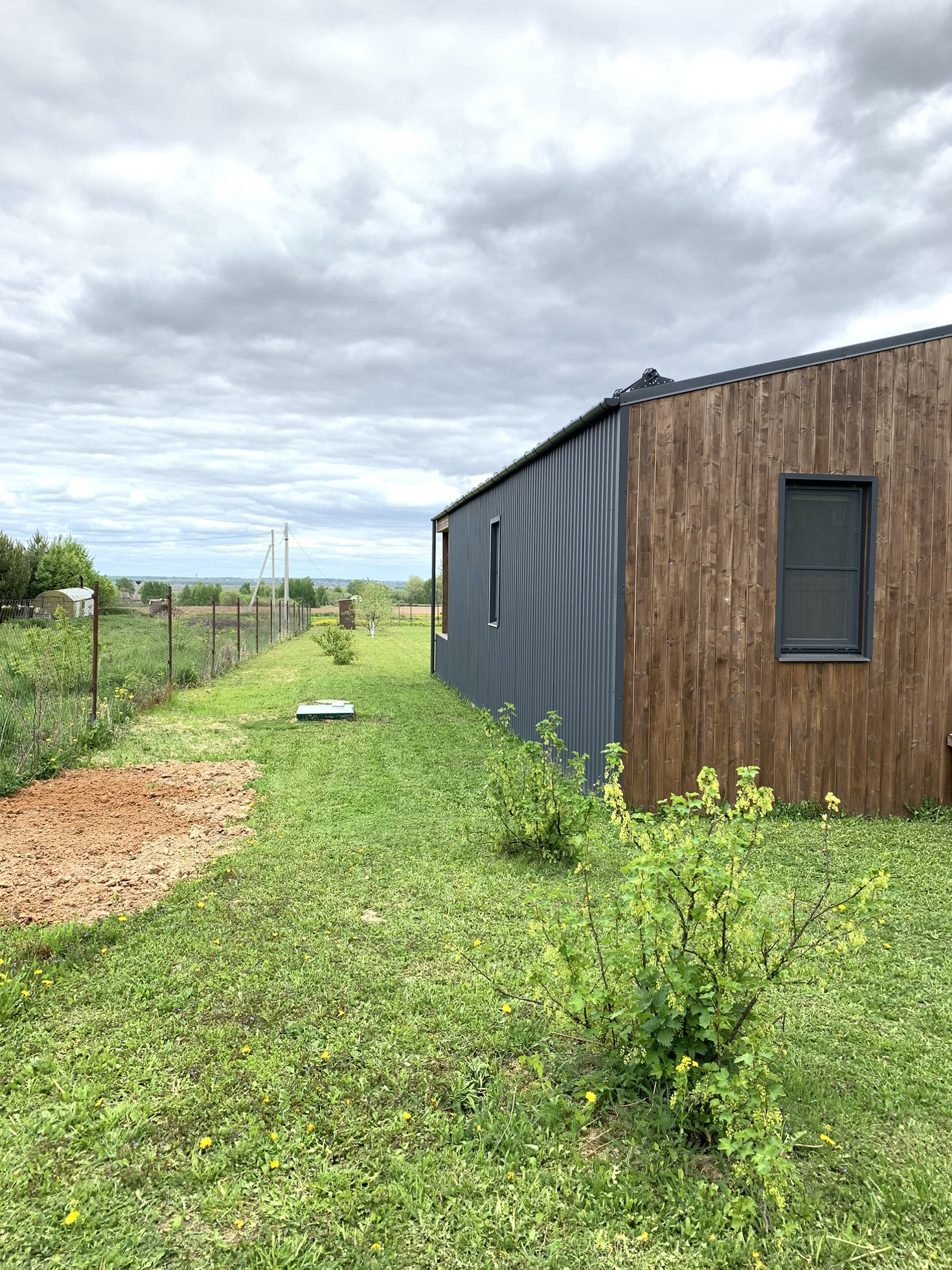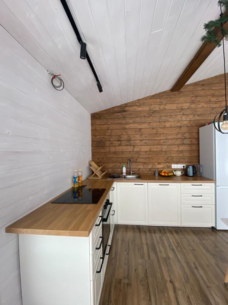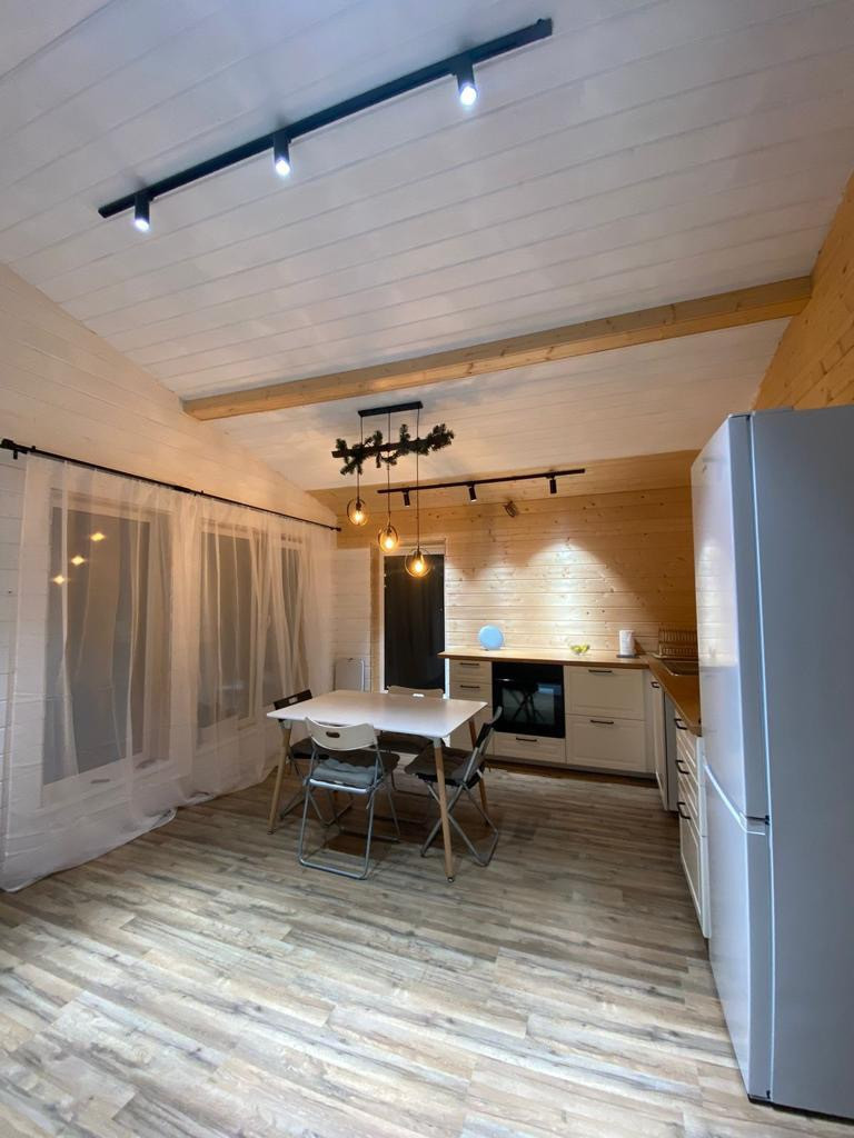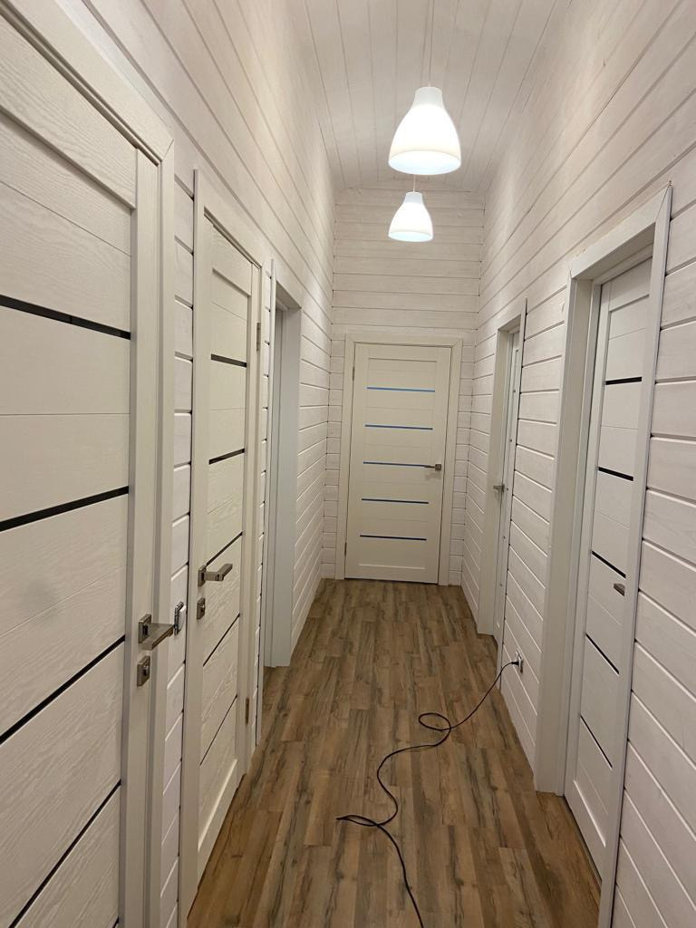 Сам дом одноэтажный, пятно застройки 8х12м, тамбур, три раздельные спальник 12х12х10кв.м., раздельный санузел, кладовая, бойлерная, большая гостинная 28кв.м. Отделка внутри имитация бруса. Отопление электрическое, конвекторы керамические, стоят датчики температуры, поделено на три зоны, чтобы регулировать отдельно, и в каждом помещении терморегуляторы для индивидуальной регулировки температуры. В доме всегда поддерживается плюсовая температура, зимой +5гр., за сутки до приезда, прибавляем до 24гр. Этой зимой мороз 30-33гр. был не проблемой. Вся техника: холодильник, плита индукция, духовка, посудомойка. Кухня ИКЕА, успели заказать) Стоит бойлер на 80литров, автоматика на воде и три фильтра. Колодец 14 колец. Биосептик и слив на три с половиной кольца. На участке плодовые деревья и кустарники: 2шт. сливы, 2шт. яблони, 1шт. груша, смородина, жимолость, клубника, все плодоносит. Посадили на участве перед домом туи, за участком в сторону поля елки. На участке бытовка 15кв.м. для садового инвентаря.