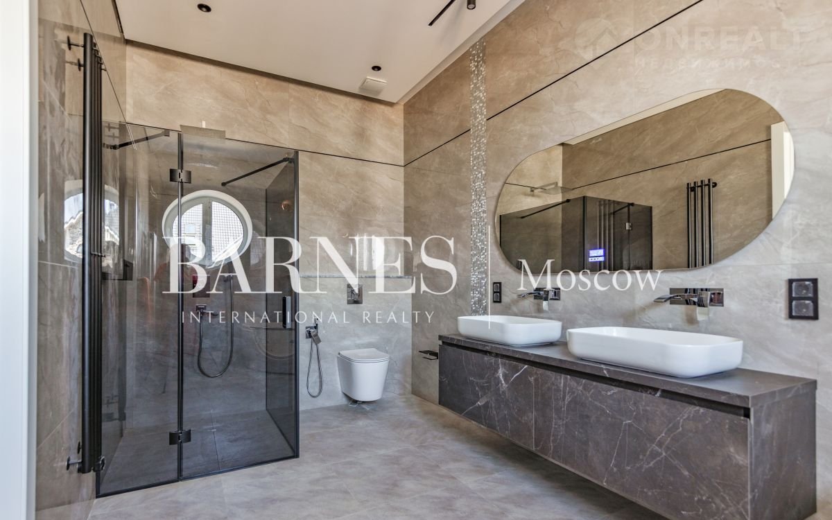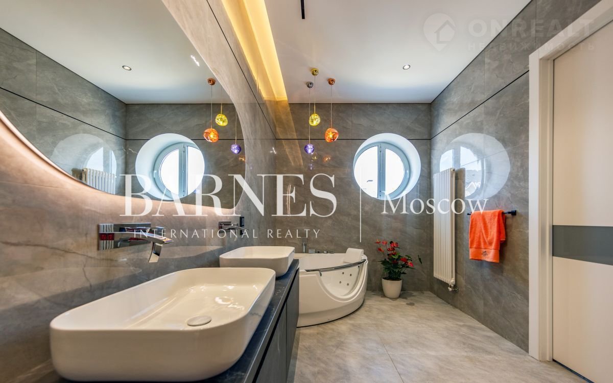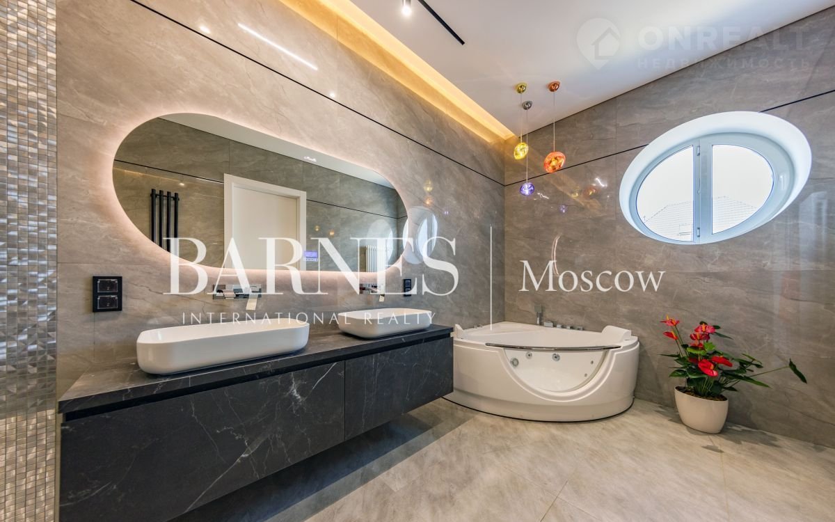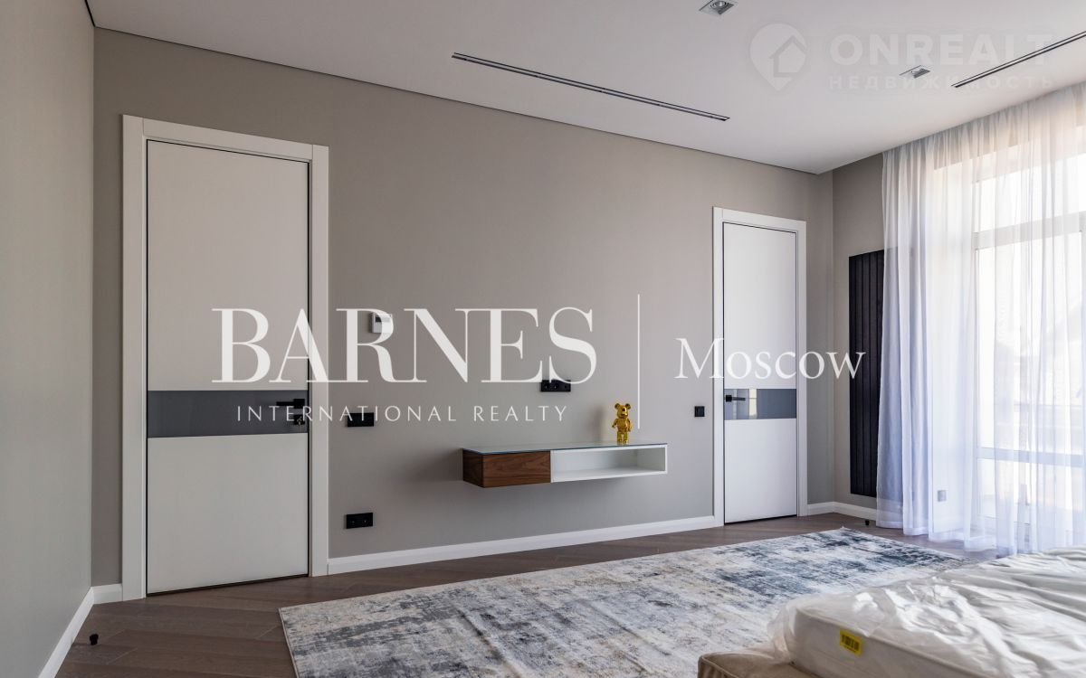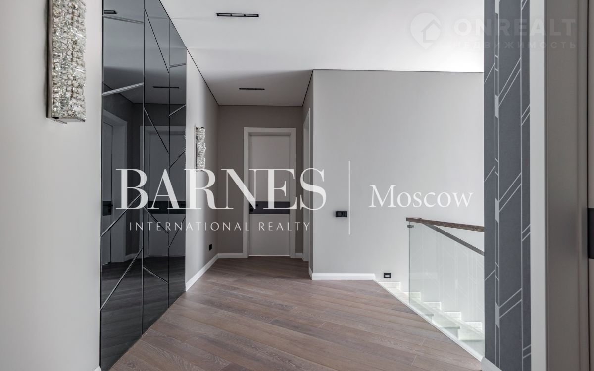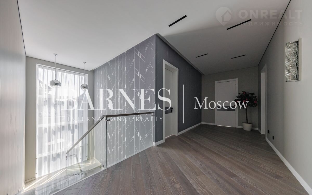 2 этаж (195 кв.м.): Холл и лестничный проем освещается большим окном h 6 м.; Мастер спальня 60 кв. м: спальня 27 кв.м. с выходом на балкон (ограждение балкона двойным стекло), Гардероб 19 кв.м., установлена гардеробная от студии Giuliа Nоvаrs; Ванная комната с окном 12,5 кв. м., просторная душевая, угловая ванна с массажем пр. В&W, каменная тумба - столешница на две раковины, подогрев пола. Сантехника - встраиваемая, спальня 31 кв. м. + с/у 7 кв. м. установлена ванна 1800мм; спальня 18,5 кв. м., собственная ванная комната 6 кв. м., гардеробная 5 кв. м.; Кабинет 28,6 кв. м. гардеробная зонирована стеклянной перегородкой; Постирочная с мебелью 10 кв. м установлены стиральная и сушильная машины пр. АSКО.