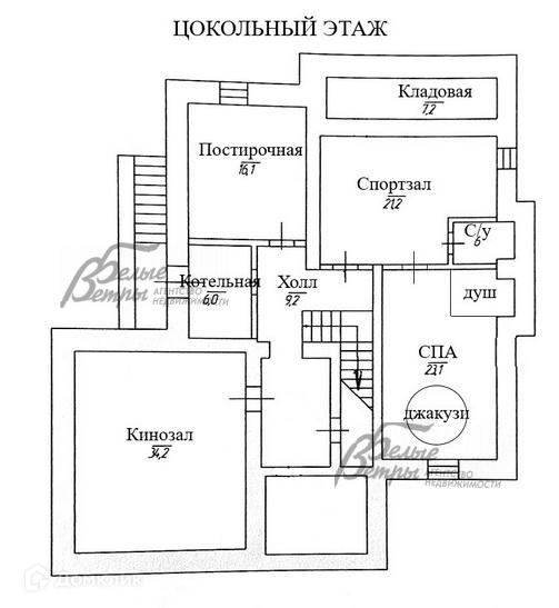 Цокольный этаж: холл 9 кв.м, спортзал 23 кв.м, СПА-джакузи 21 кв.м, санузел, душевая, котельная 6 кв.м, постирочная 16 кв.м, склад 8 кв.м, кинотеатр 34 кв.м..